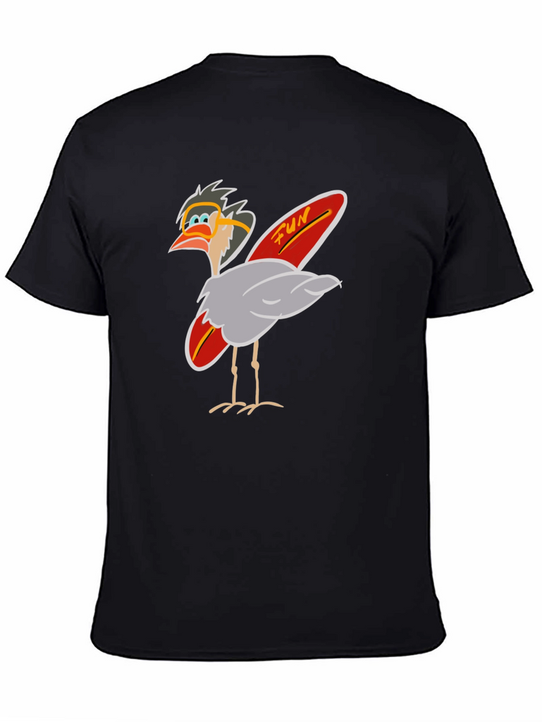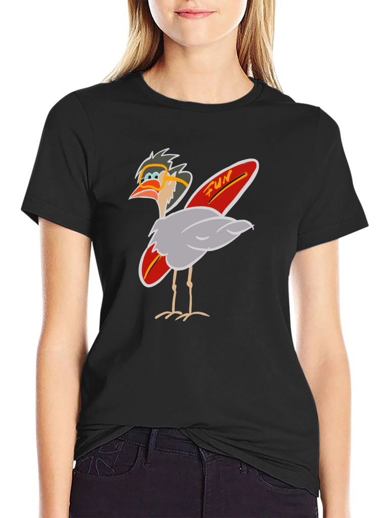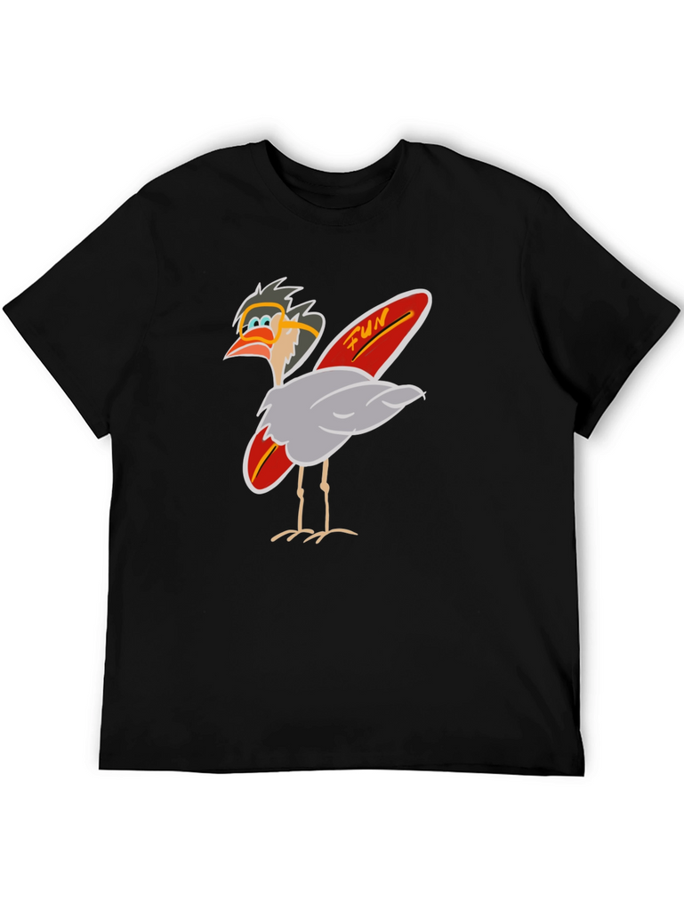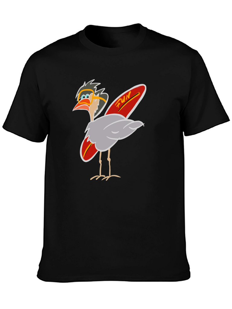 Catch some waves with this unique t-shirt featuring a cool bird sporting sunglasses and a surfboard that says "FUN". The black t-shirt features a screen-printed graphic with bold colors, making it an instant statement piece. Made from comfortable, breathable fabric, this tee is perfect for casual outings, beach trips, or simply showing off your love for quirky style. Pair it with your favorite jeans or shorts for an effortless, laid-back look. Make a statement and turn heads with this whimsical t-shirt.
