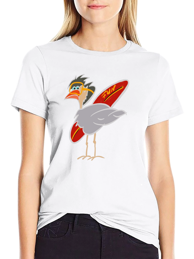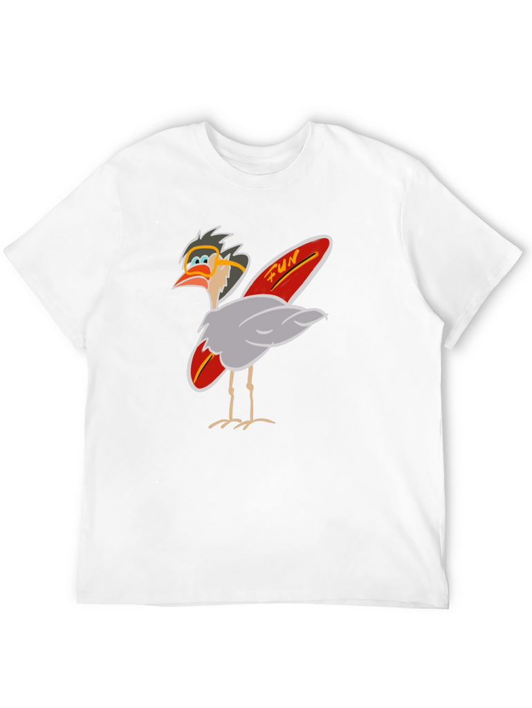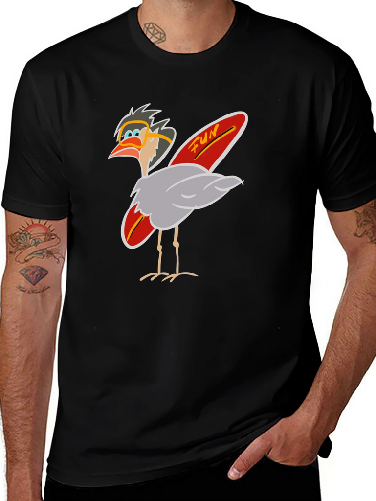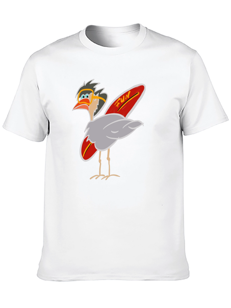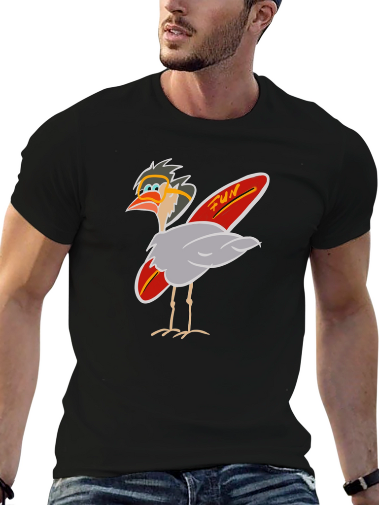 Catch some waves with this unique t-shirt featuring a cool bird sporting sunglasses and a surfboard that says "FUN". The black t-shirt features a screen-printed graphic with bold colors, making it an instant statement piece. Made from comfortable, breathable fabric, this tee is perfect for casual outings, beach trips, or simply showing off your love for quirky style. Pair it with your favorite jeans or shorts for an effortless, laid-back look. Make a statement and turn heads with this whimsical t-shirt.