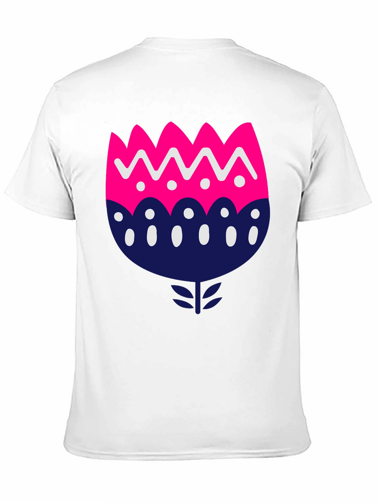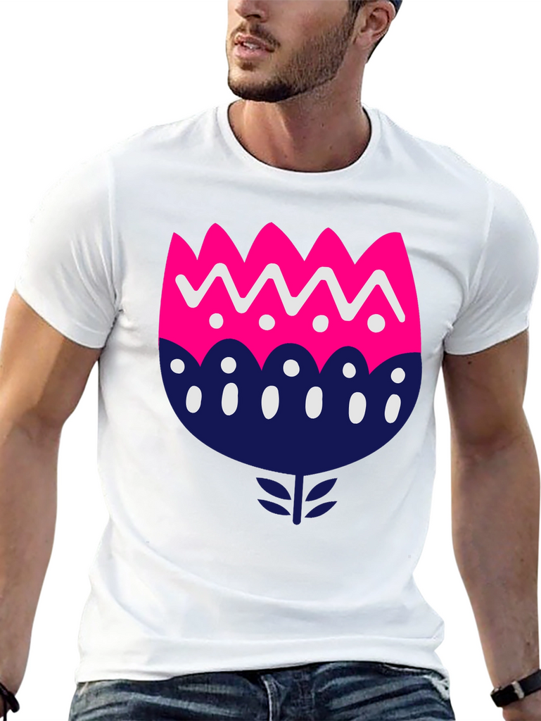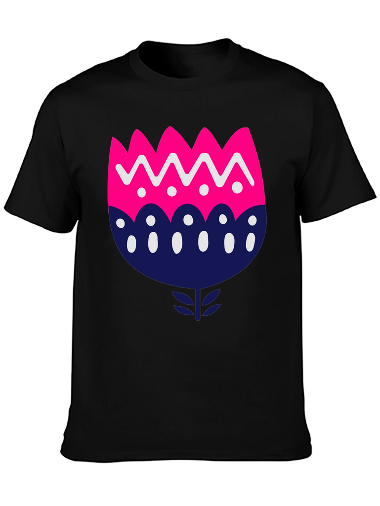 This black t-shirt features a bold and playful floral graphic in vibrant pink and blue. The design incorporates a unique zigzag pattern and stylized dots, giving it a modern, artistic touch. Made from a comfortable, breathable fabric, this shirt is perfect for casual wear and adding a pop of color to your everyday wardrobe. Ideal for expressing your individual style, this eye-catching tee is sure to turn heads. Whether you're out running errands or hanging out with friends, this t-shirt is a fun and fashionable choice. Get yours today and brighten up your look!