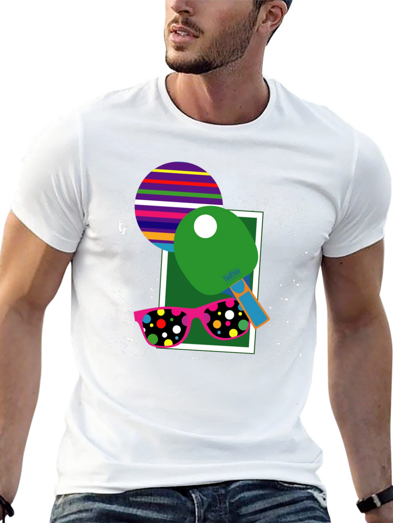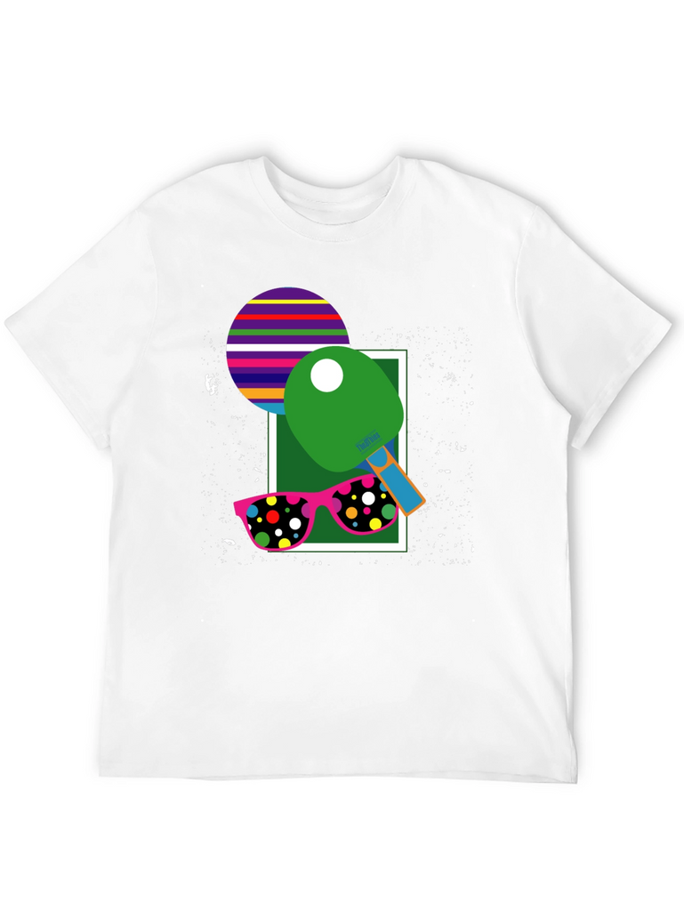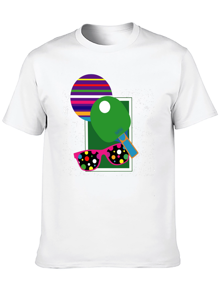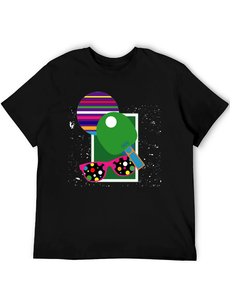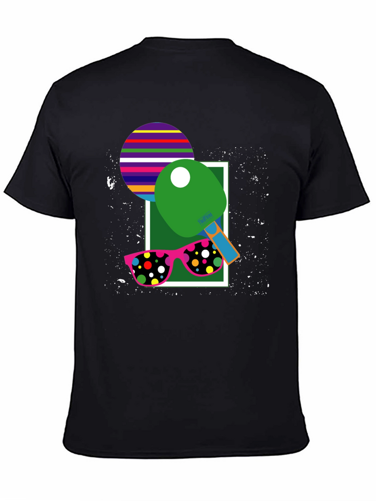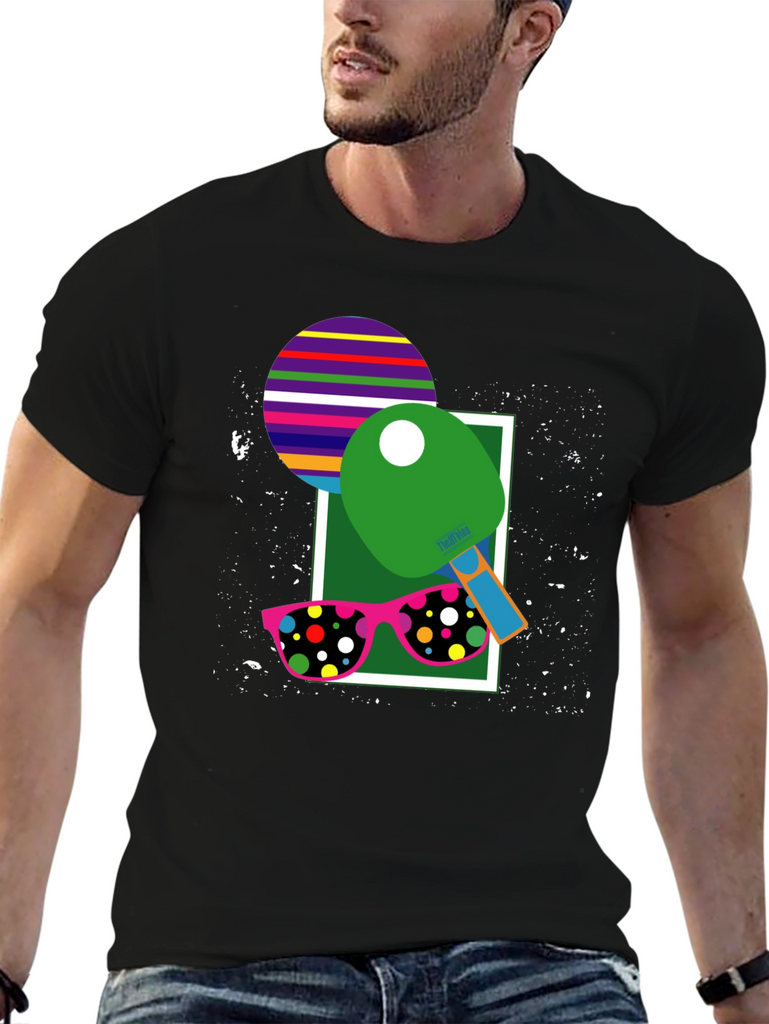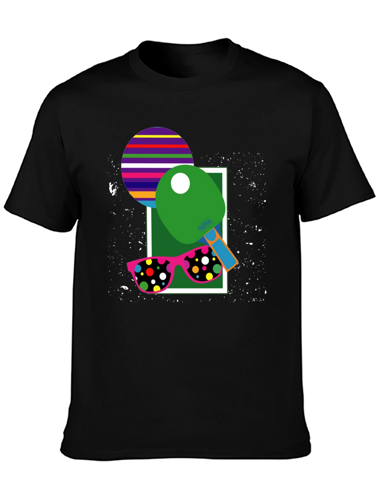Serve up some style with this eye-catching black tee! This shirt features a vibrant graphic design of a table tennis paddle, a colorful striped ball, and funky polka-dot sunglasses. The bold design is set against a textured, speckled backdrop, giving it a cool, retro feel. Made from comfortable materials, it’s perfect for casual wear, hitting the gym, or showing off your love for ping pong. Stand out from the crowd and express your fun personality with this unique and playful tee. A must-have for table tennis enthusiasts and anyone with a vibrant sense of style!