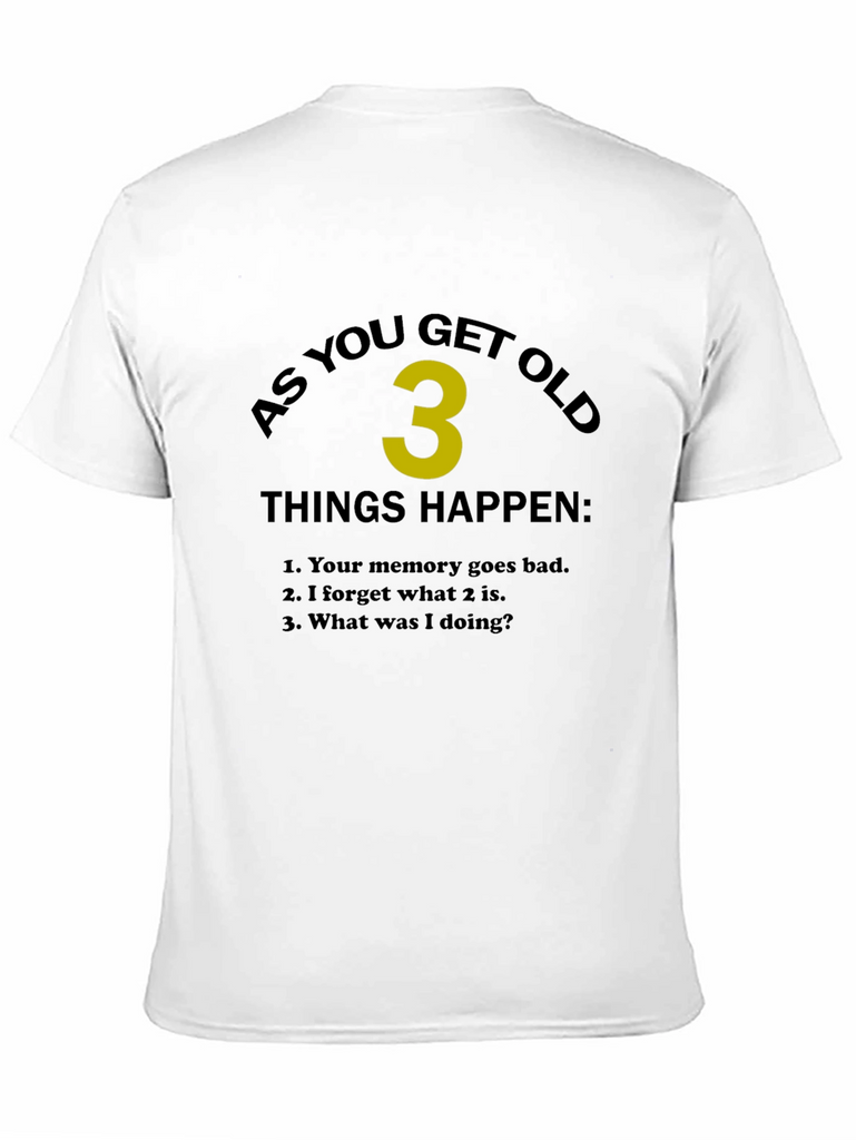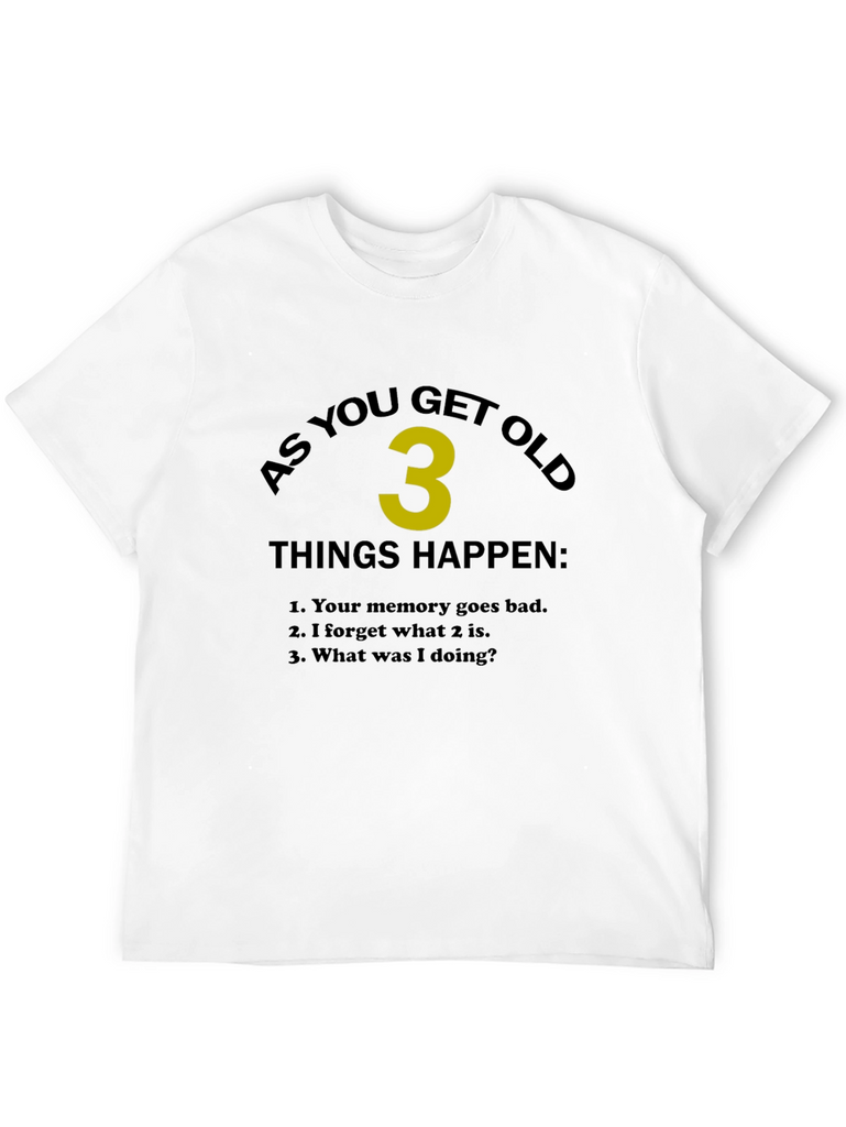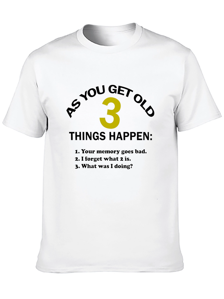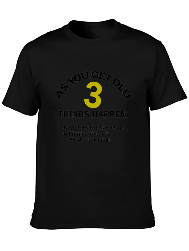 This black T-shirt features a humorous print, perfect for those who appreciate a bit of self-deprecating humor about aging. The shirt states "As You Get Old, 3 Things Happen: 1. Your memory goes bad. 2. I forget what 2 is. 3. What was I doing?". The '3' is in a distinctive gold color, adding a pop to the design. Made from comfortable, breathable fabric, this tee is ideal for casual wear. It's a great conversation starter and makes for a fun gift for birthdays, retirement parties, or just because. Show off your wit and wisdom (or lack thereof!) with this quirky and relatable T-shirt.