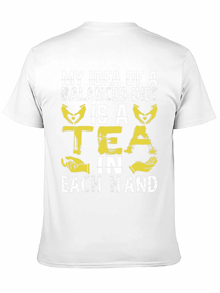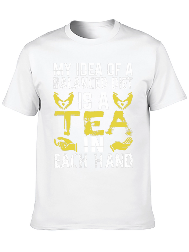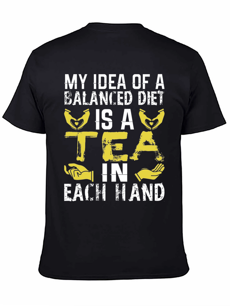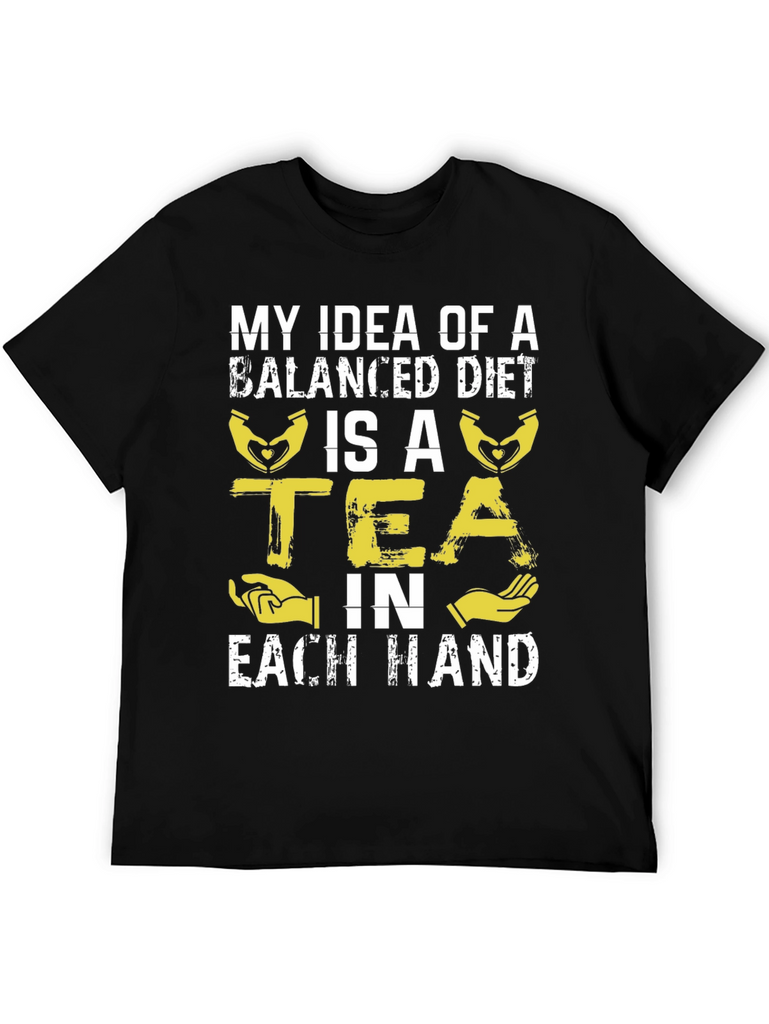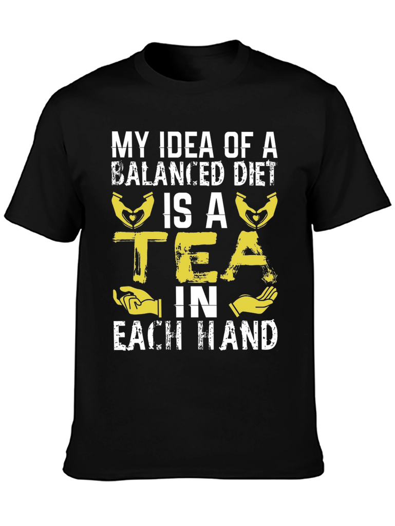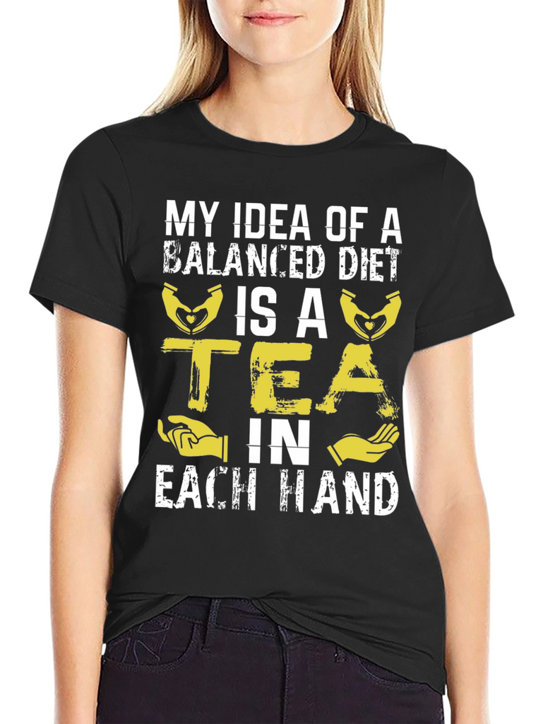 This black t-shirt features a humorous graphic design for tea enthusiasts. The text "My Idea Of A Balanced Diet Is A Tea In Each Hand" is prominently displayed in a combination of white and yellow lettering. The design includes graphic of hands forming a heart around the word "TEA", adding a unique and playful touch. Made from a comfortable-looking fabric, this tee is perfect for casual wear and expressing your love for tea with a bit of humor. Great for tea parties, casual outings, or as a fun gift for a fellow tea lover. Show off your quirky style with this eye-catching and conversation-starting t-shirt.