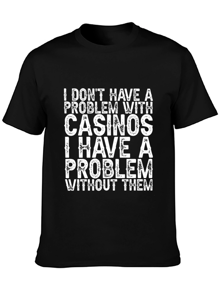 This black t-shirt features a humorous statement perfect for casino enthusiasts. The bold white text proclaims, "I DON'T HAVE A PROBLEM WITH CASINOS I HAVE A PROBLEM WITHOUT THEM." The casual design and comfortable fit make it ideal for everyday wear, game nights, or casino visits. Showcase your love for the thrill with this unique tee, a surefire conversation starter and a fun addition to any wardrobe. A lighthearted way to express your hobby.