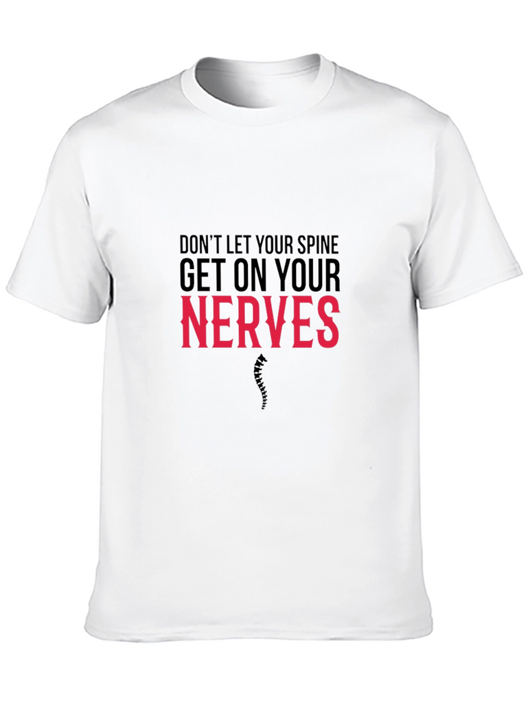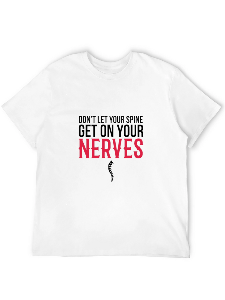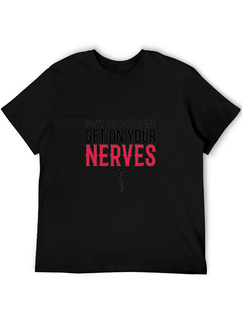 This black t-shirt features a humorous message that's perfect for anyone in the chiropractic field or with a love for spinal health. The text, "DON'T LET YOUR SPINE GET ON YOUR NERVES," is prominently displayed on the front, with the word "NERVES" in a bold red color. A subtle spine graphic adds a touch of professionalism to the design. Made from a comfortable-looking fabric, this tee is ideal for casual wear or as a conversation starter at health-related events. Show off your passion for chiropractic with this unique and eye-catching t-shirt.