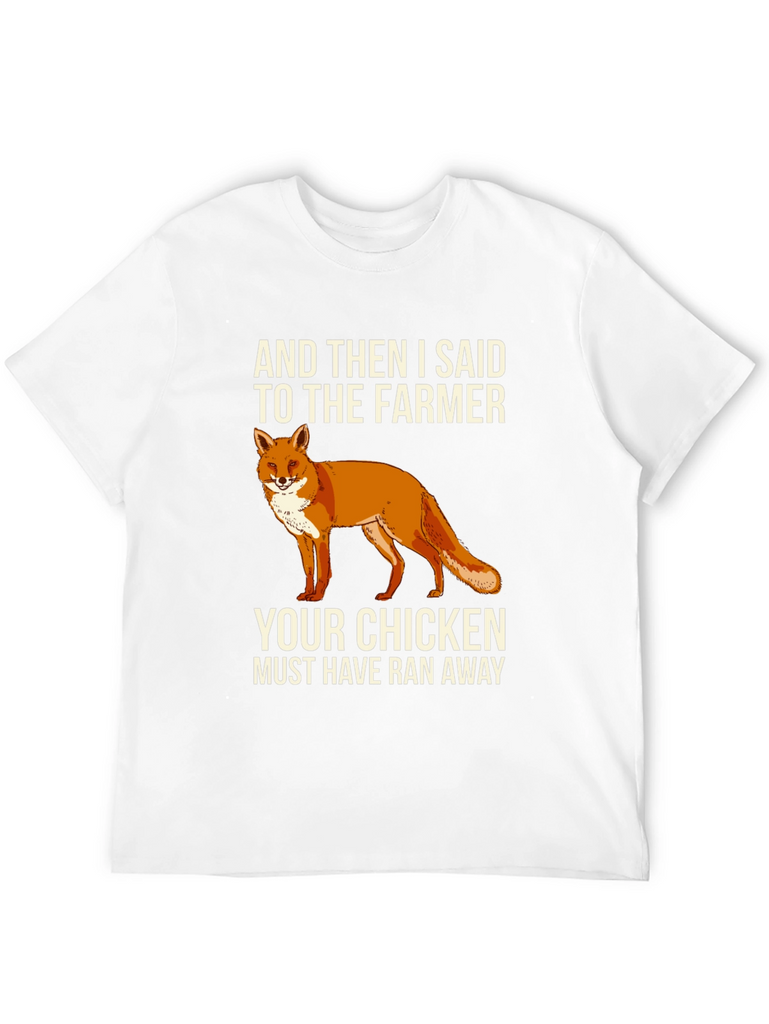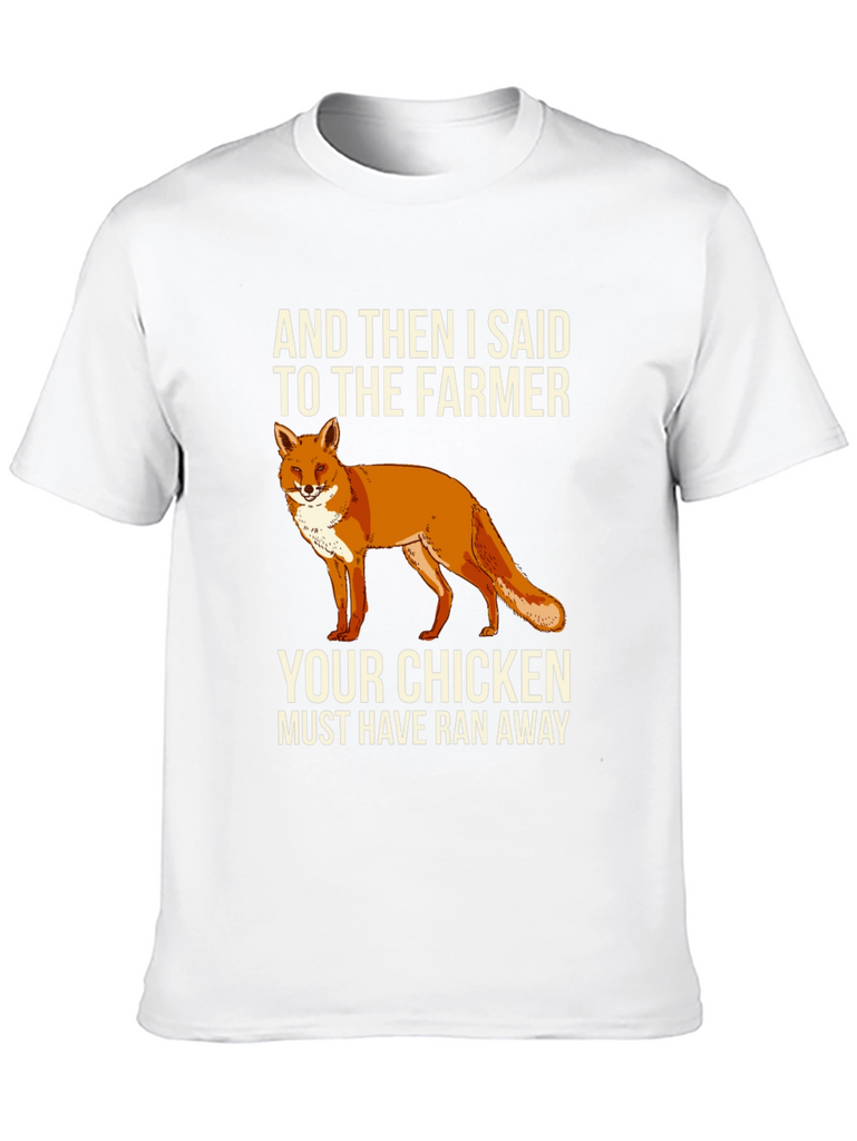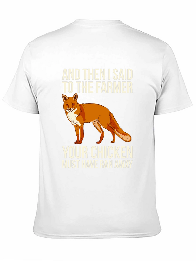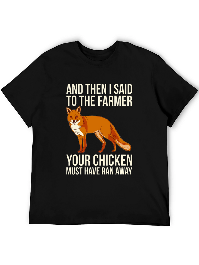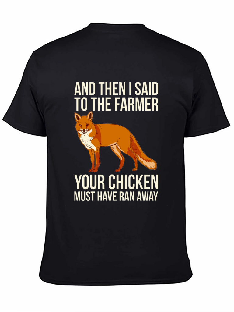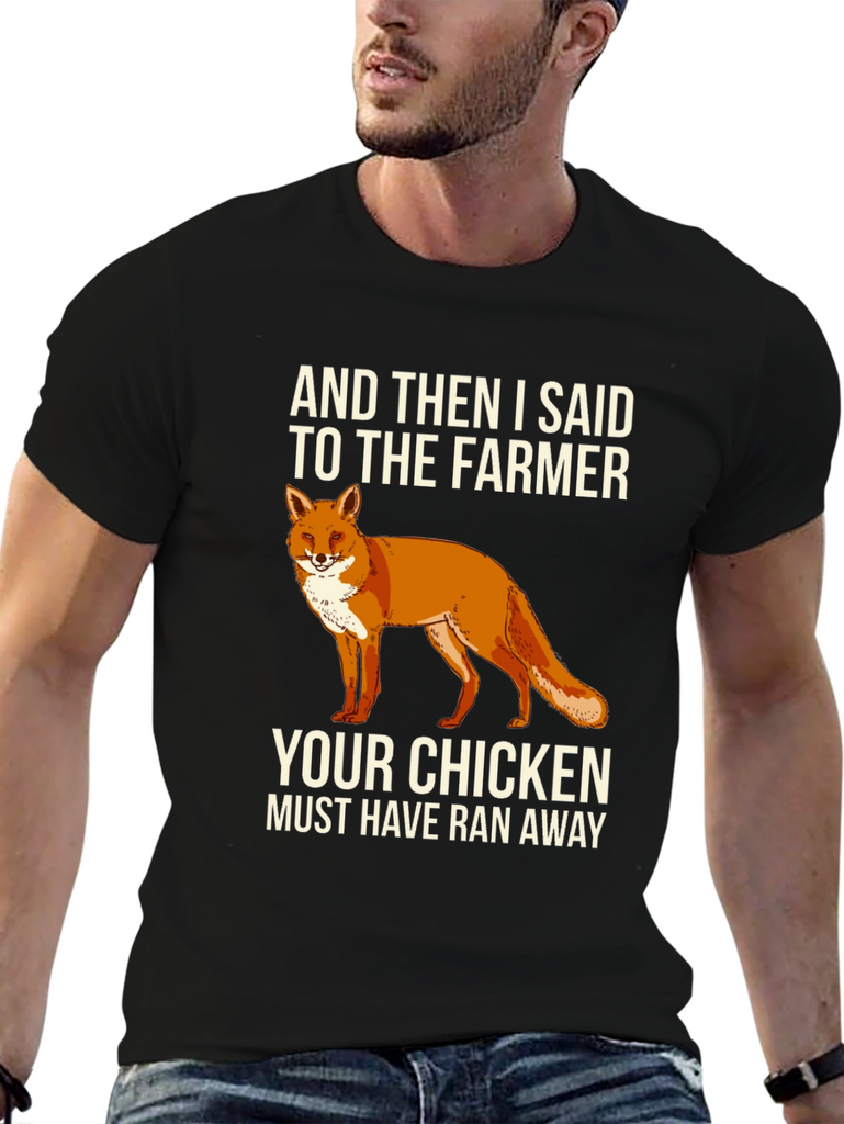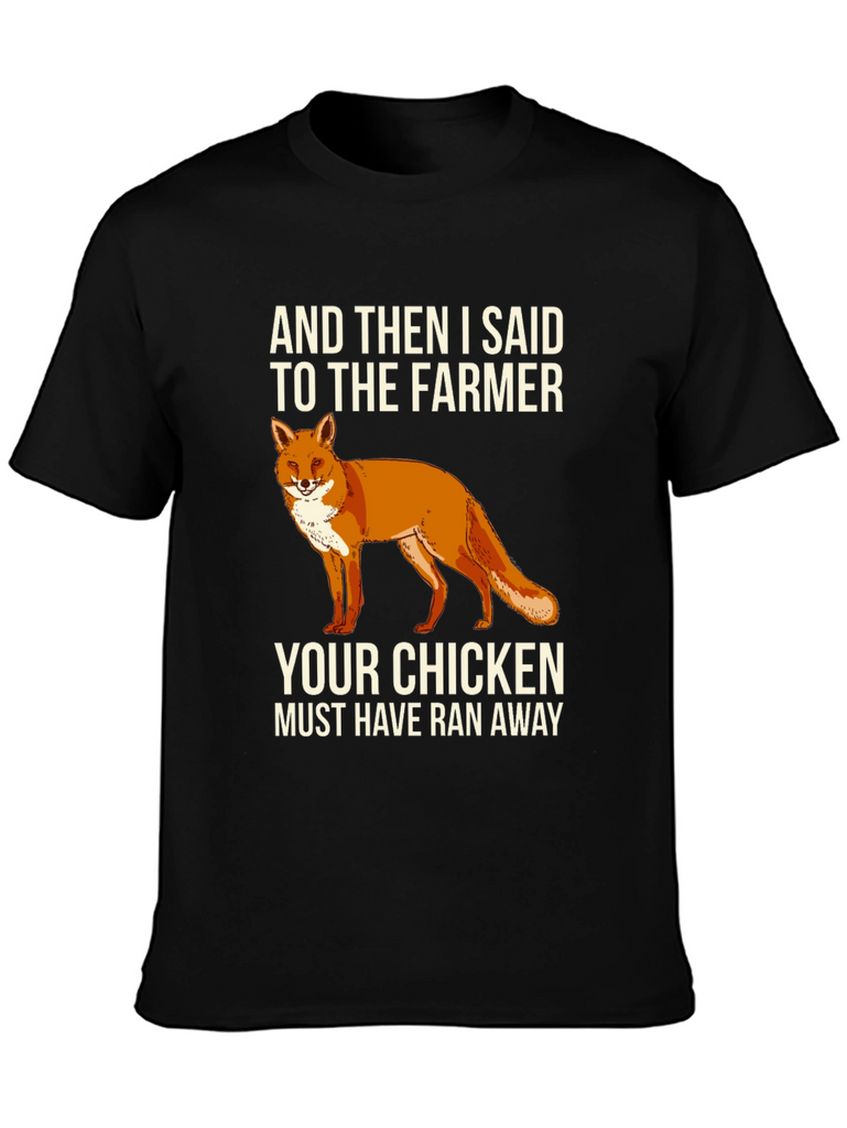 This black t-shirt features a humorous graphic design. Centered on the chest, there's a vibrant illustration of a fox, accompanied by the witty text "AND THEN I SAID TO THE FARMER YOUR CHICKEN MUST HAVE RAN AWAY." The shirt appears to be made from a soft, comfortable cotton blend. It's a casual and stylish choice for everyday wear, making it a great conversation starter and a fun addition to any wardrobe. Ideal for casual outings, humorous occasions, or anyone who appreciates clever designs and loves a touch of wit.