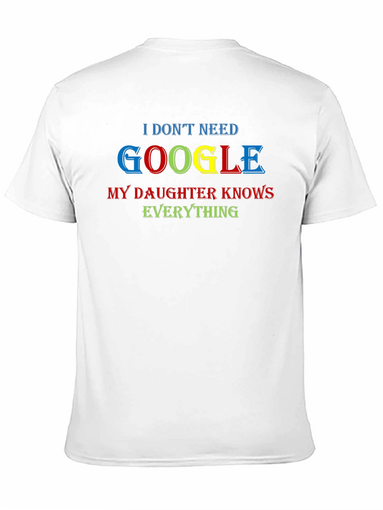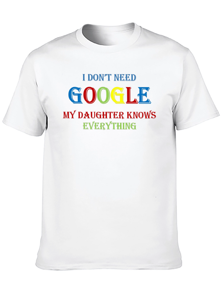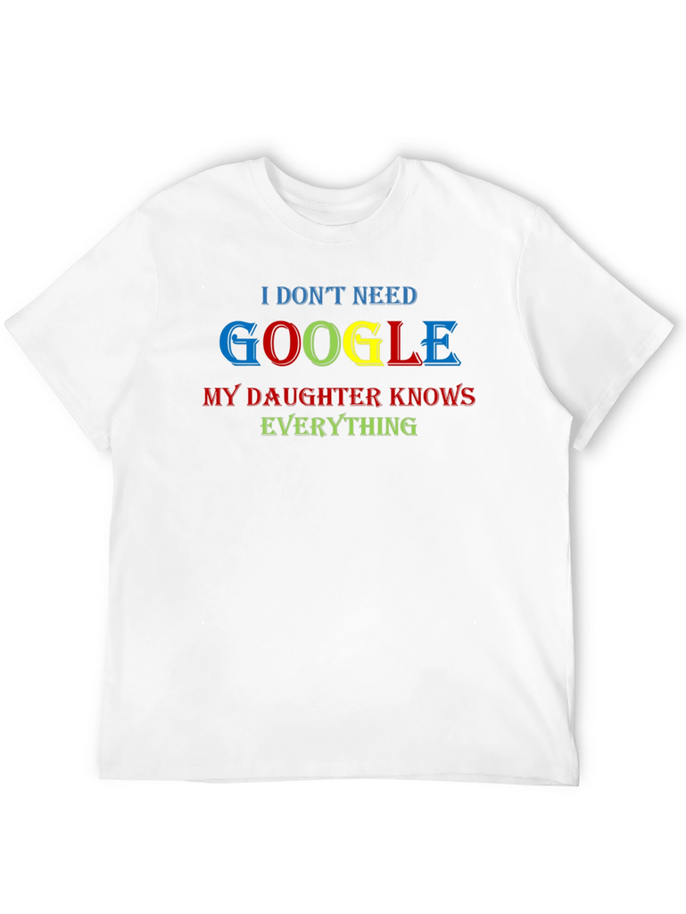 Show off your love for your daughter and your sense of humor with this stylish black graphic tee! The shirt features the phrase "I DON'T NEED GOOGLE MY DAUGHTER KNOWS EVERYTHING", printed in Google's signature blue, red, yellow and green colors. This tee is perfect for casual outings, family gatherings, or as a fun gift for any proud dad. The classic cut ensures a comfortable fit, while the bold statement makes it a standout piece. Get ready to turn heads and spark conversations with this unique and playful t-shirt!