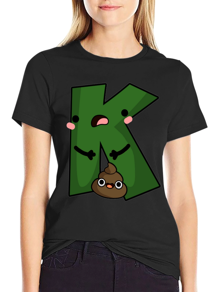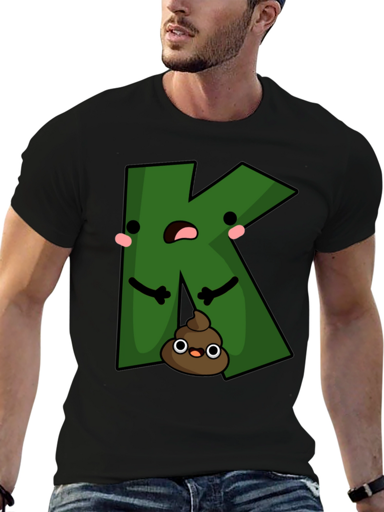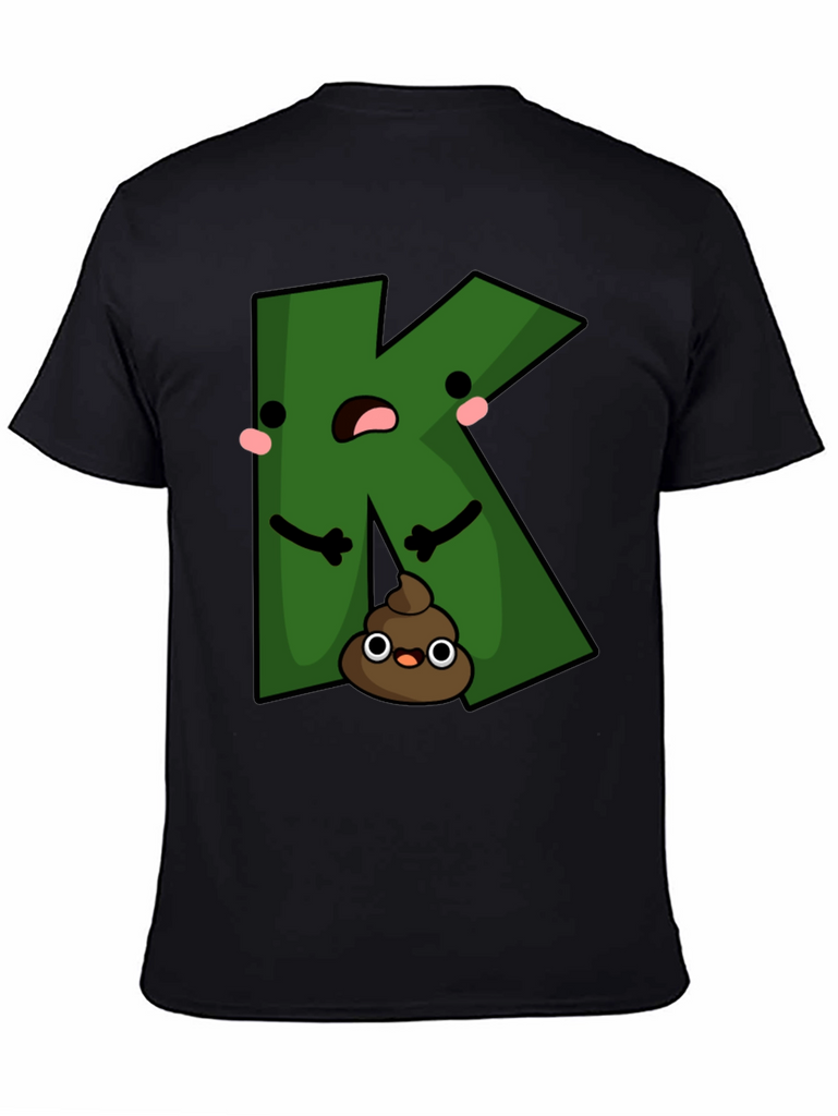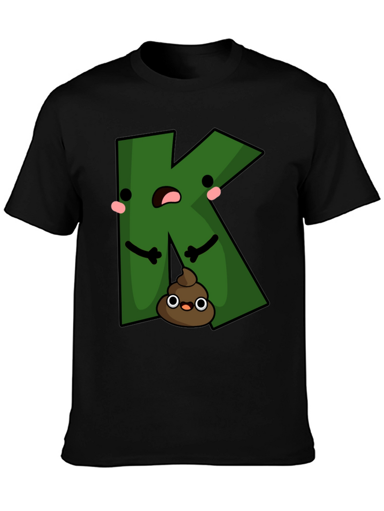 This playful black t-shirt features a cartoon design of the letter 'K' with cute blushing cheeks and hands, seemingly surprised by a tiny poop emoji character hanging below. The design is vibrant and eye-catching, making it a fun and quirky addition to any wardrobe. Made from a comfortable fabric, it is perfect for casual wear, outings with friends, or expressing your unique sense of humor. The shirt's design combines playful elements for a fun and lighthearted look. Great for anyone who enjoys fun designs or emoji-themed apparel, it is sure to be a conversation starter and bring a smile to those who see it.