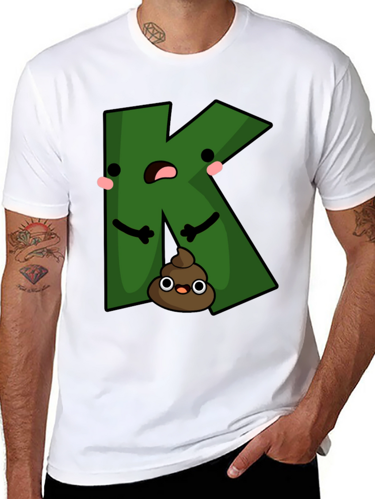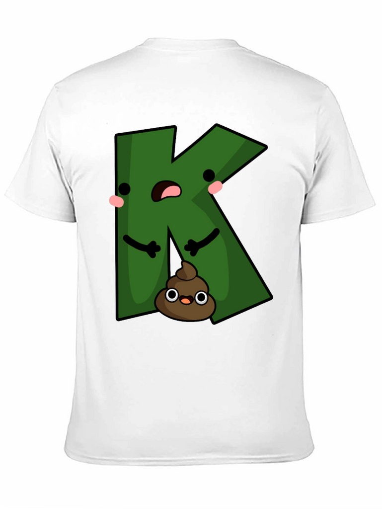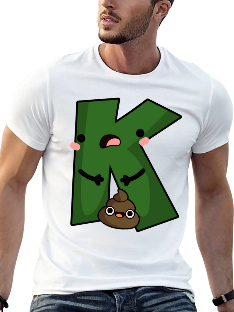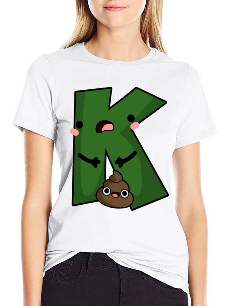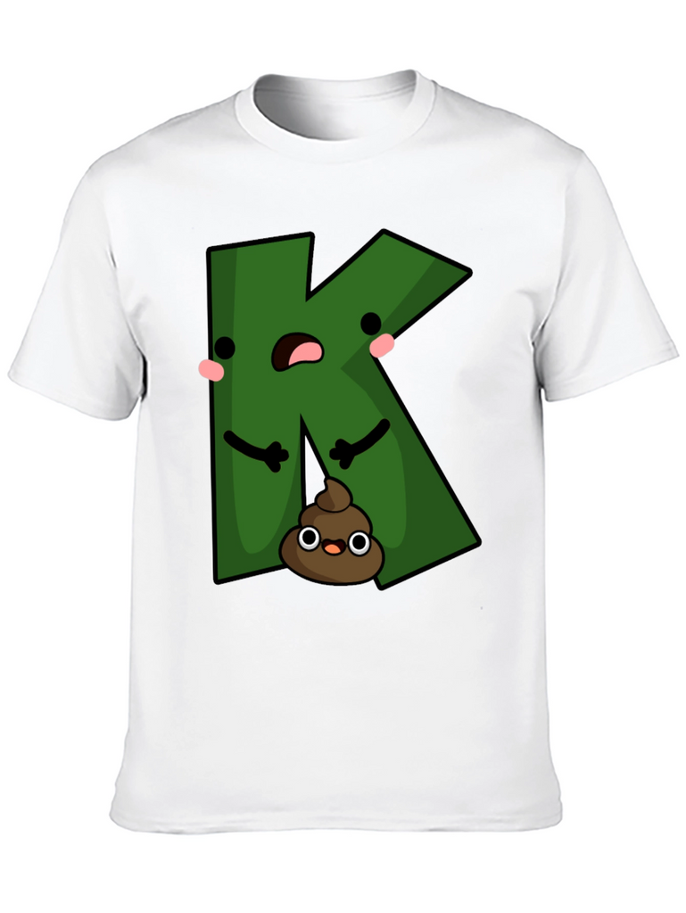This playful black t-shirt features a cartoon design of the letter 'K' with cute blushing cheeks and hands, seemingly surprised by a tiny poop emoji character hanging below. The design is vibrant and eye-catching, making it a fun and quirky addition to any wardrobe. Made from a comfortable fabric, it is perfect for casual wear, outings with friends, or expressing your unique sense of humor. The shirt's design combines playful elements for a fun and lighthearted look. Great for anyone who enjoys fun designs or emoji-themed apparel, it is sure to be a conversation starter and bring a smile to those who see it.