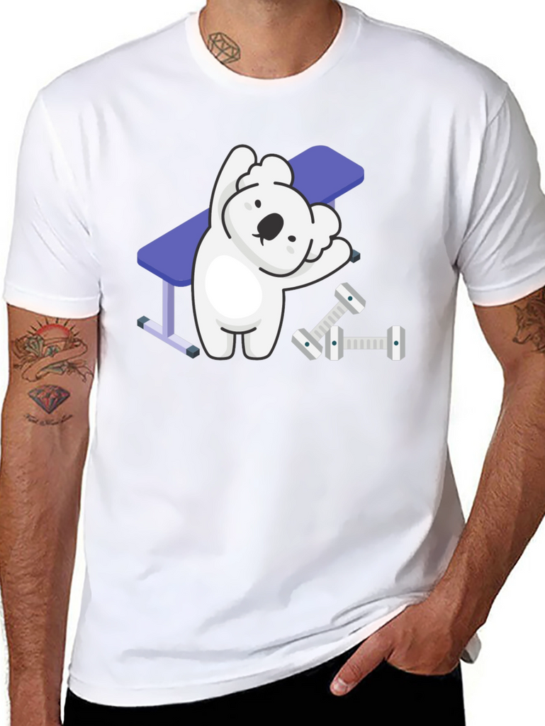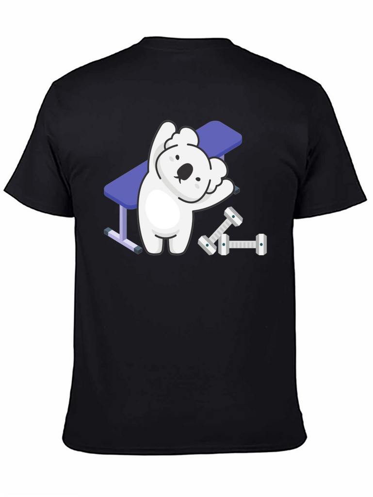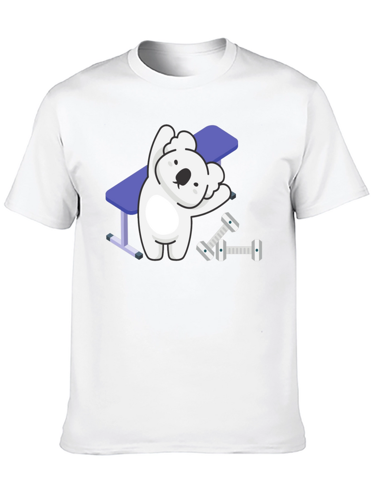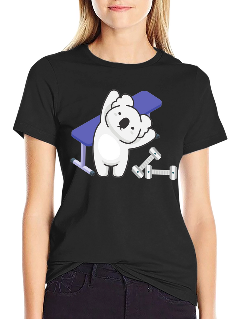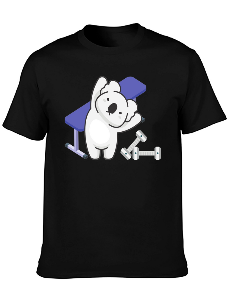 This black t-shirt features a playful design of a white koala bear working out at the gym. The cartoon-style graphic includes a weight bench and dumbbells, adding a touch of humor to your workout attire. Made from comfortable, breathable fabric, this shirt is perfect for gym sessions or casual wear. Show off your fun-loving side and stay motivated with this unique koala-themed tee. Ideal for animal lovers and fitness enthusiasts alike! Machine washable for easy care.