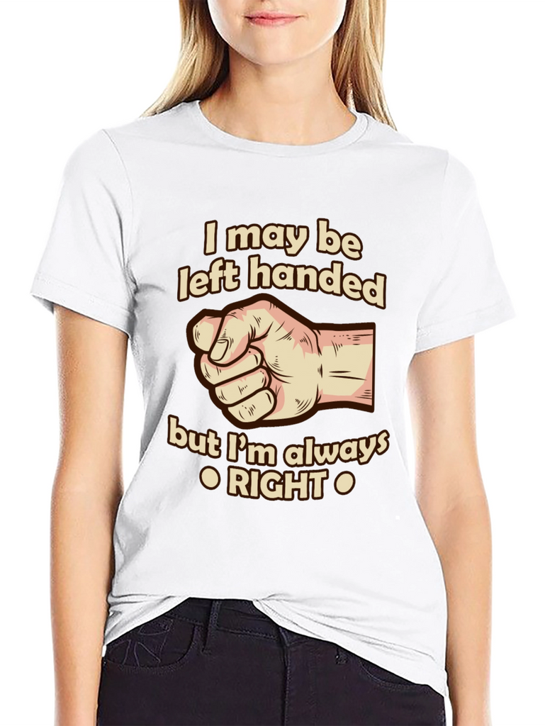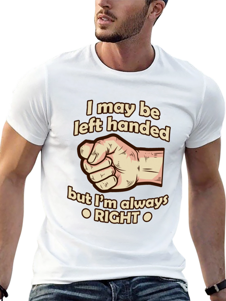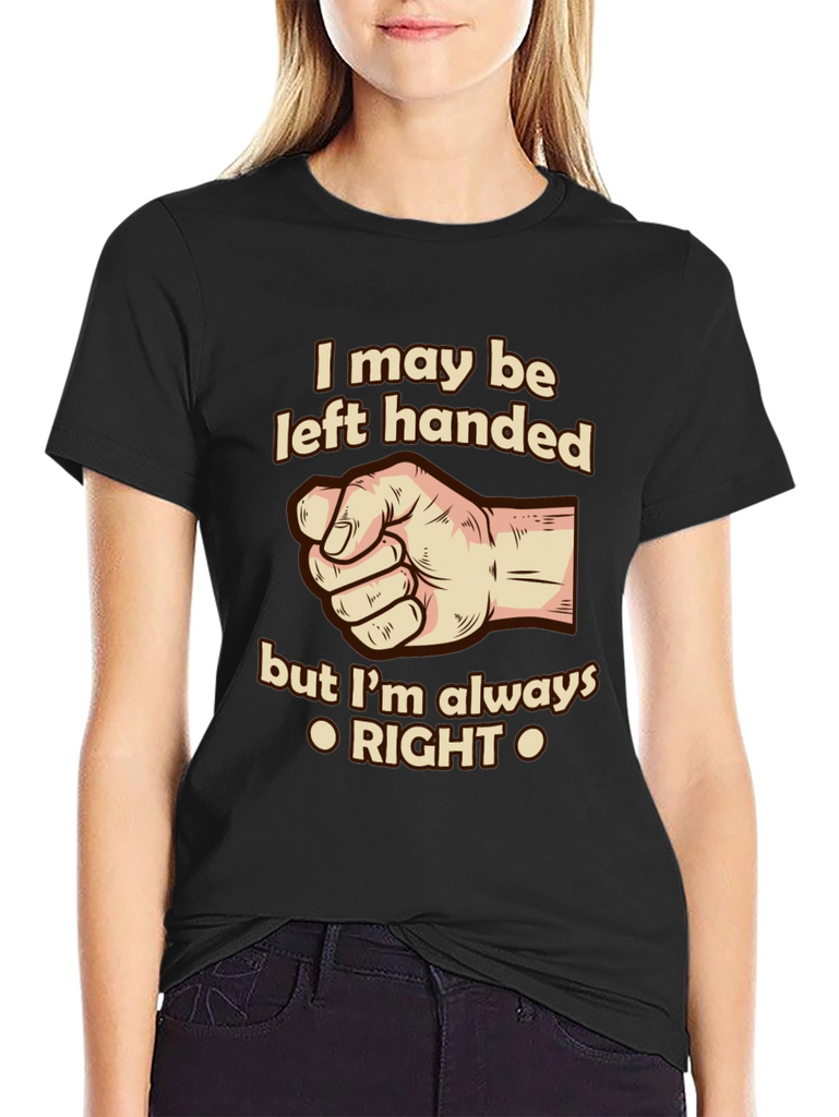 Show off your sense of humor with this eye-catching black t-shirt. The shirt features a bold graphic design with the witty phrase "I may be left-handed, but I'm always RIGHT", along with a clenched fist illustration. Made from comfortable, breathable fabric, this tee is perfect for casual wear, parties, or as a fun gift for the left-handed individual in your life. Its unique design is sure to spark conversations and bring a smile to anyone who sees it. Wear it with pride and let everyone know that being left-handed doesn't mean you're wrong!