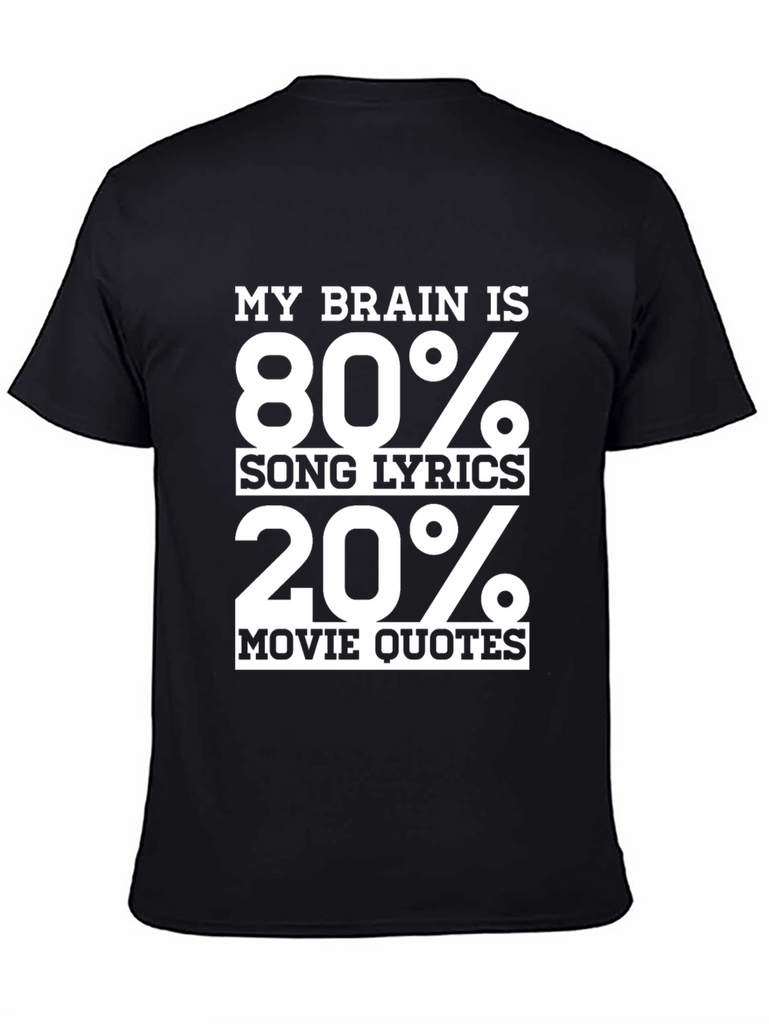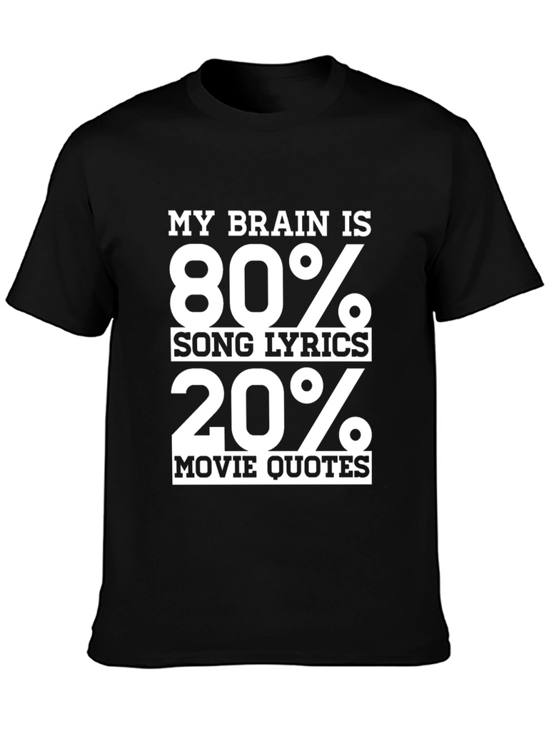 This black t-shirt features a humorous graphic print. The design reads "My Brain Is 80% Song Lyrics, 20% Movie Quotes" in bold, white lettering. Made from a comfortable-looking fabric, this tee is perfect for casual wear. Show off your love for music and movies with this quirky and eye-catching t-shirt. It's sure to spark conversations and add a touch of humor to your everyday style. Ideal for casual outings, lounging at home, or gifting to the pop culture enthusiast in your life. A fun and expressive addition to any wardrobe!