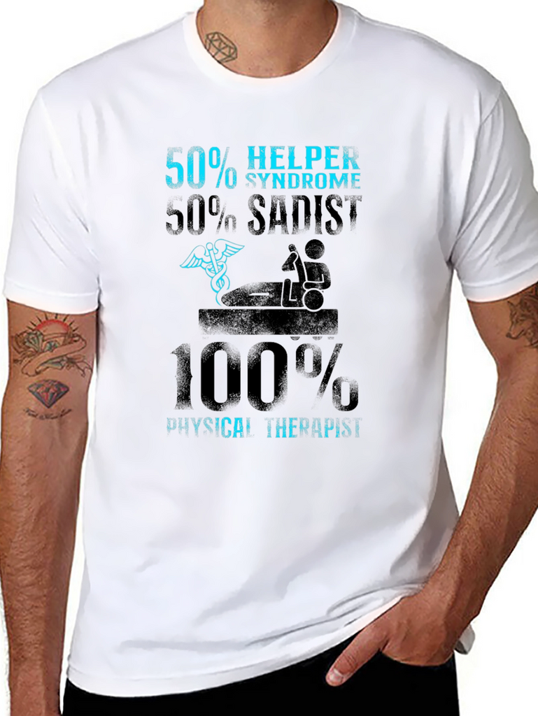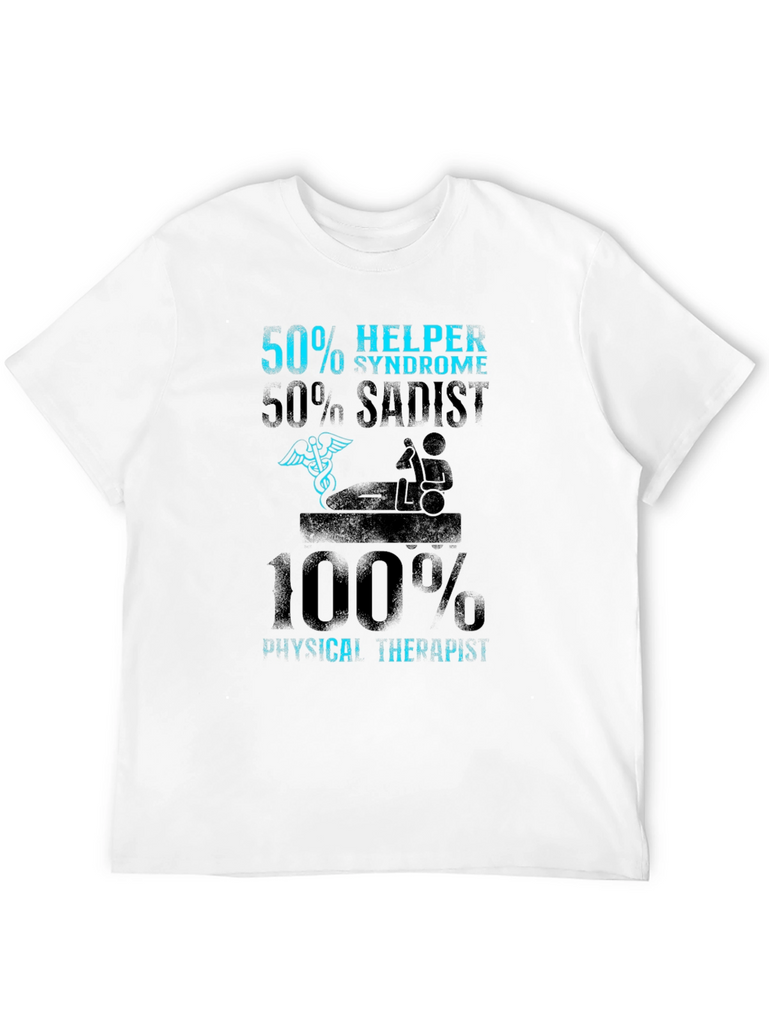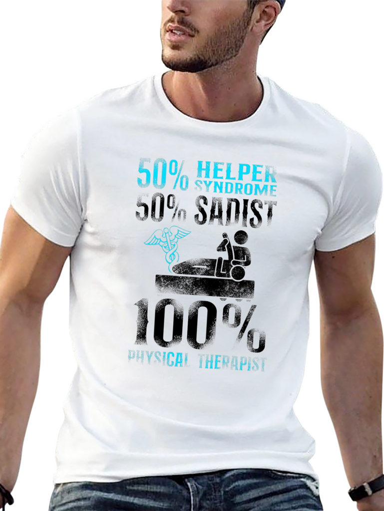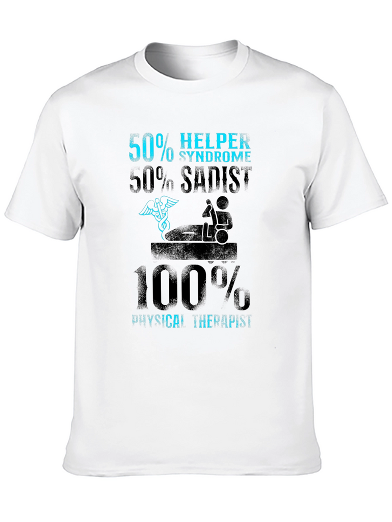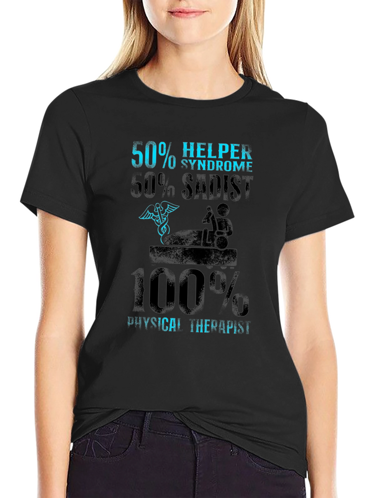 This black t-shirt features a humorous design for physical therapists. The design includes teal-blue text stating '50% Helper Syndrome, 50% Sadist, 100% Physical Therapist' along with a caduceus and a stick figure pushing another on a table, representing the profession. Made from comfortable materials, this shirt is perfect for physical therapists who want to add a touch of humor to their work attire. It's a great conversation starter and shows off their dedication to their profession with a playful twist. Ideal for casual wear, professional events, or as a gift for a physical therapist.
