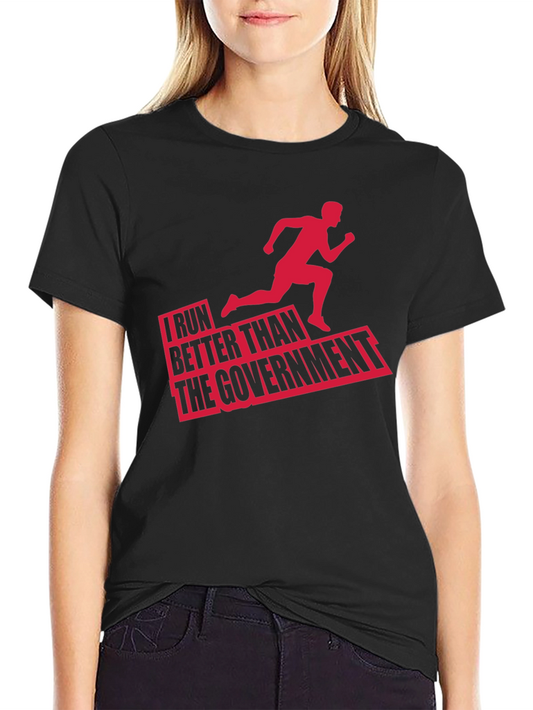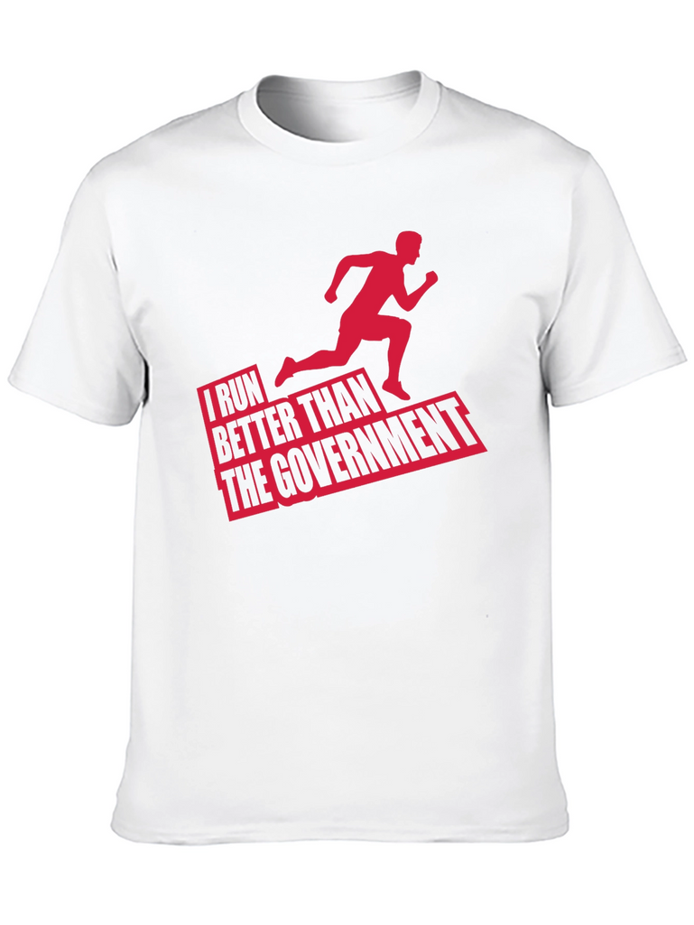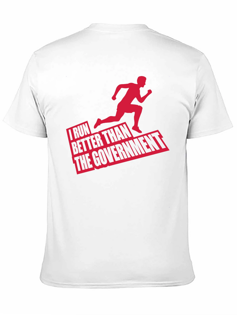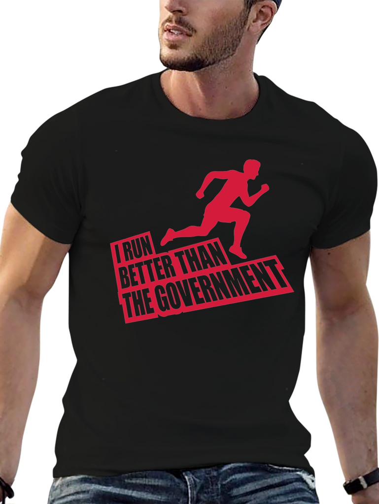 Show off your running prowess with this humorous black t-shirt. Featuring a bold red graphic of a runner silhouette and the witty statement "I RUN BETTER THAN THE GOVERNMENT," this tee is sure to turn heads. Perfect for runners, athletes, or anyone with a sense of humor, this shirt is a great conversation starter. Made from what appears to be a comfortable cotton blend, it's ideal for workouts, casual outings, or simply lounging around. Express your passion for running and your unique style with this eye-catching and lighthearted t-shirt. It also makes a fantastic gift for the runners in your life!