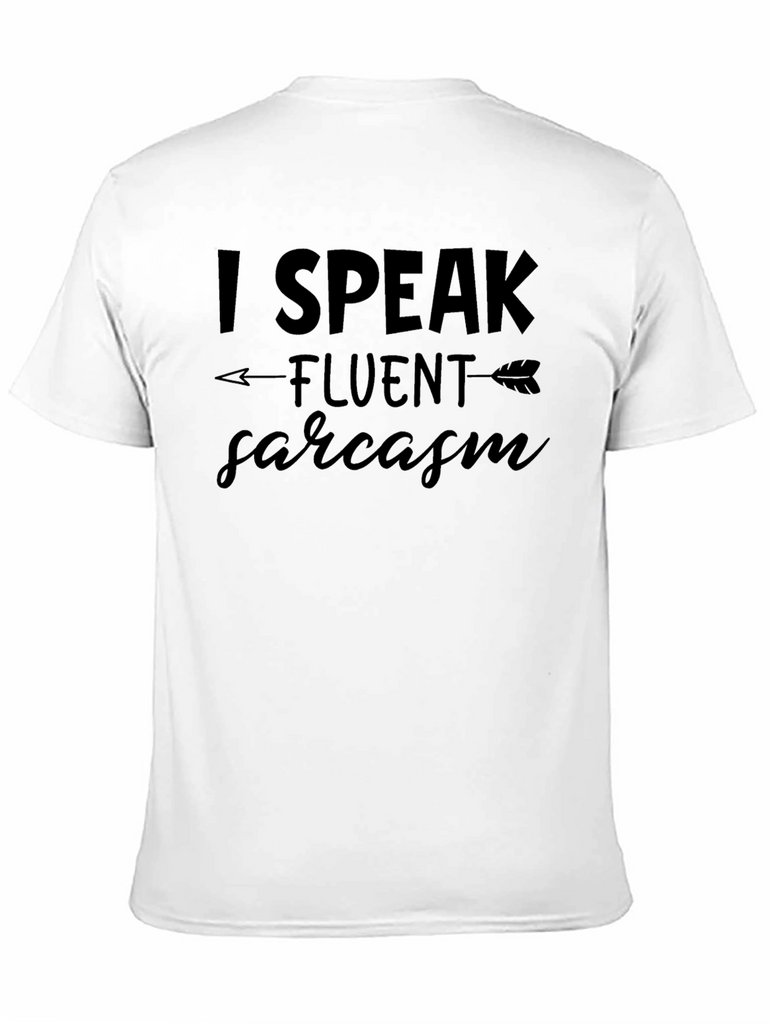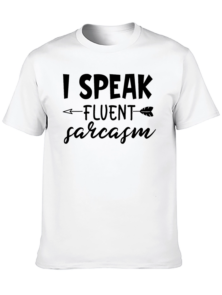 This eye-catching black t-shirt features a humorous graphic print that reads "I SPEAK fluent sarcasm", making it a perfect choice for those with a witty sense of humor. The design incorporates an arrow that underlines the word 'fluent', adding a playful touch to the overall look. Crafted from a comfortable, soft-feel fabric, this shirt offers both style and comfort for everyday wear. Ideal for casual outings, social gatherings, or just lounging around, this t-shirt is sure to spark conversations and bring a smile to everyone's face. Express your unique personality with this fun and stylish tee!