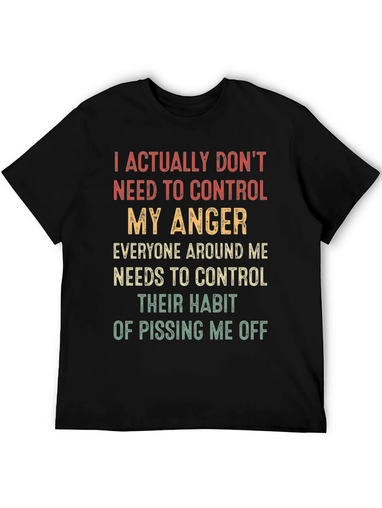 Show off your sarcastic side with this humorous black t-shirt. The bold text design reads, "I ACTUALLY DON'T NEED TO CONTROL MY ANGER. EVERYONE AROUND ME NEEDS TO CONTROL THEIR HABIT OF PISSING ME OFF." It's a great conversation starter. The shirt appears to be made from comfortable materials and has a classic fit. It would be great for casual wear, parties, or as a gag gift for a friend with a similar sense of humor. Wear it to family gatherings and watch everyone laugh! It is also great for running errands or lounging around at home.
