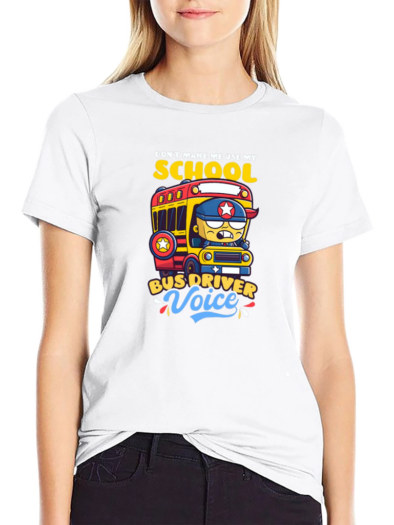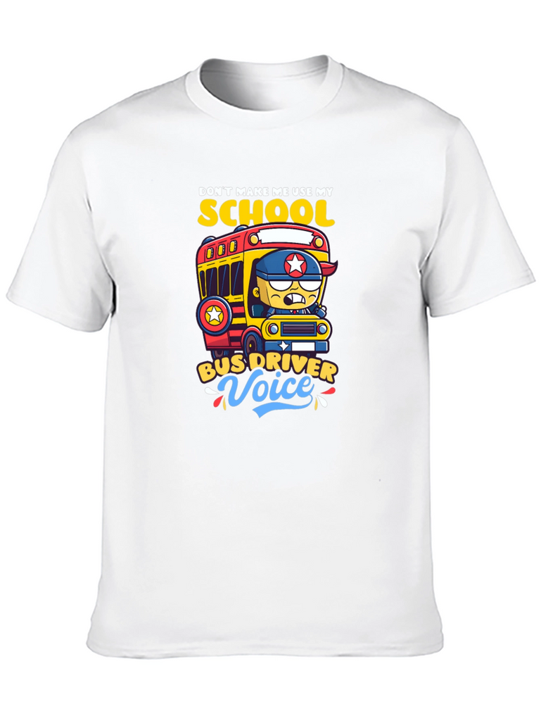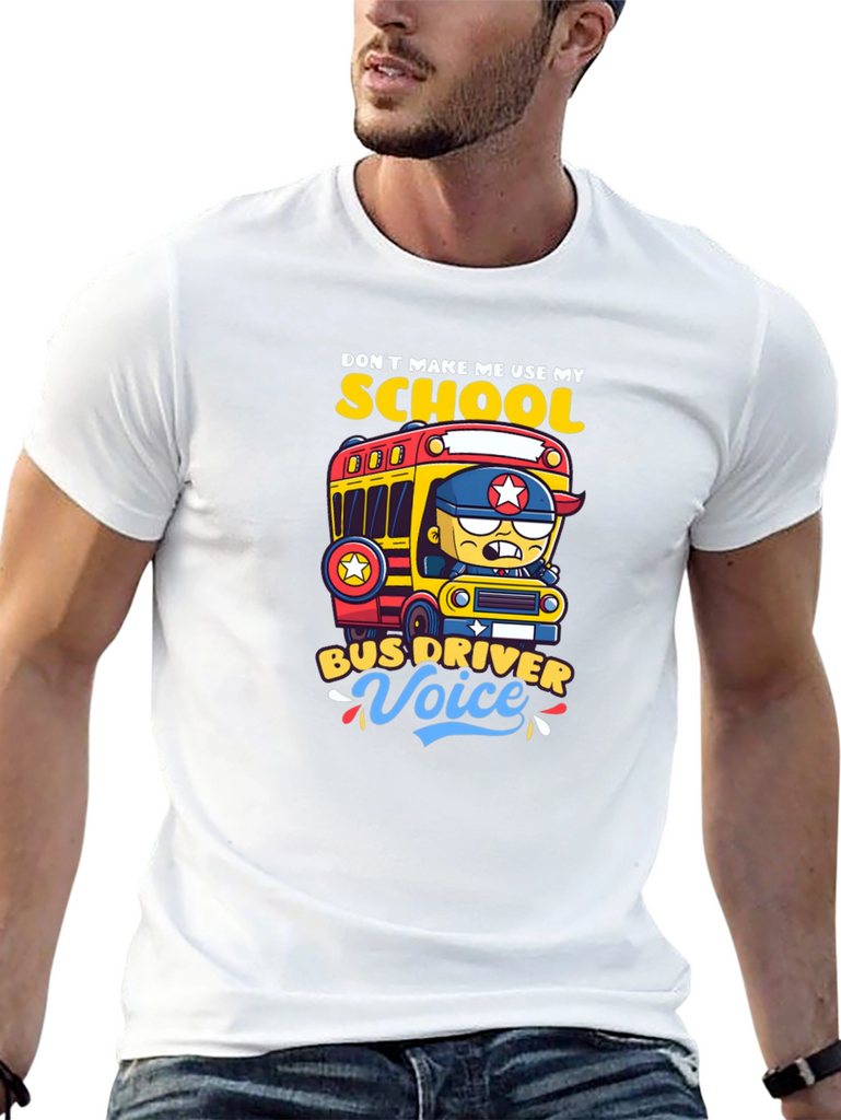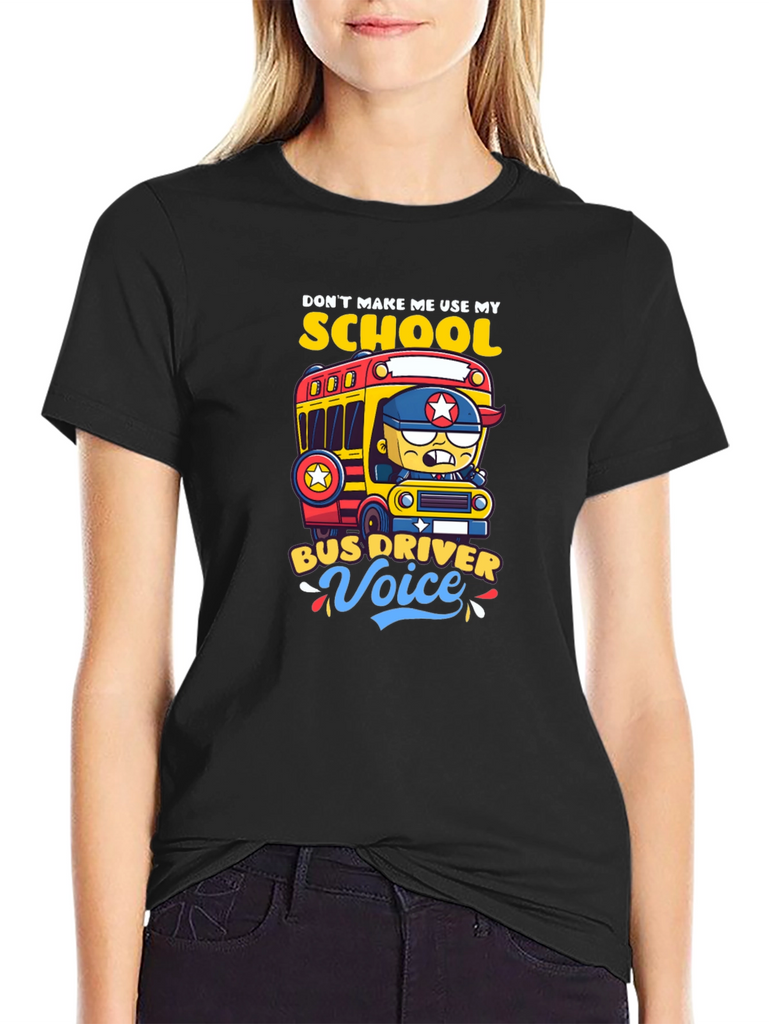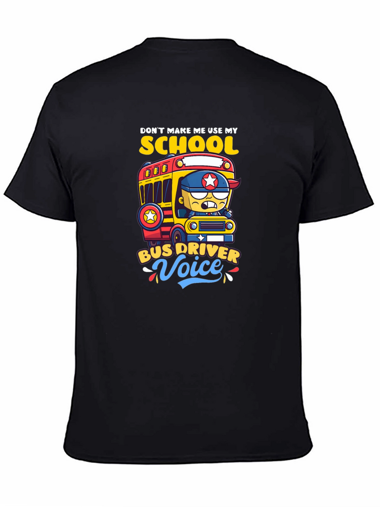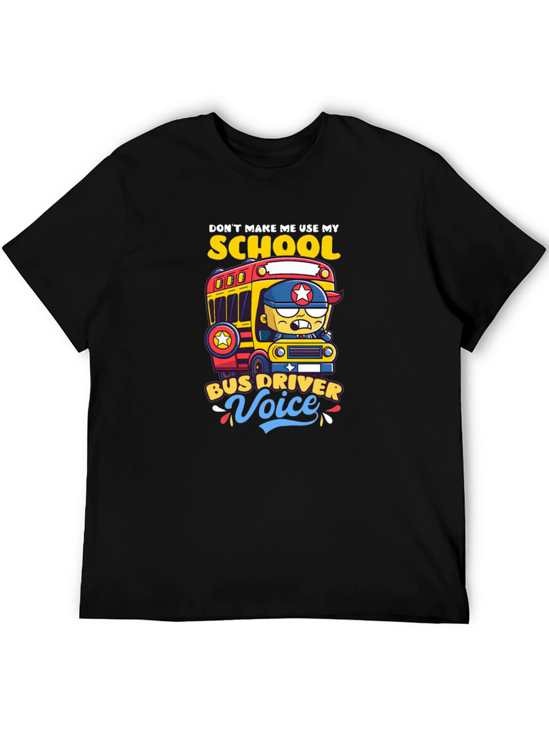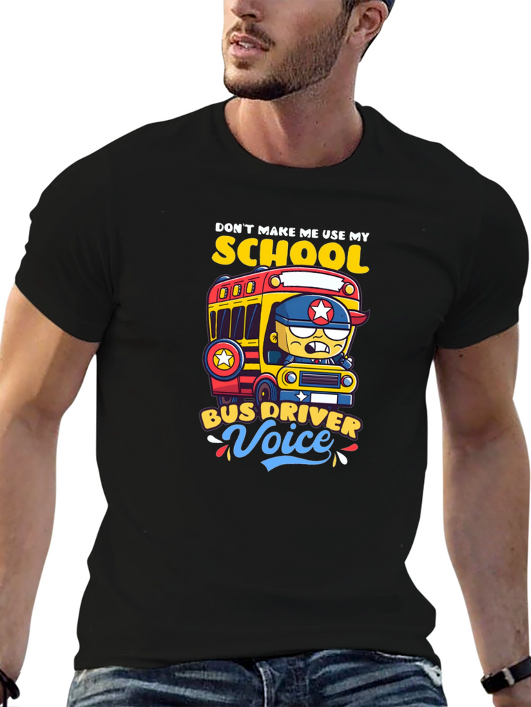 Show off your bus driver pride with this unique graphic tee. This black t-shirt features a cartoon school bus design with a cool bus driver character. The text "DON'T MAKE ME USE MY SCHOOL BUS DRIVER Voice" adds a fun touch. Made from a comfortable fabric, this tee is perfect for casual wear or as a gift for your favorite school bus driver. Stand out from the crowd with this one-of-a-kind design. Whether you're behind the wheel or just showing appreciation, this shirt is sure to get some laughs!