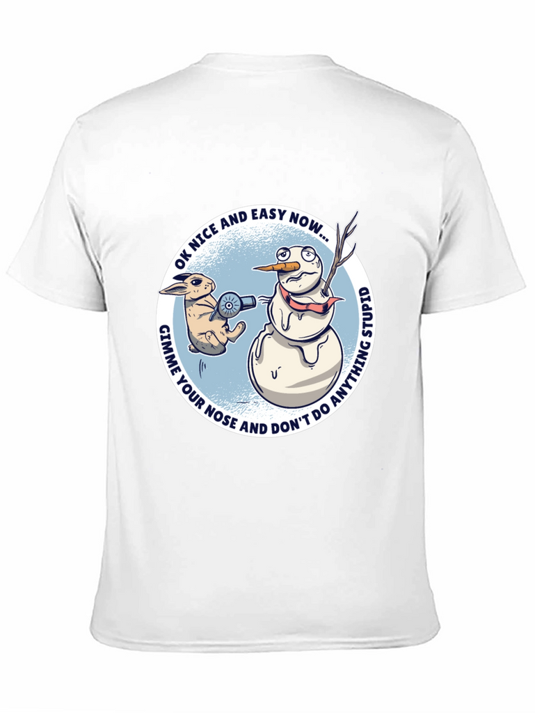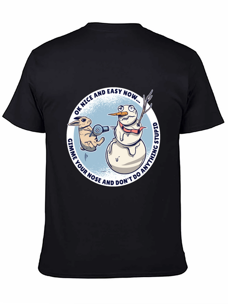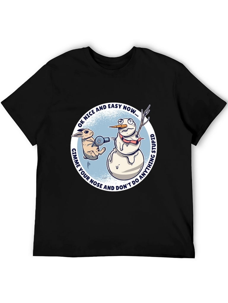 This black t-shirt features a humorous graphic design perfect for the winter season. The design showcases a cartoon rabbit threatening a snowman with a hair dryer, demanding his carrot nose. The surrounding text reads "OK NICE AND EASY NOW... GIMME YOUR NOSE AND DON'T DO ANYTHING STUPID". The graphic is set against a light blue circular background. The shirt is a classic crew neck style, suitable for casual wear. It is made of comfortable material and would be great to wear to casual holiday gatherings or simply to express your quirky sense of humor. A fun gift idea for those who love silly and unique graphic tees.