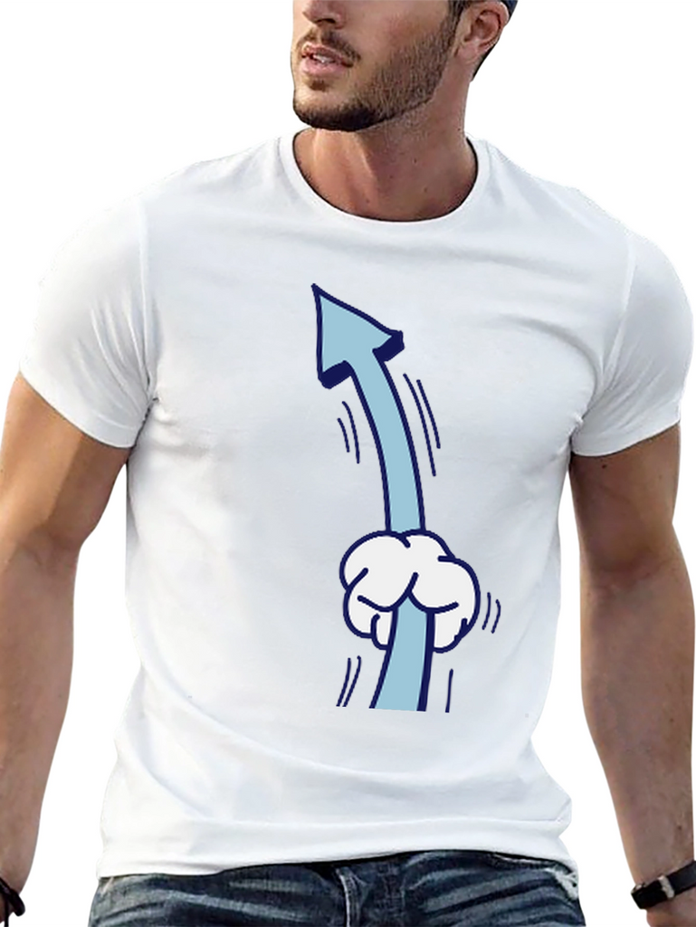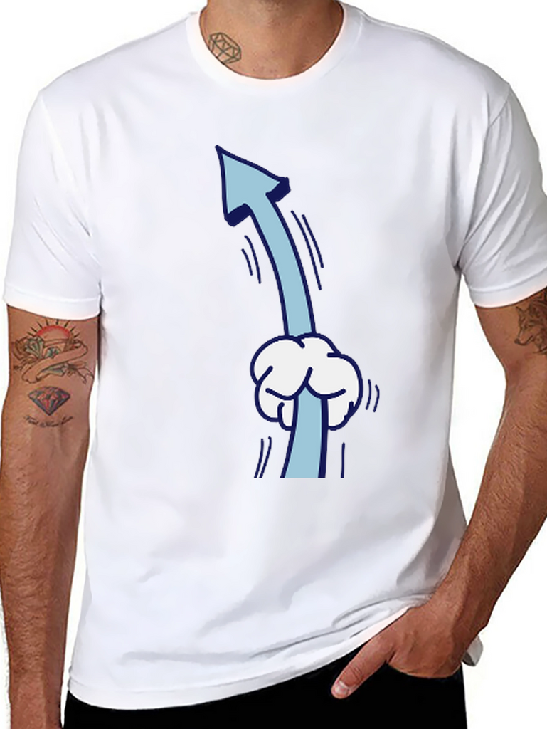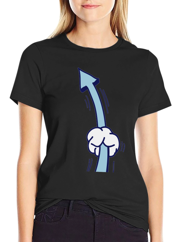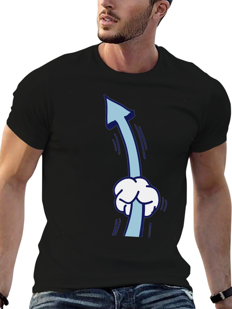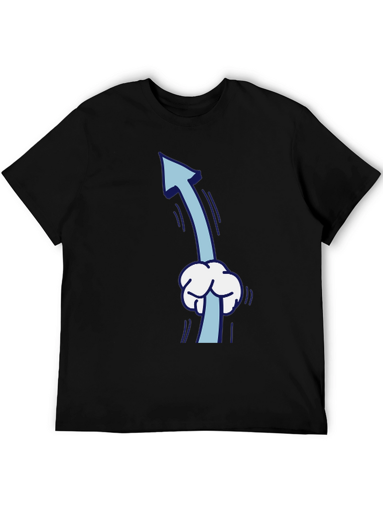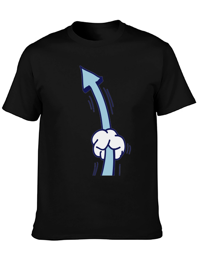 This black t-shirt features a playful cartoon design of a light blue arrow pointing upwards, seemingly propelled by a fluffy white cloud-like fist. The graphic adds a whimsical and lighthearted touch to a classic wardrobe staple. Made from what appears to be a soft and comfortable cotton blend, this shirt is perfect for casual wear. Its unique design makes it an ideal conversation starter, expressing optimism and a sense of humor. Wear it for everyday outings, social gatherings, or simply to add a bit of fun to your day. A perfect gift for those with a quirky sense of style!