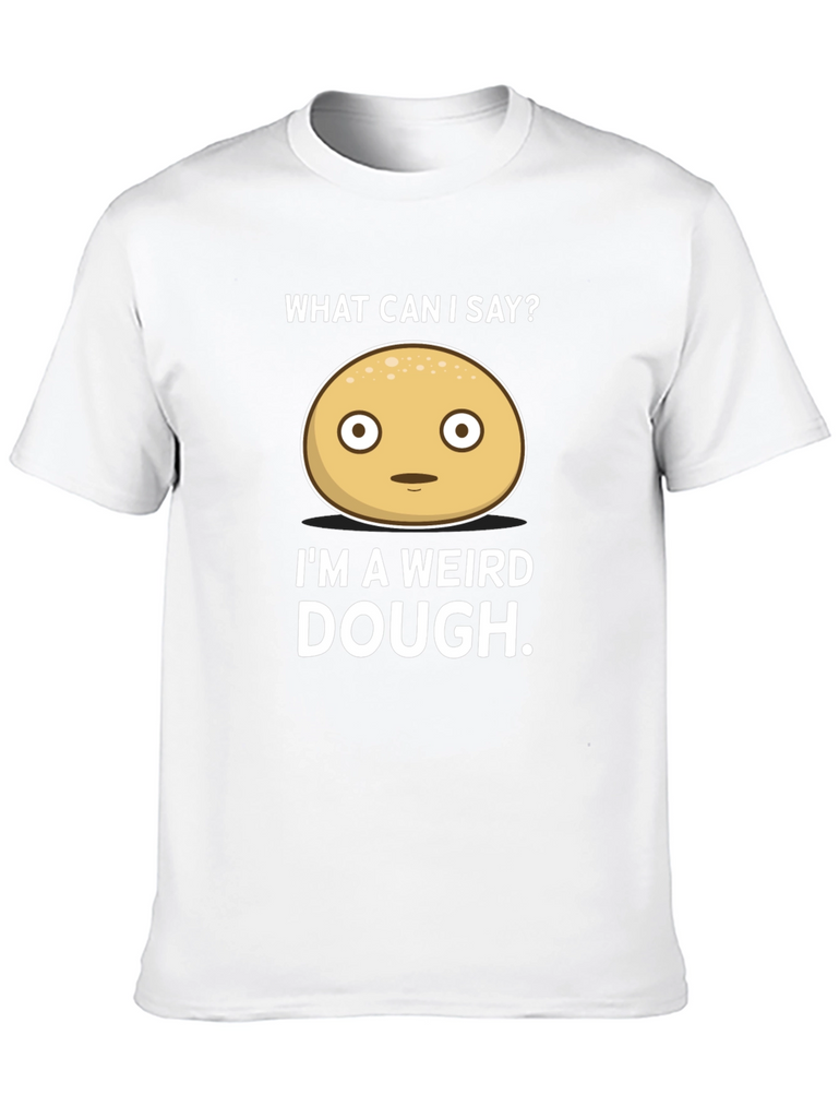 This black t-shirt features a humorous graphic design that is sure to catch attention. The design includes a stylized image of a dough character with wide eyes and a small mouth, paired with the text "WHAT CAN I SAY? I'M A WEIRD DOUGH." The shirt appears to be made of a comfortable, soft fabric, likely cotton or a cotton blend, ideal for everyday wear. This tee would be perfect for casual outings, parties, or as a fun gift for bakers, food enthusiasts, or anyone with a quirky sense of humor. It's a great way to express your unique personality and start conversations wherever you go.