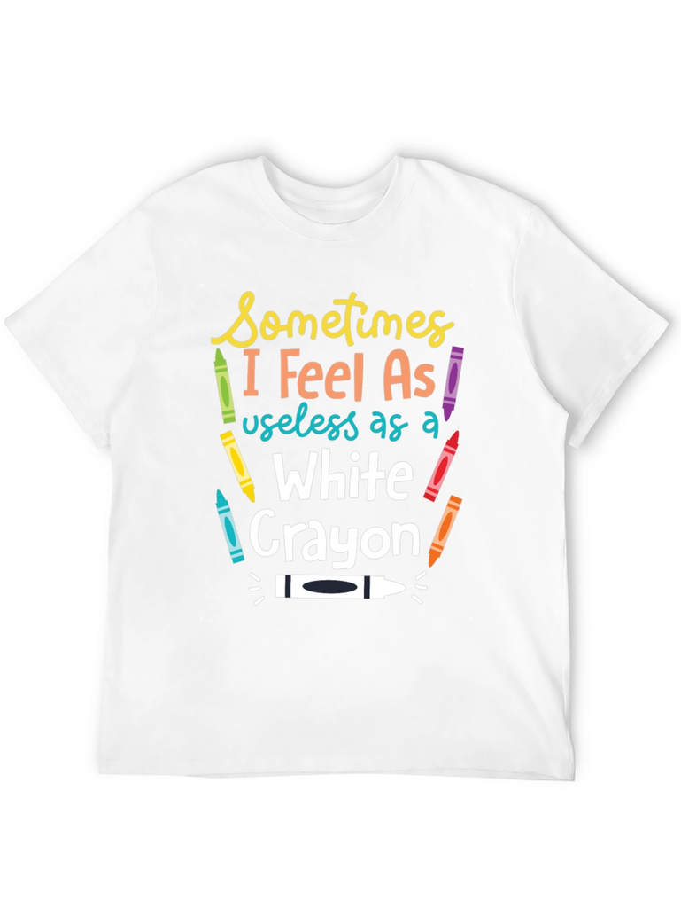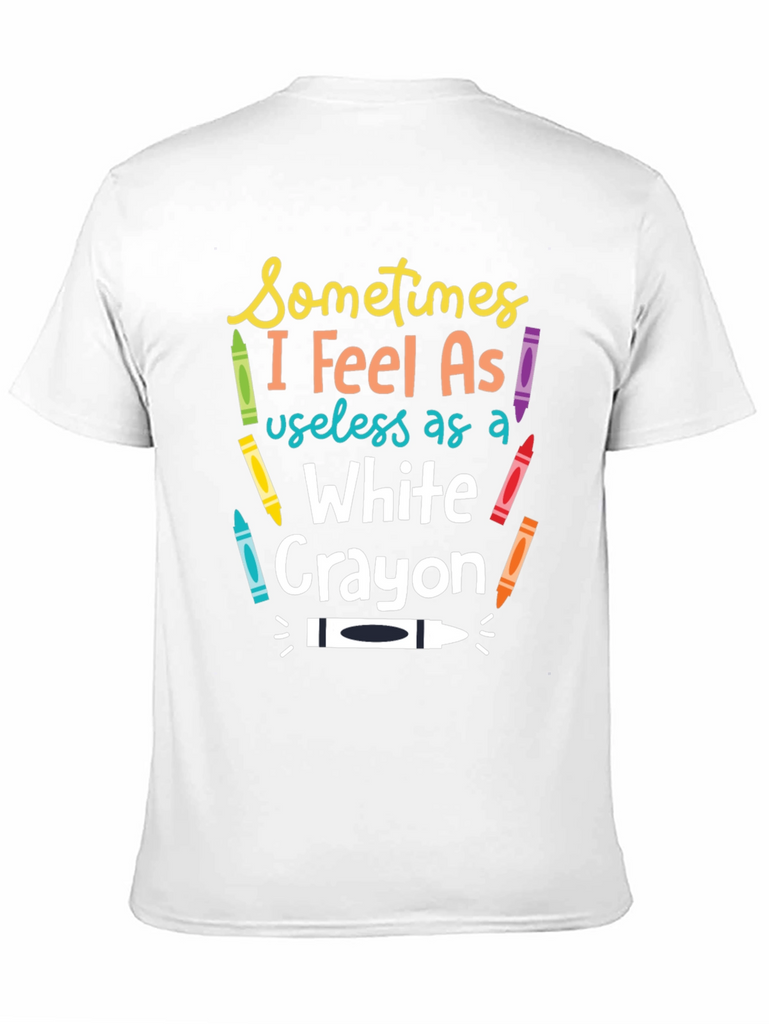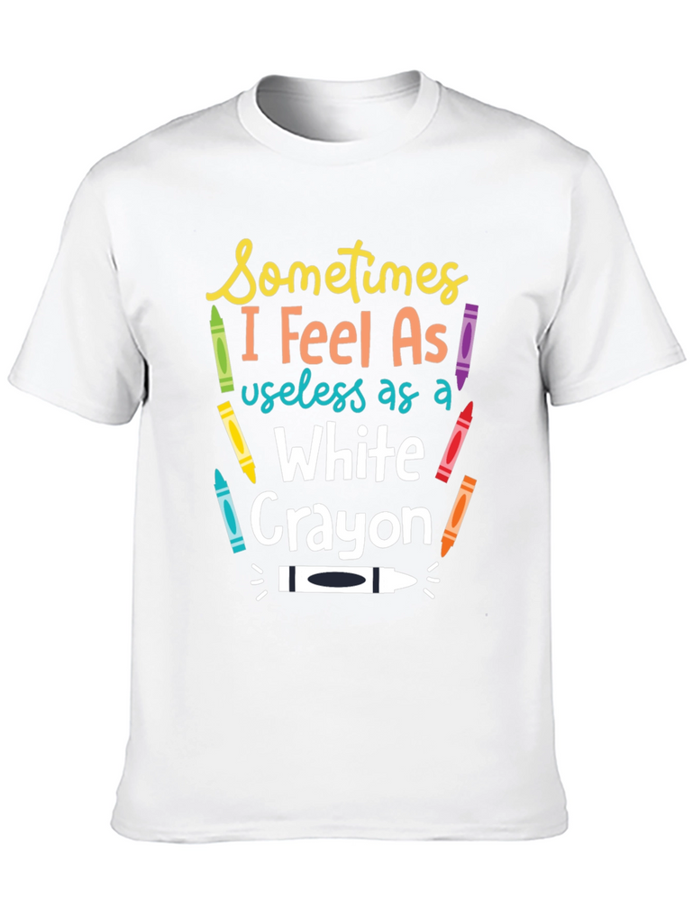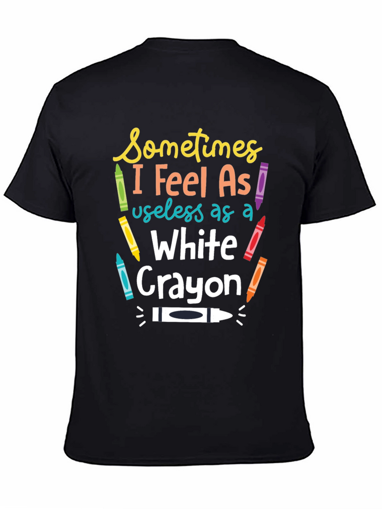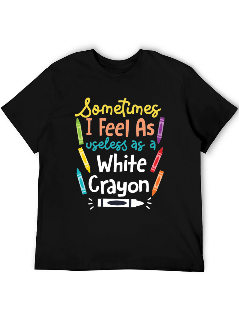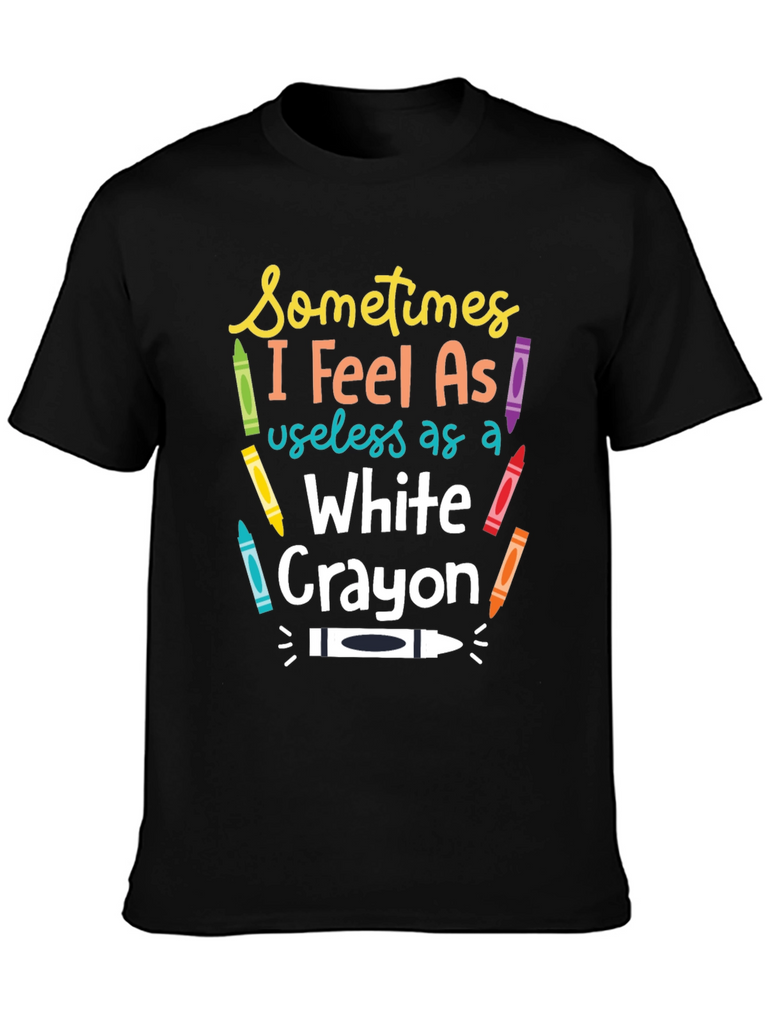 Express your sense of humor with this black graphic t-shirt. The shirt features a playful design with colorful crayon illustrations and the witty phrase "Sometimes I feel as useless as a White Crayon". Made from a soft, comfortable fabric blend, this tee is perfect for casual wear. The classic crew neck and short sleeves make it a versatile addition to any wardrobe. Ideal for teachers, artists, or anyone who enjoys a good laugh, this t-shirt is sure to spark conversation and add a touch of lightheartedness to your day. Get yours today and let your personality shine!