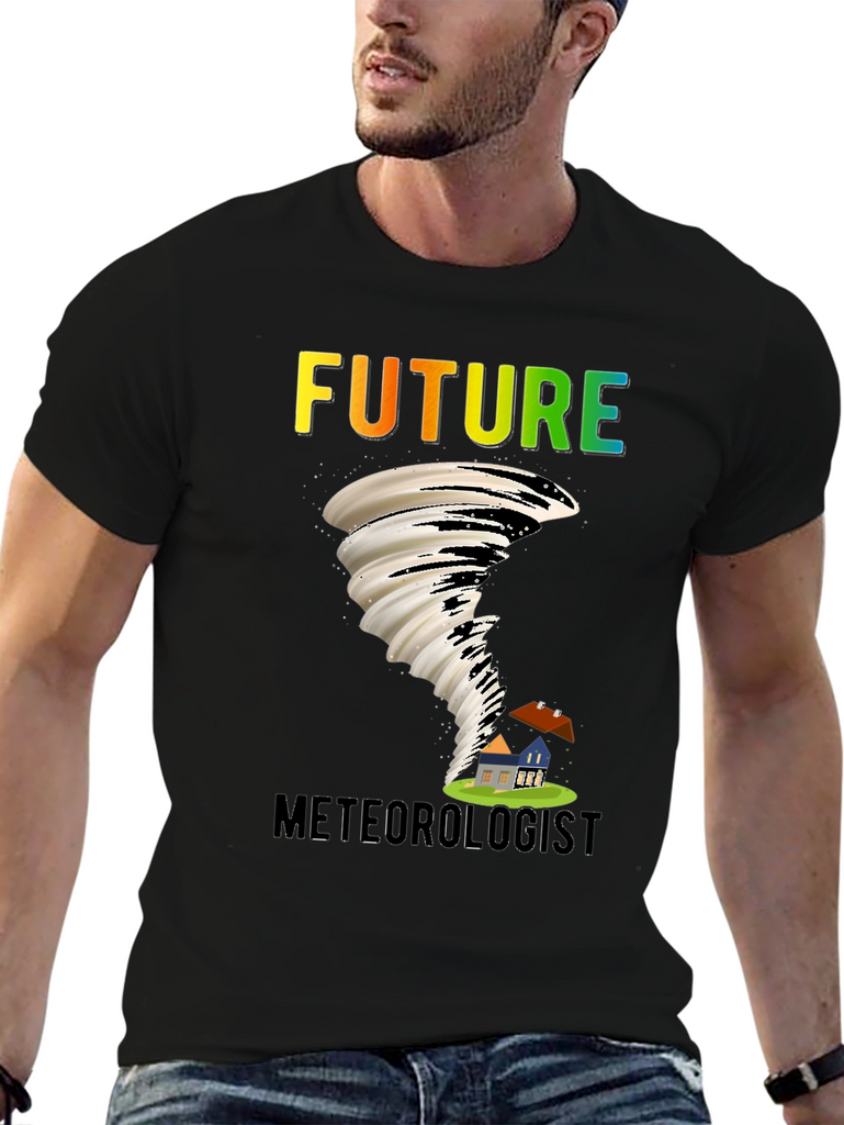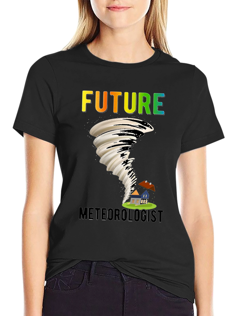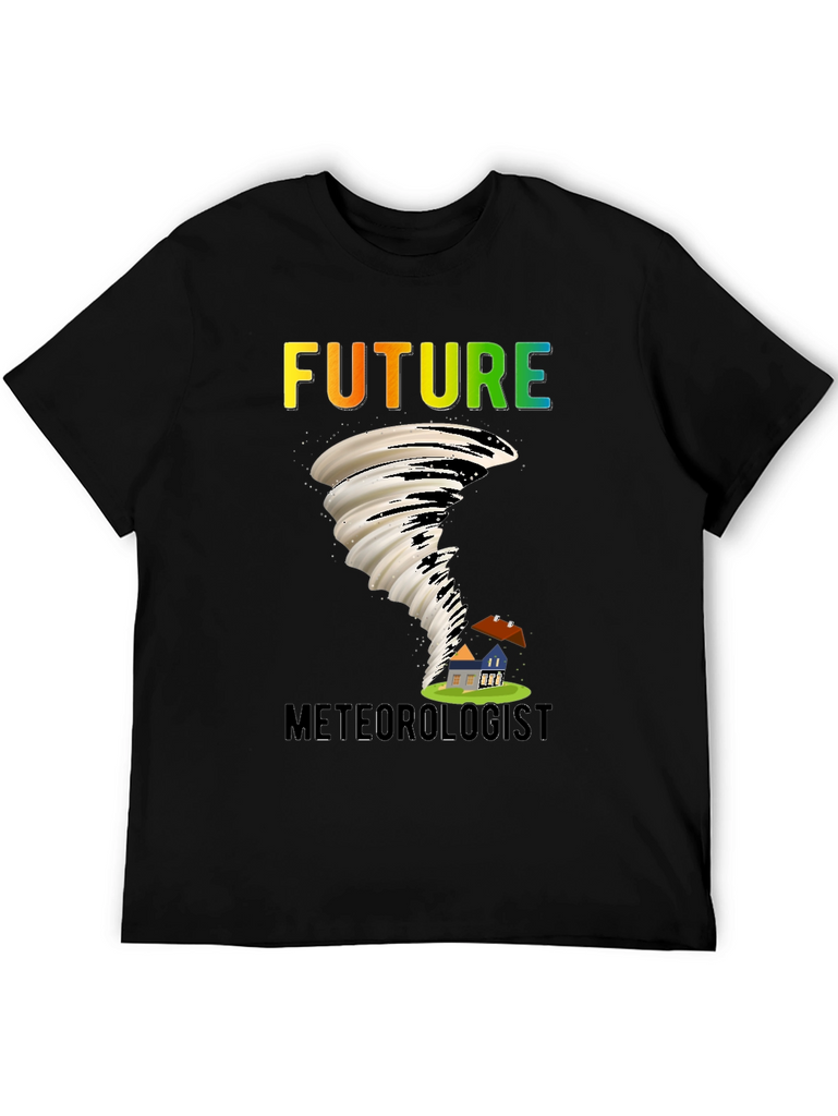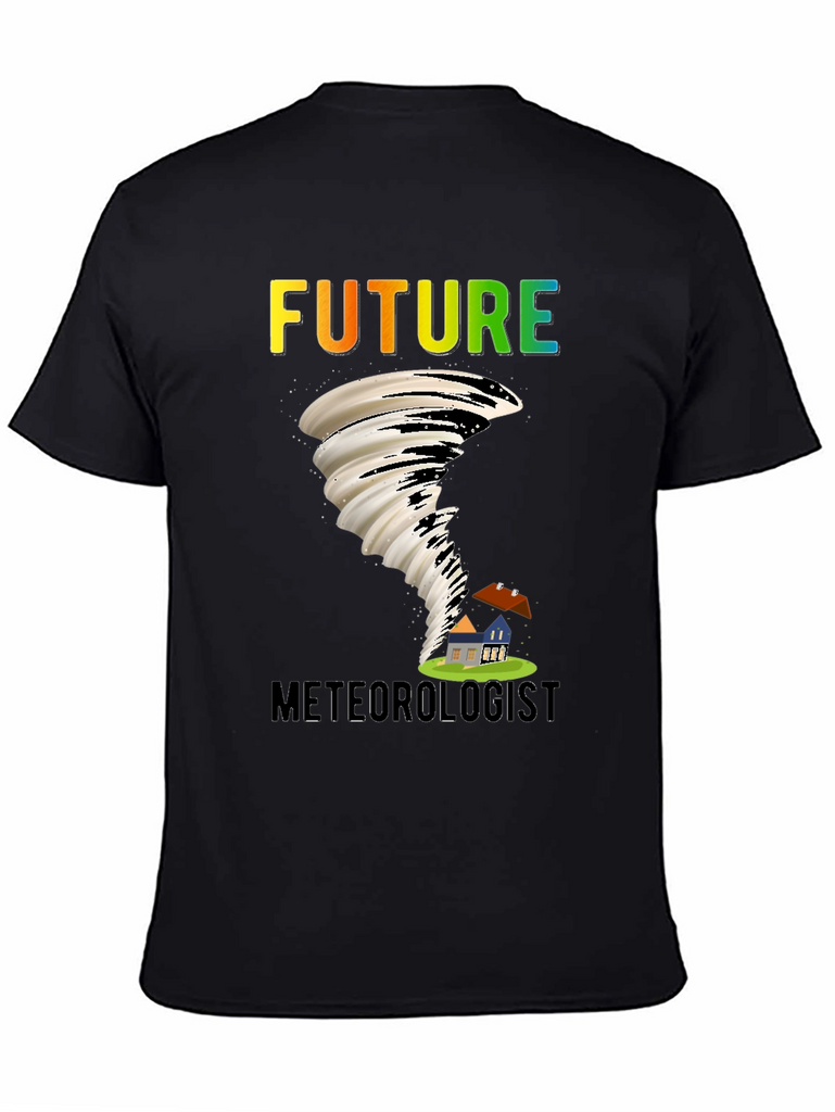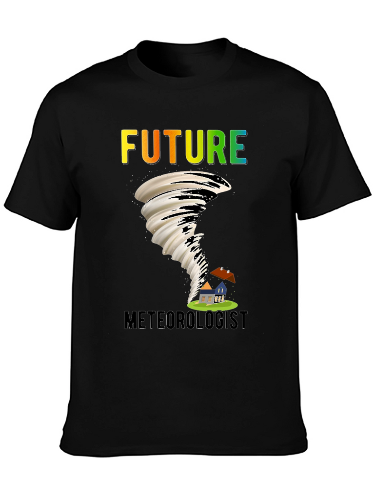This black t-shirt features a bold graphic print perfect for aspiring weather experts. The design showcases a swirling tornado, cleverly positioned above a small house, emphasizing the power of weather phenomena. Above the tornado, the word "FUTURE" is displayed in vibrant, rainbow-gradient letters, adding a pop of color to the dark background. Below, "METEOROLOGIST" is printed in a subtle, shadowed font. Made from a comfortable-looking fabric, this tee is ideal for casual wear, school events, or science-themed activities. Show off your passion for weather with this unique and eye-catching t-shirt!