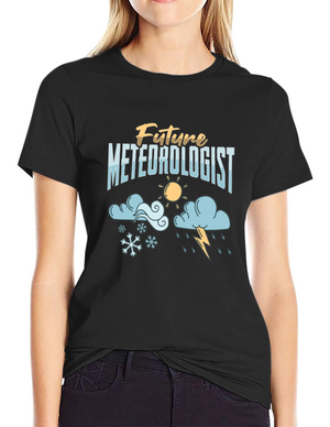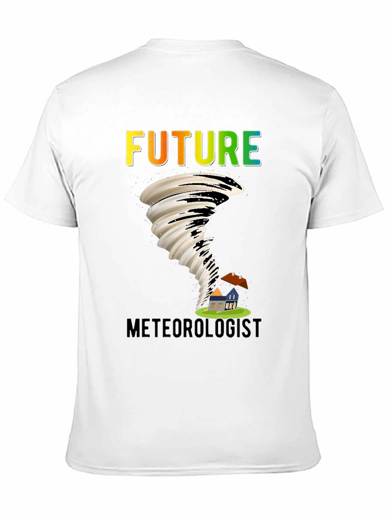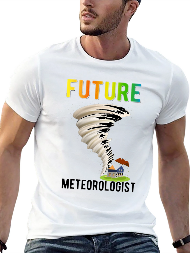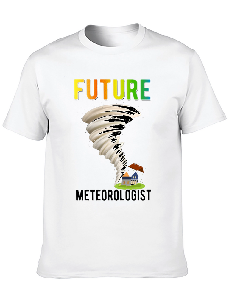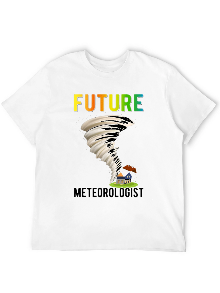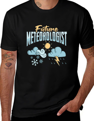 This black t-shirt features a bold graphic print perfect for aspiring weather experts. The design showcases a swirling tornado, cleverly positioned above a small house, emphasizing the power of weather phenomena. Above the tornado, the word "FUTURE" is displayed in vibrant, rainbow-gradient letters, adding a pop of color to the dark background. Below, "METEOROLOGIST" is printed in a subtle, shadowed font. Made from a comfortable-looking fabric, this tee is ideal for casual wear, school events, or science-themed activities. Show off your passion for weather with this unique and eye-catching t-shirt!