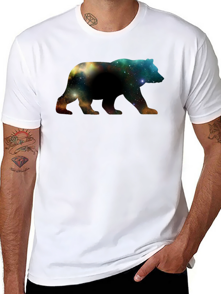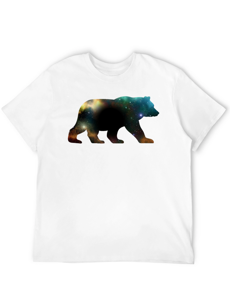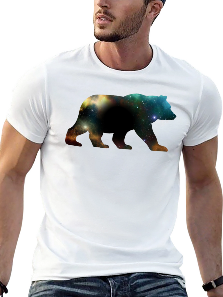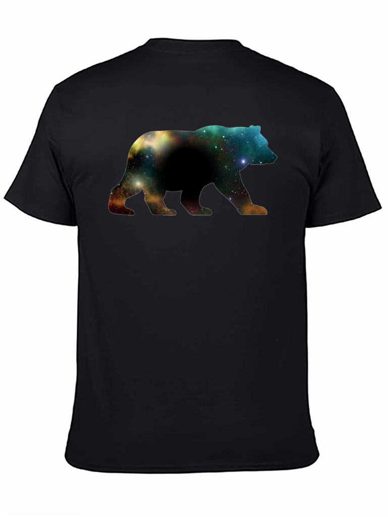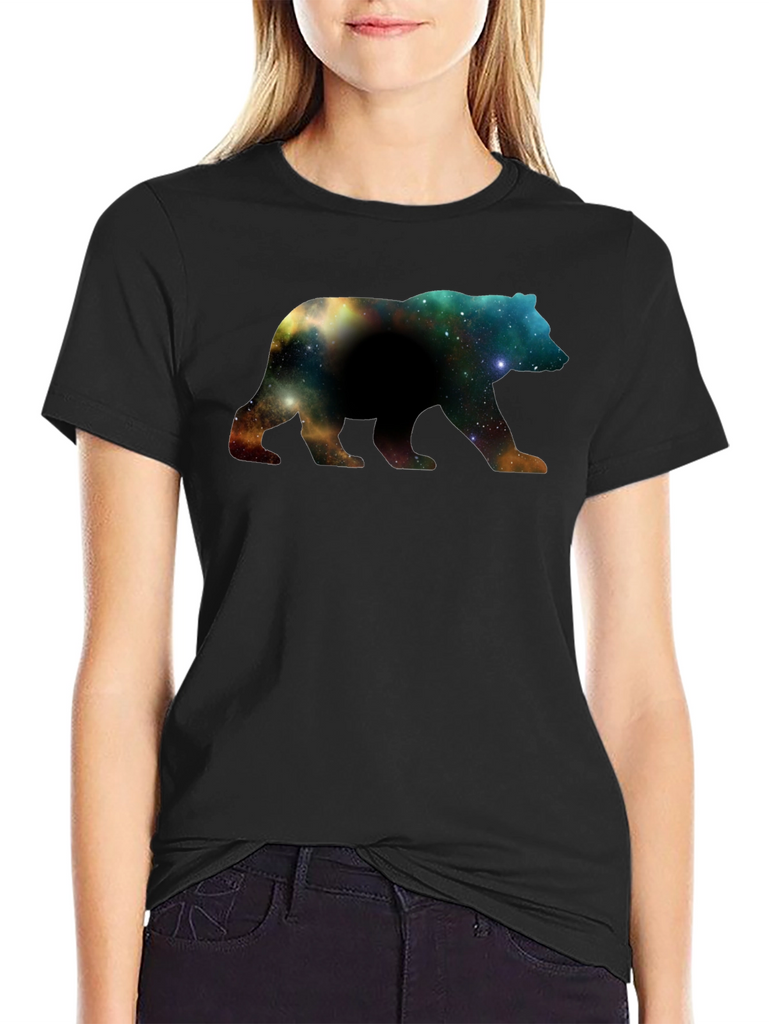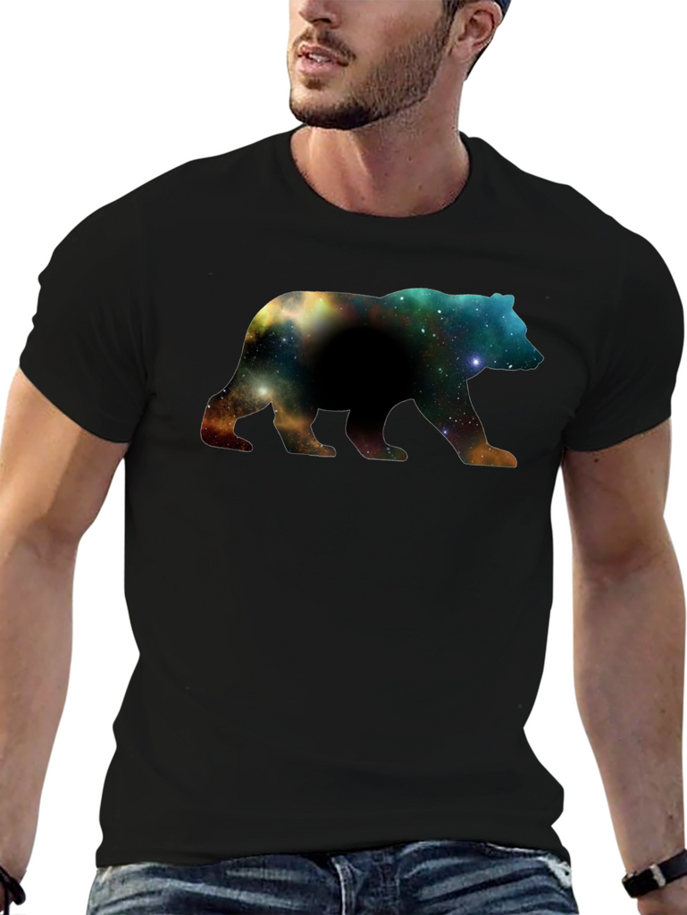 Show off your love for wildlife and the cosmos with this eye-catching black t-shirt. The shirt features a striking bear silhouette filled with a vibrant galaxy design, complete with stars and nebula colors. Made from a soft, breathable fabric, this tee offers both comfort and style, perfect for everyday wear or a casual night out. The bold graphic print makes it a great conversation starter. Ideal for nature enthusiasts, astronomy lovers, or anyone who appreciates unique fashion. Add a touch of the universe to your wardrobe with this standout graphic tee.