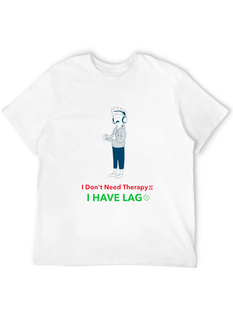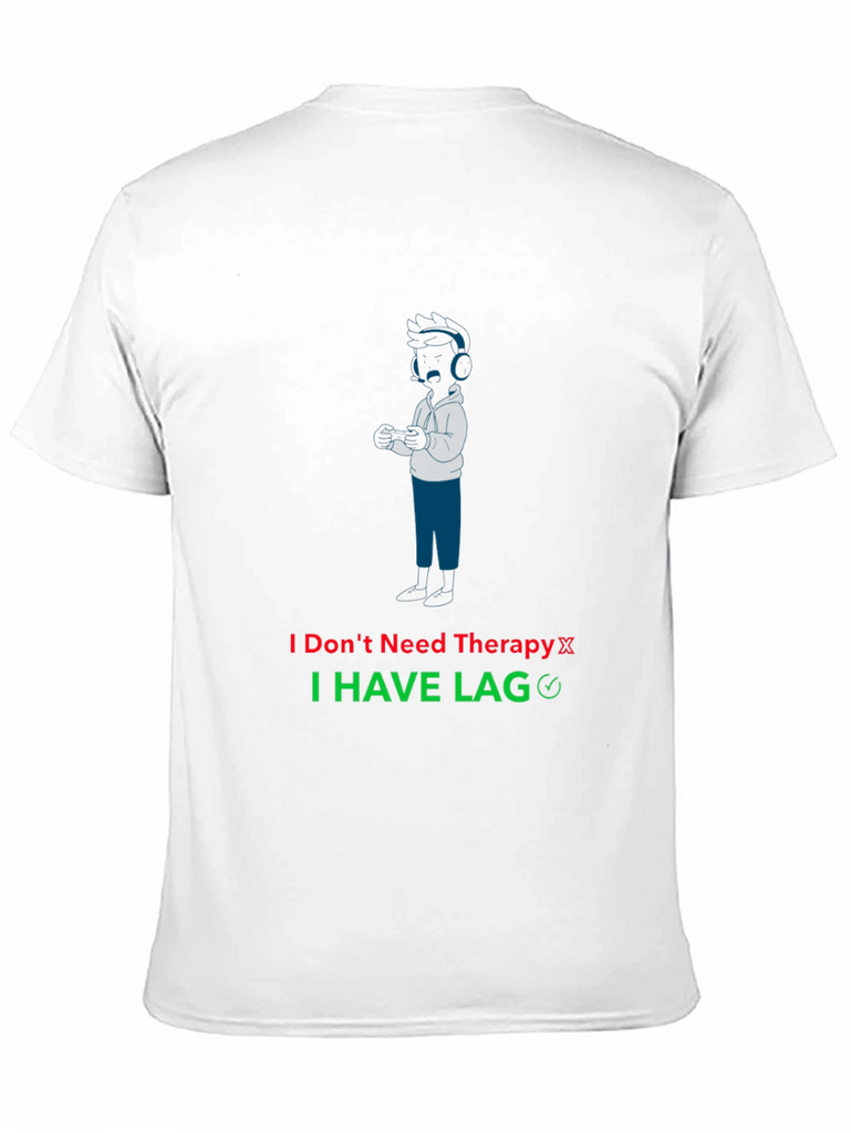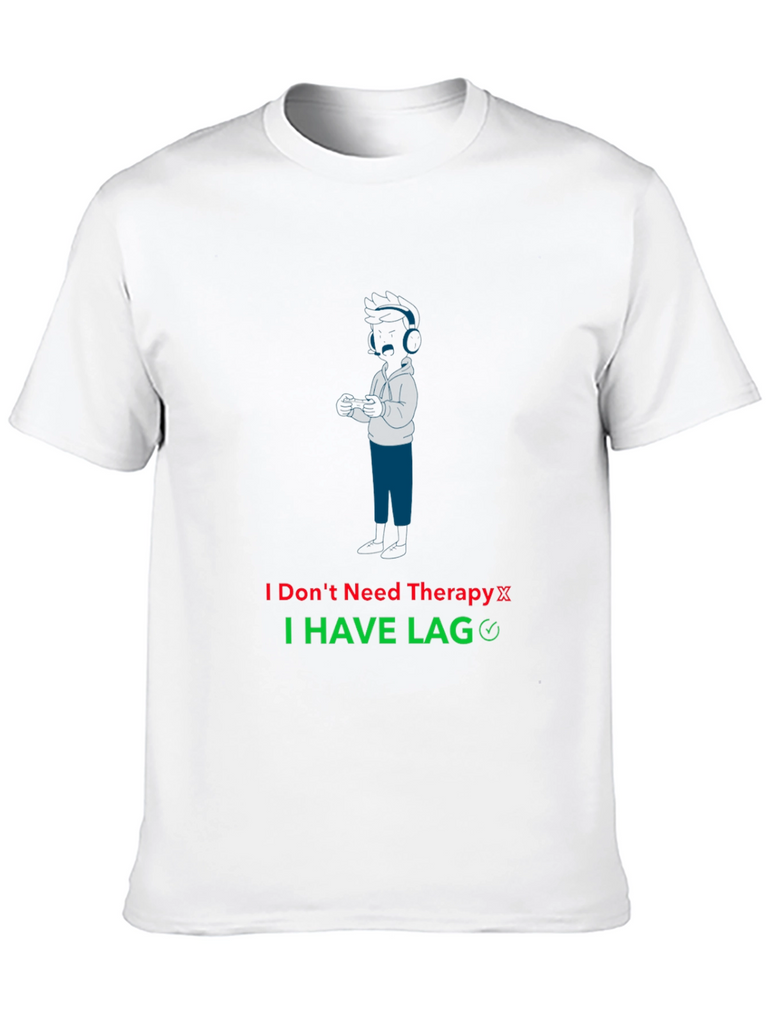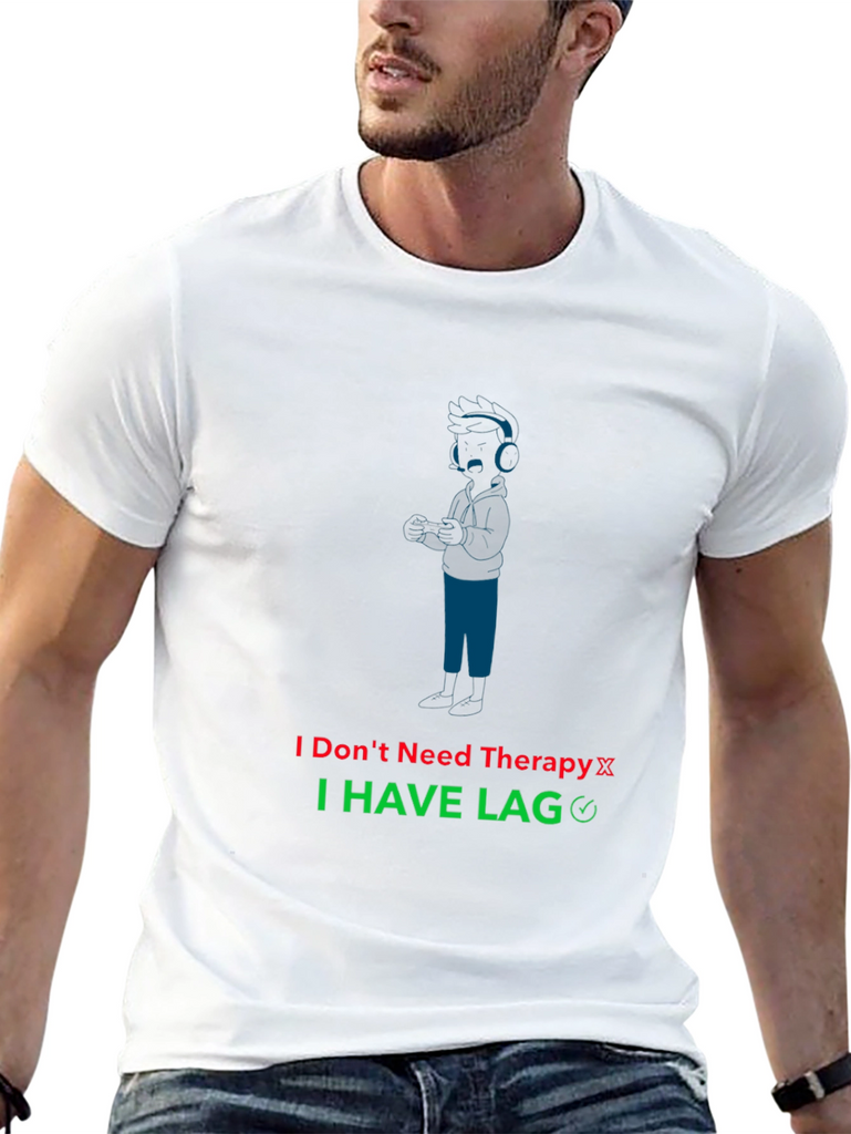 Showcase your gaming humor with this unique black T-shirt. The shirt features a stylized blue graphic of a gamer with headphones, accompanied by the witty text "I Don't Need Therapy I HAVE LAG." The text is displayed in red and green. Made from a comfortable-looking fabric, this tee is perfect for casual wear, gaming sessions, or as a gift for the gamer in your life. Express your love for gaming and make a statement with this eye-catching shirt.