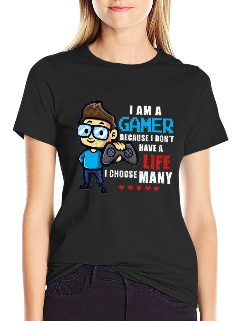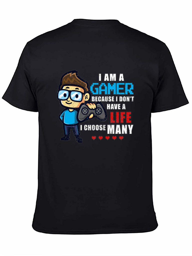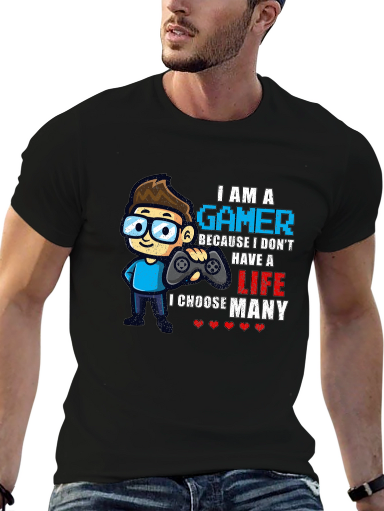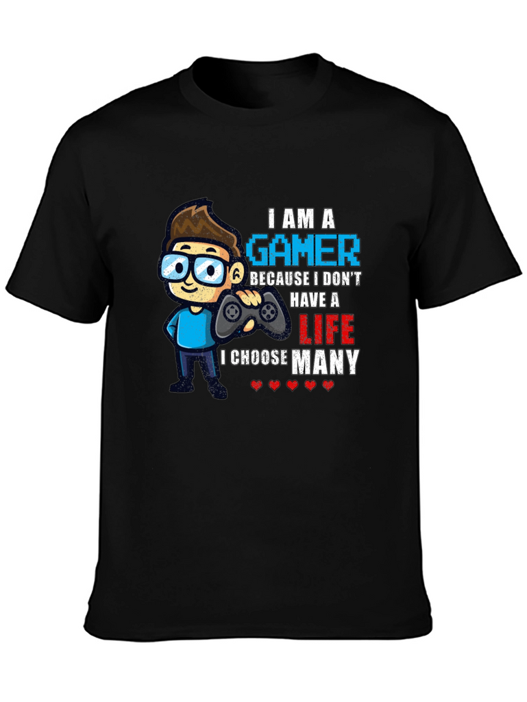 Show off your gaming passion with this humorous black t-shirt! Featuring a fun graphic of a cartoon gamer holding a controller, the tee playfully proclaims, "I am a gamer because I don't have a life I choose many". Made from comfortable, breathable cotton, this shirt is perfect for casual wear, gaming sessions, or hanging out with friends. The eye-catching design and witty slogan make it a great conversation starter. A must-have for any dedicated gamer looking to add a touch of humor to their wardrobe. Comfortable, stylish, and sure to get a laugh!