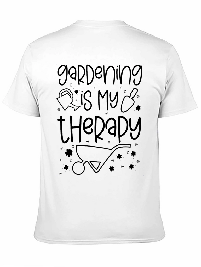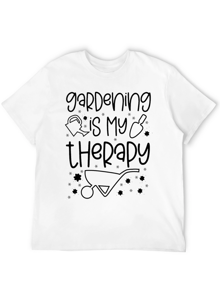 Show off your love for gardening with this stylish black t-shirt. Featuring the phrase 'gardening is my therapy' along with gardening-themed graphics like a watering can, trowel, and wheelbarrow, this shirt is perfect for any plant enthusiast. The classic crew neck and relaxed fit ensure all-day comfort whether you're tending to your garden, running errands, or simply relaxing at home. Made from a soft, breathable fabric, this t-shirt is a great addition to any casual wardrobe. Express your passion for gardening and enjoy the comfort and style of this unique t-shirt.
