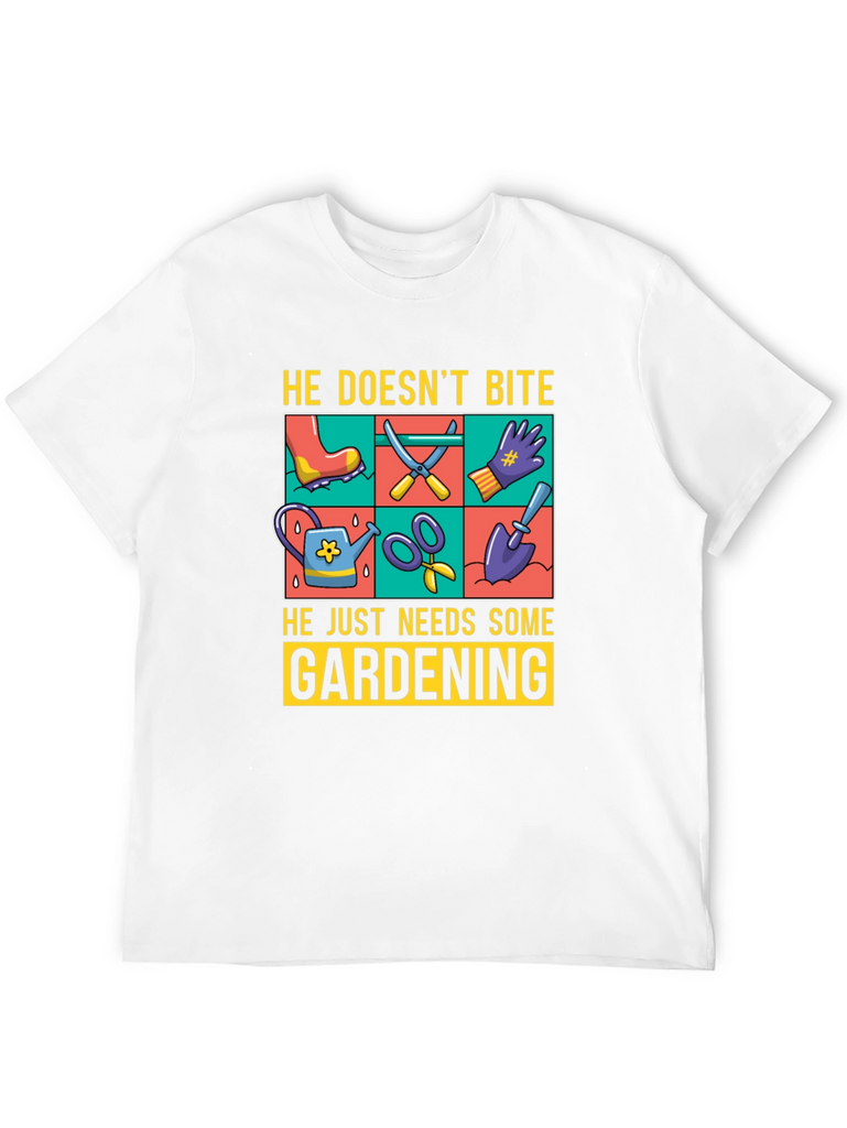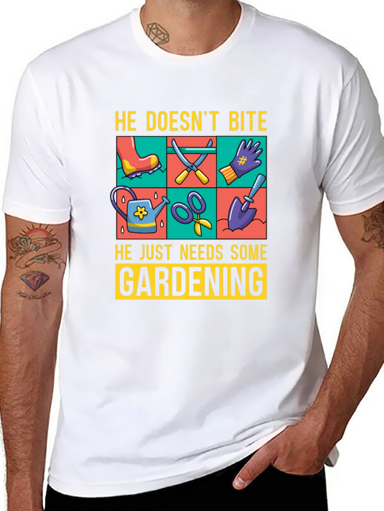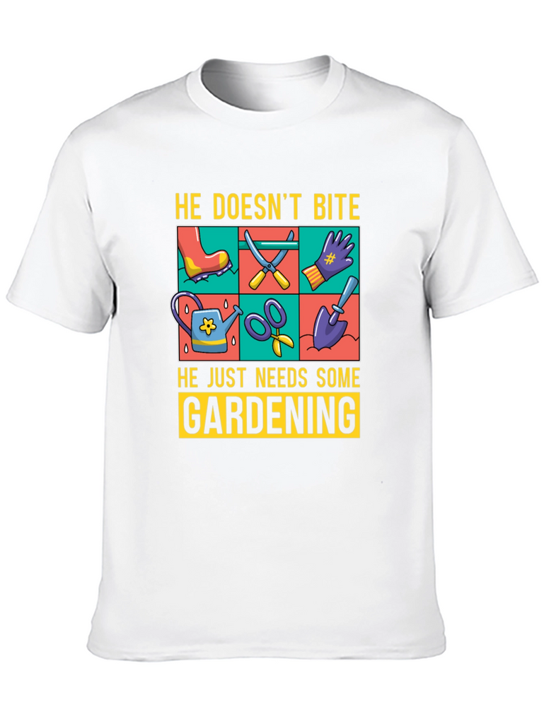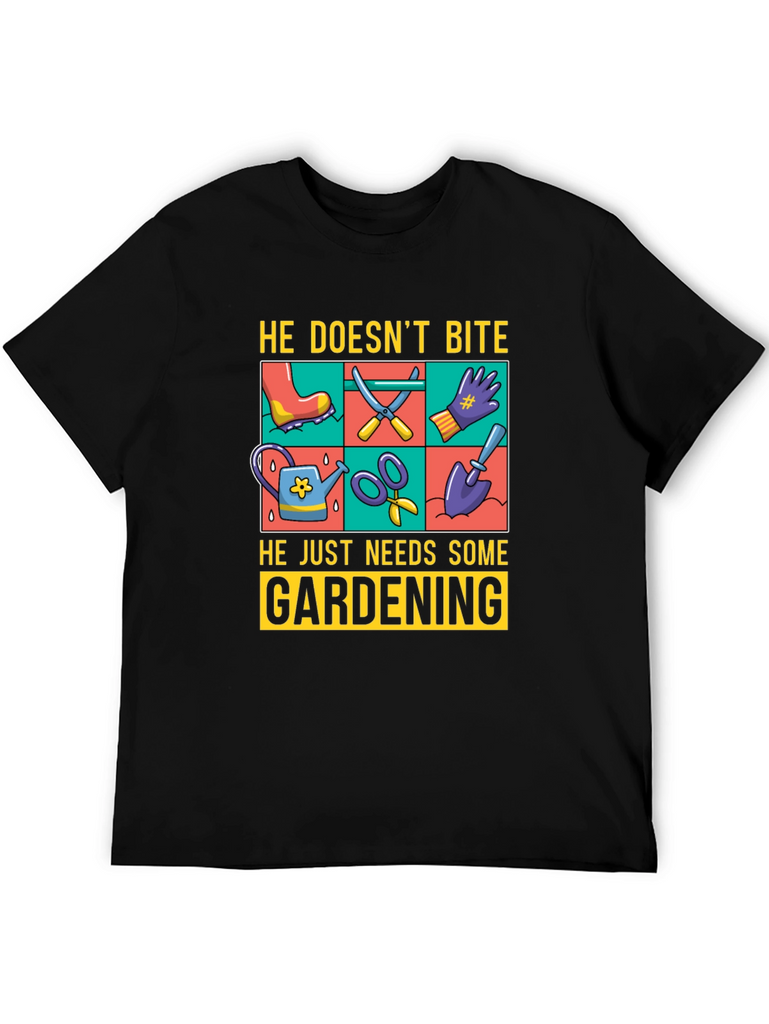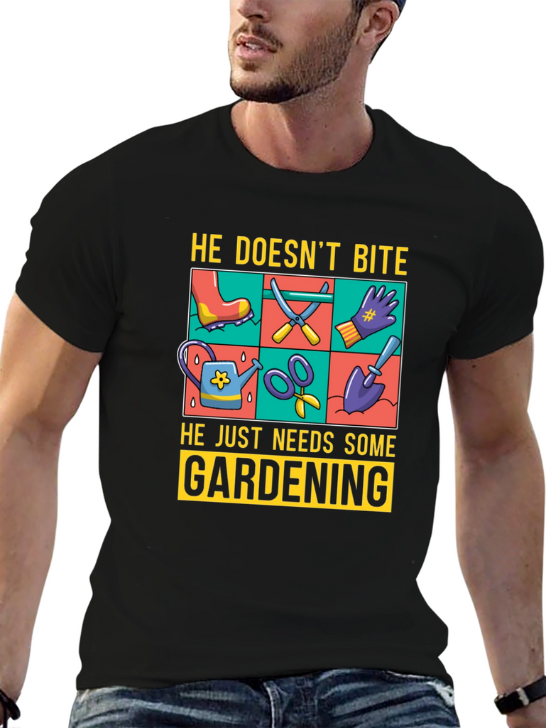 Show off your love for gardening with this fun graphic t-shirt. The design features gardening tools such as a watering can, scissors, a shovel, and gloves, displayed in a vibrant, colorful grid. Above the tools, the text reads "He Doesn't Bite", and below them, "He Just Needs Some Gardening". Made from a comfortable, breathable fabric, this tee is perfect for casual wear while you tend to your garden or any other relaxed setting. The classic fit and soft material ensure all-day comfort. Ideal for gardeners and plant enthusiasts alike.