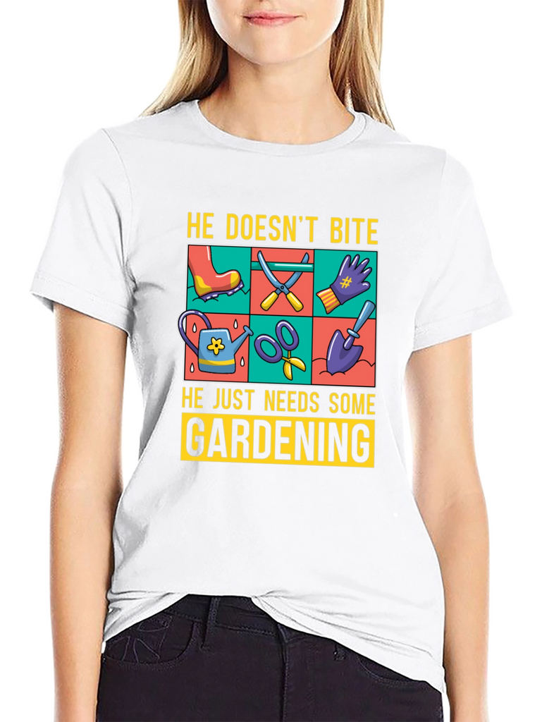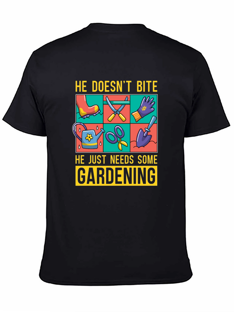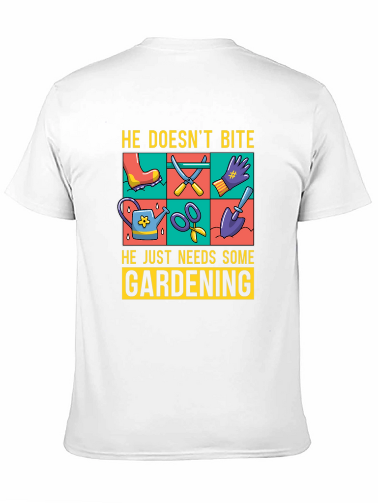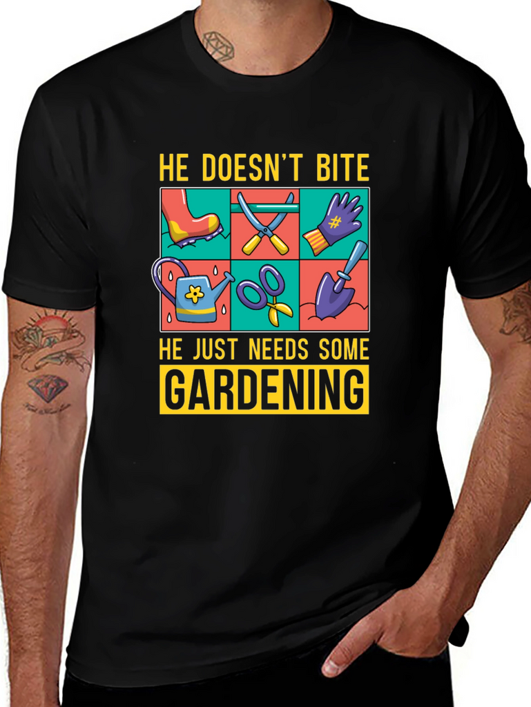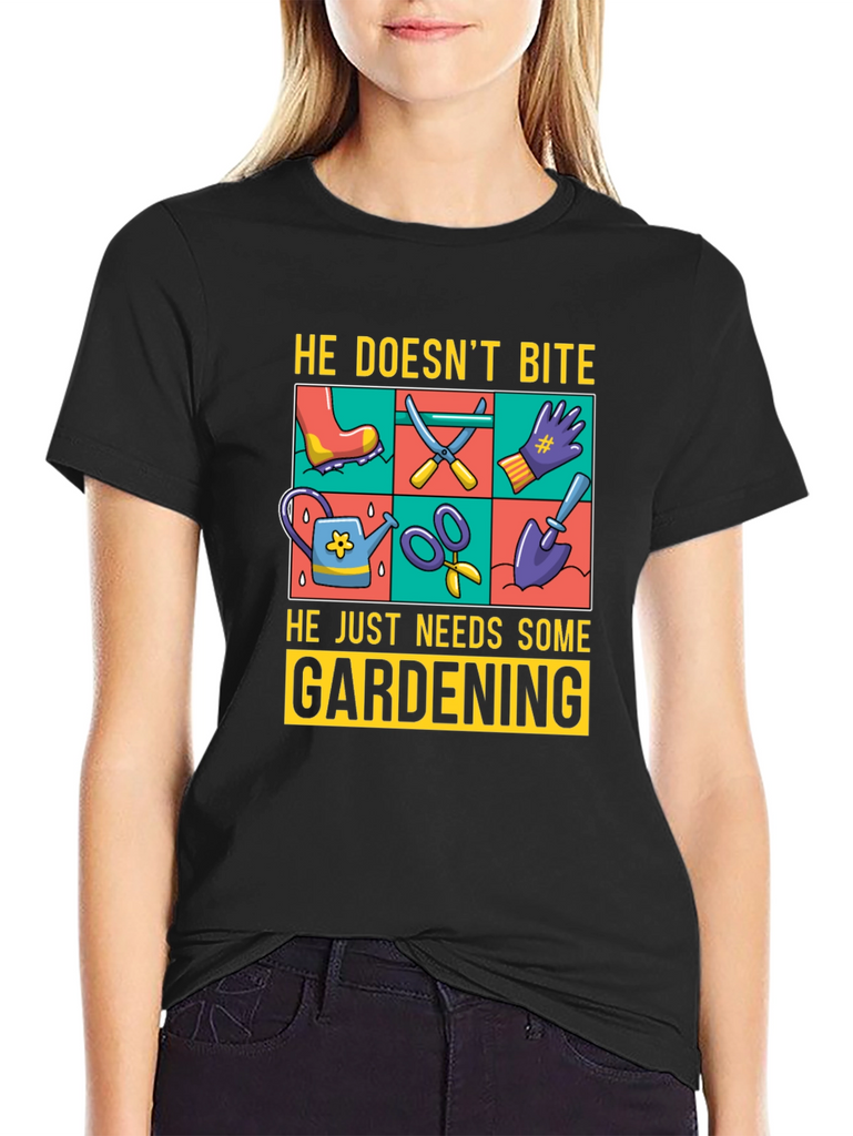 Show off your love for gardening with this fun graphic t-shirt. The design features gardening tools such as a watering can, scissors, a shovel, and gloves, displayed in a vibrant, colorful grid. Above the tools, the text reads "He Doesn't Bite", and below them, "He Just Needs Some Gardening". Made from a comfortable, breathable fabric, this tee is perfect for casual wear while you tend to your garden or any other relaxed setting. The classic fit and soft material ensure all-day comfort. Ideal for gardeners and plant enthusiasts alike.