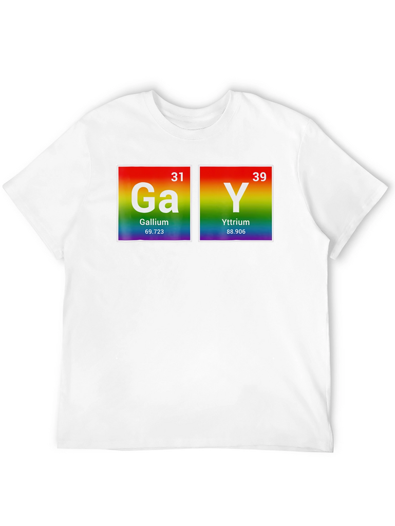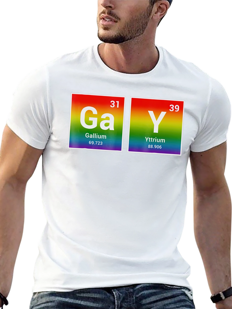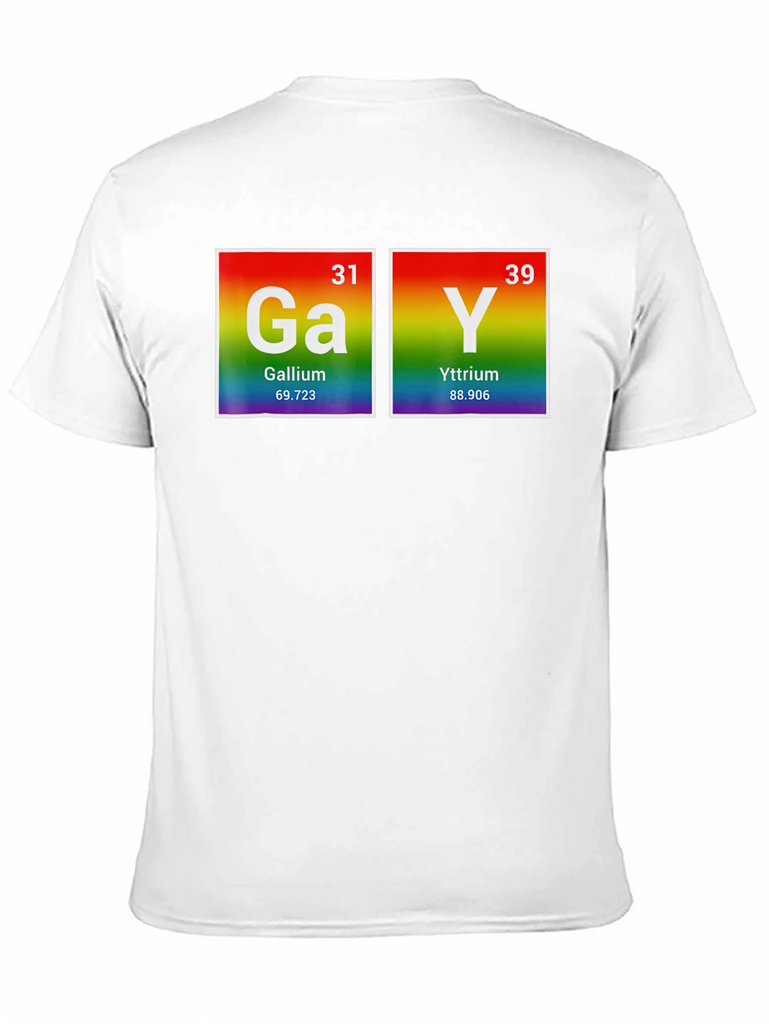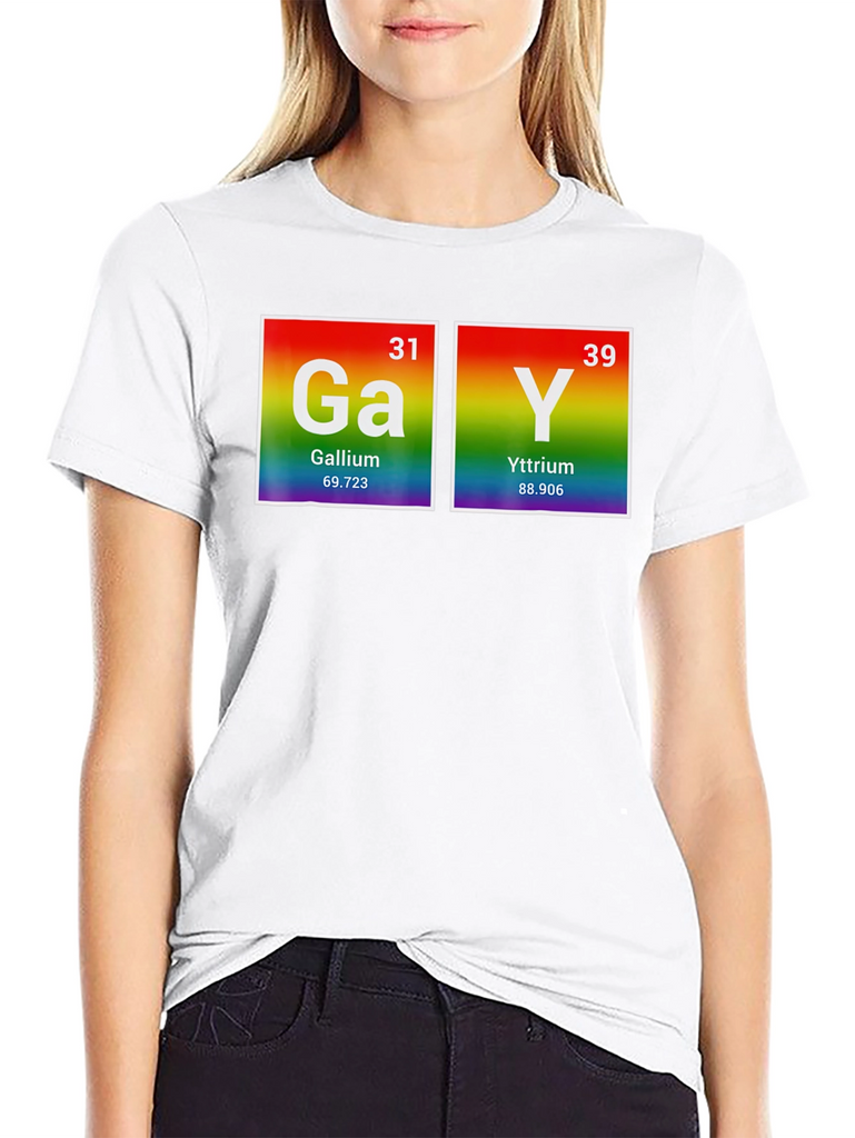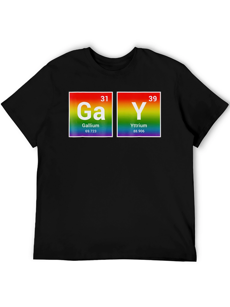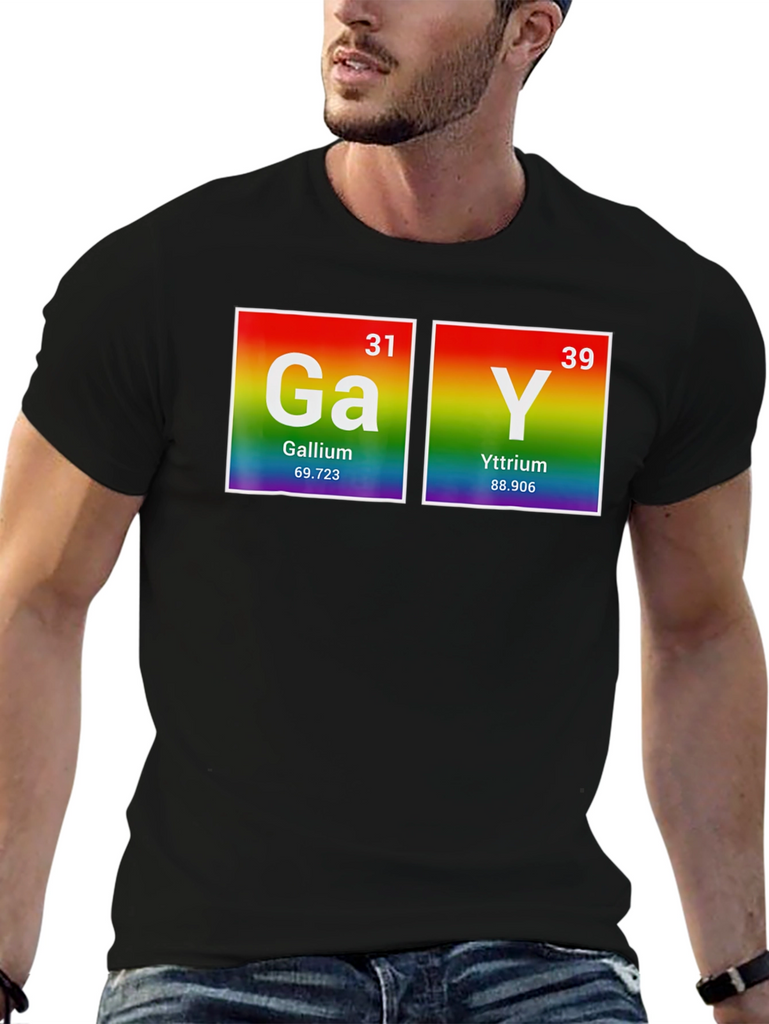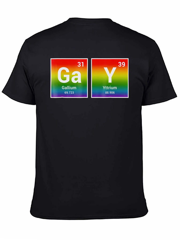 Show your pride with this eye-catching black t-shirt featuring a unique twist on the periodic table! The design showcases 'Ga' for Gallium and 'Y' for Yttrium. Each element block is colored in a vibrant rainbow pattern, representing the LGBTQ+ pride flag. This tee is a comfortable and stylish way to express yourself. Ideal for pride parades, casual wear, or as a gift for someone special. Get yours today and celebrate love and science in style!