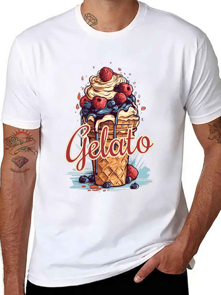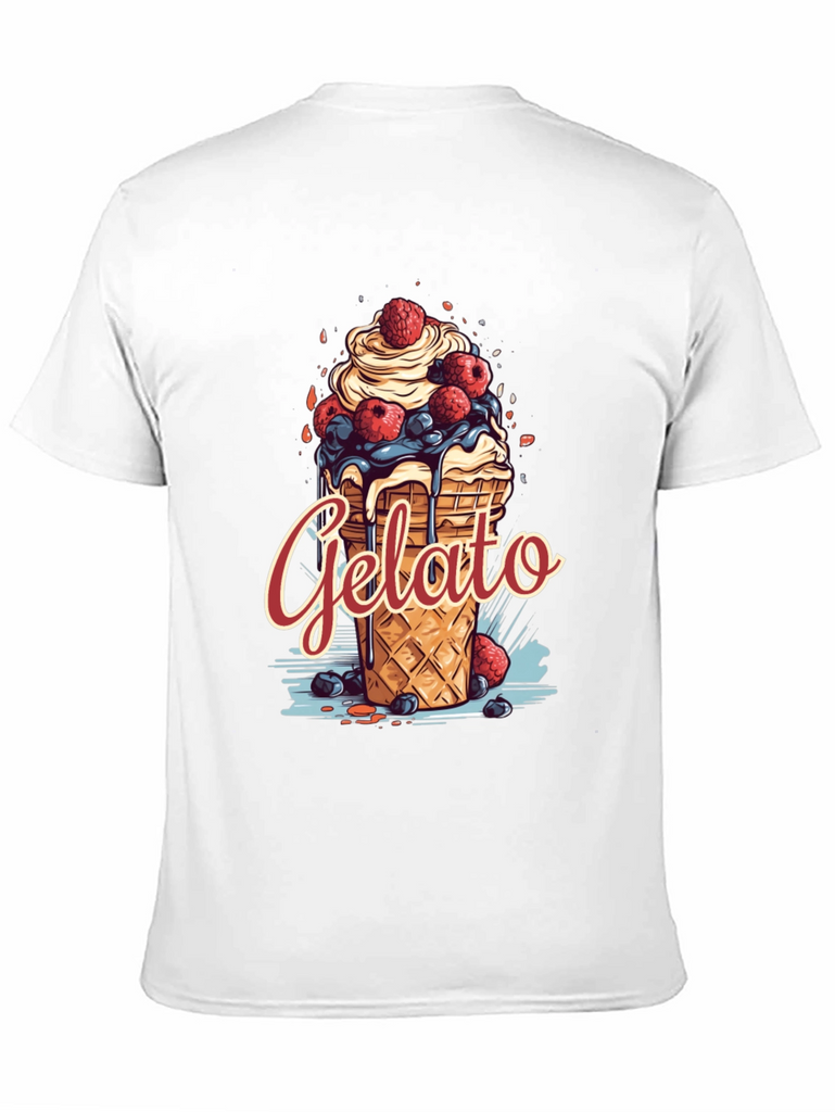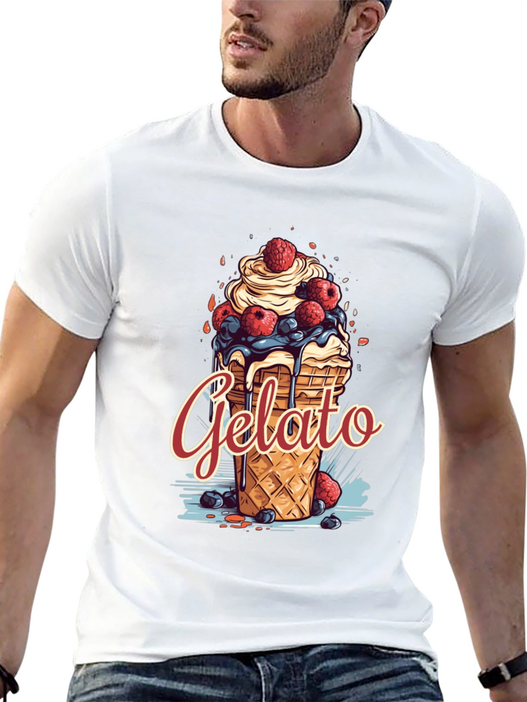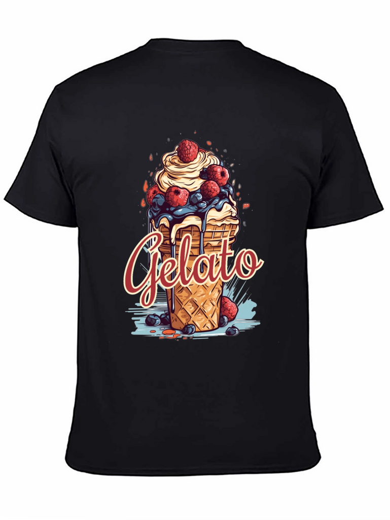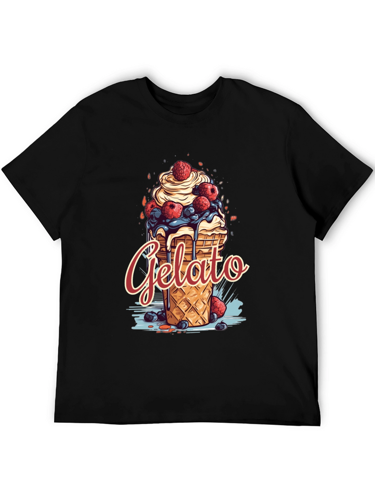 Indulge your sweet tooth with this unique gelato-themed graphic t-shirt. Made from soft, breathable fabric, this black tee features a vibrant and detailed illustration of a towering gelato cone topped with whipped cream, fresh berries, and rich chocolate drizzle. The word "Gelato" is stylishly printed alongside the delicious-looking treat. Perfect for casual outings, ice cream socials, or simply expressing your love for all things sweet, this t-shirt is a fun and eye-catching addition to any wardrobe. Show off your dessert enthusiasm in style! Perfect for gifting to the ice cream lover in your life.