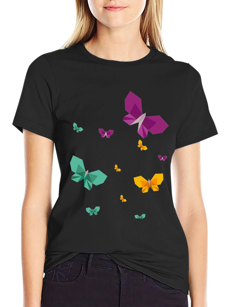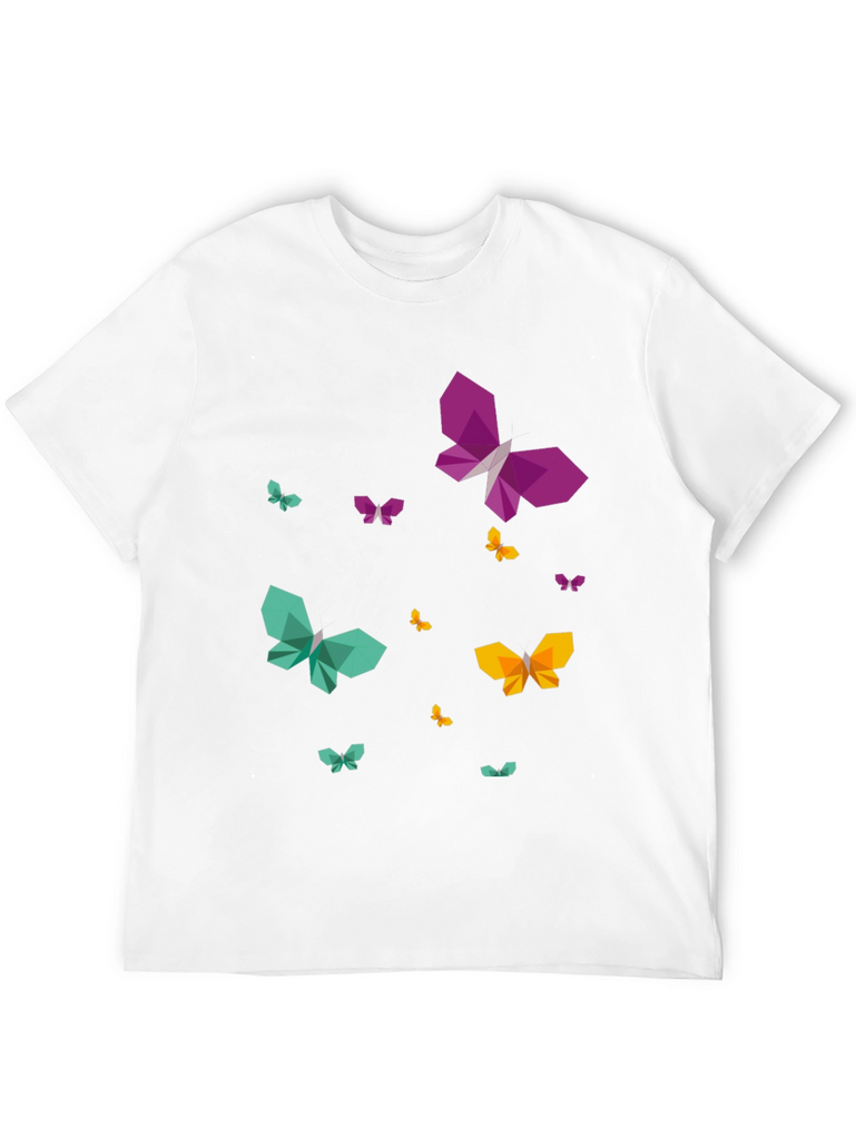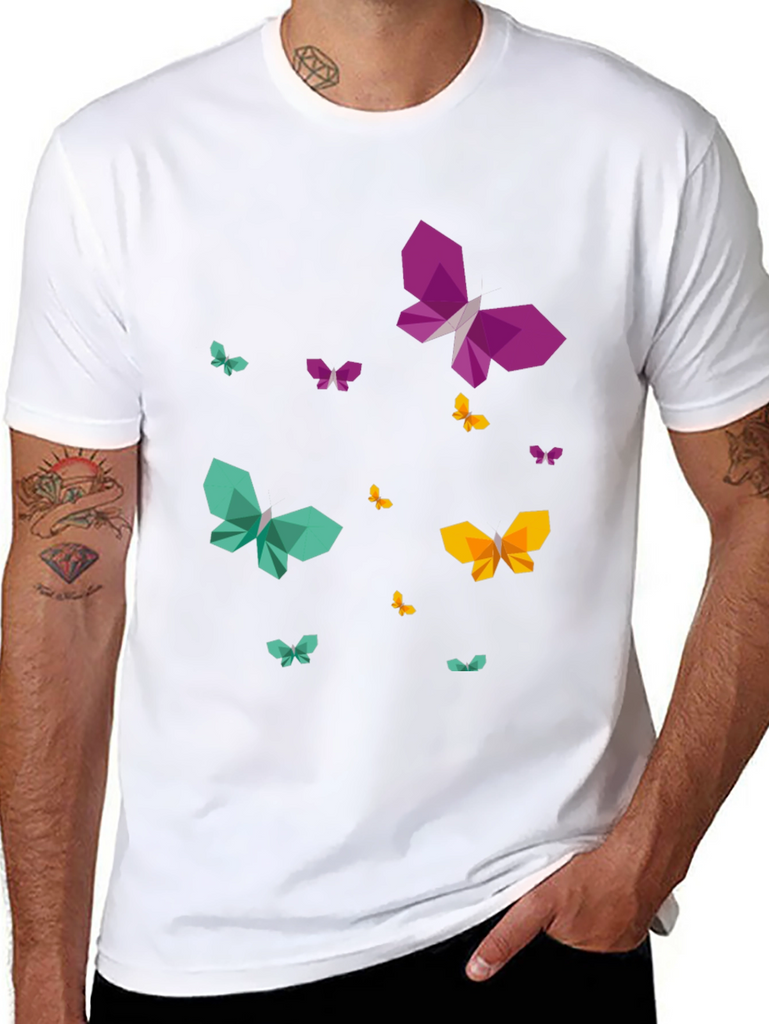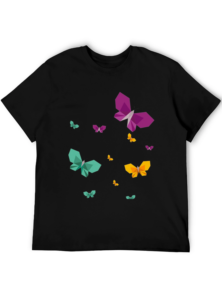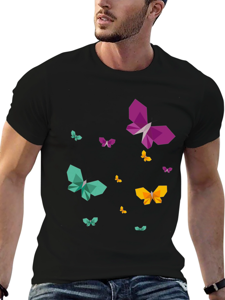 Show off your unique style with this eye-catching men's black t-shirt. This tee features a distinctive geometric butterfly design, with an assortment of butterflies in purple, teal, and yellow hues scattered across the chest. The modern, polygonal style gives it a sophisticated edge. Crafted from a comfortable, breathable fabric, this t-shirt is perfect for casual outings, parties, or just relaxing at home. The classic black color ensures easy pairing with jeans, shorts, or chinos. Make a statement with this stylish and artistic piece!