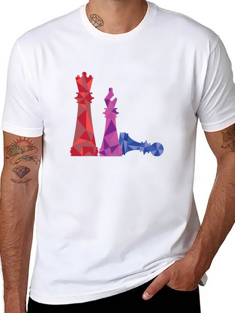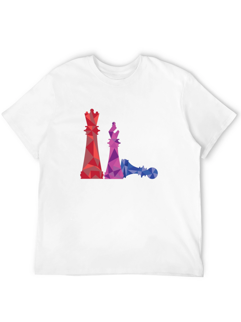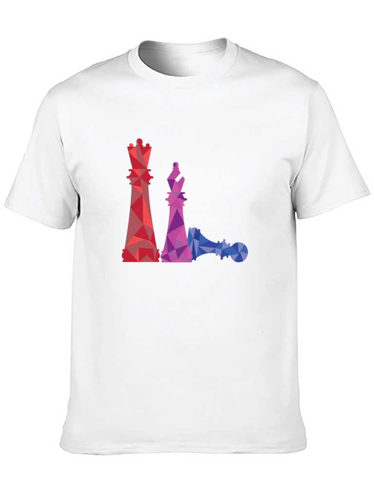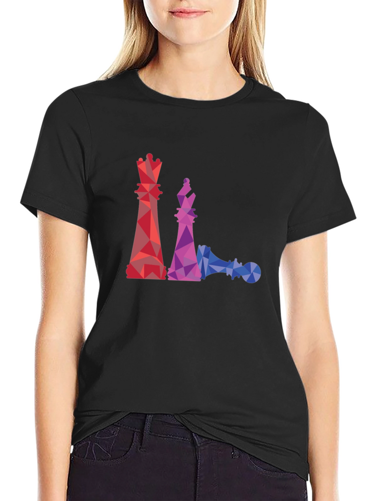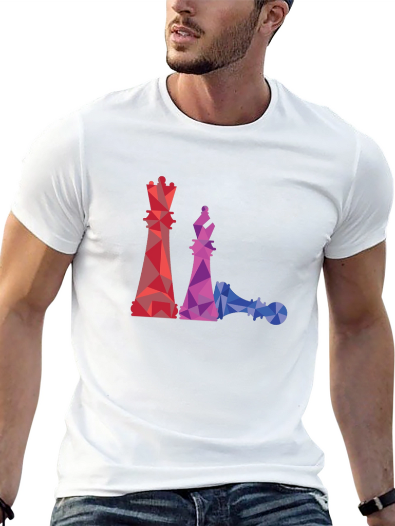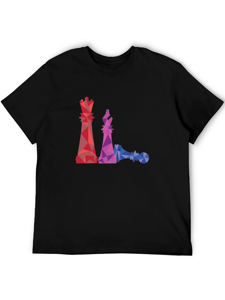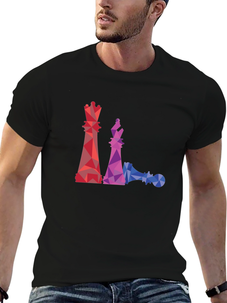 This black t-shirt features a striking geometric design of chess pieces, including a queen, bishop, and a fallen pawn. The graphics are rendered in a vibrant, colorful polygonal style, with red, purple, and blue hues creating a modern and eye-catching look. Made from a comfortable material, this tee is perfect for casual wear and showcasing your love for the game of chess. Pair it with jeans or shorts for a relaxed yet stylish outfit. A unique and artistic piece that's sure to spark conversation!