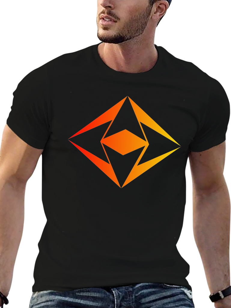 This stylish black t-shirt features a striking geometric diamond design. The design is a gradient of orange and yellow. The shirt appears to be made of a soft, comfortable fabric, ideal for everyday wear. Its classic fit makes it suitable for various body types and can be easily paired with jeans, shorts, or casual trousers. Perfect for casual outings, the gym, or lounging at home, this t-shirt adds a modern touch to any wardrobe. Its eye-catching design will make you stand out in the crowd. This t-shirt offers both style and comfort, making it a great addition to your collection.