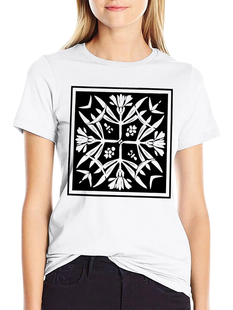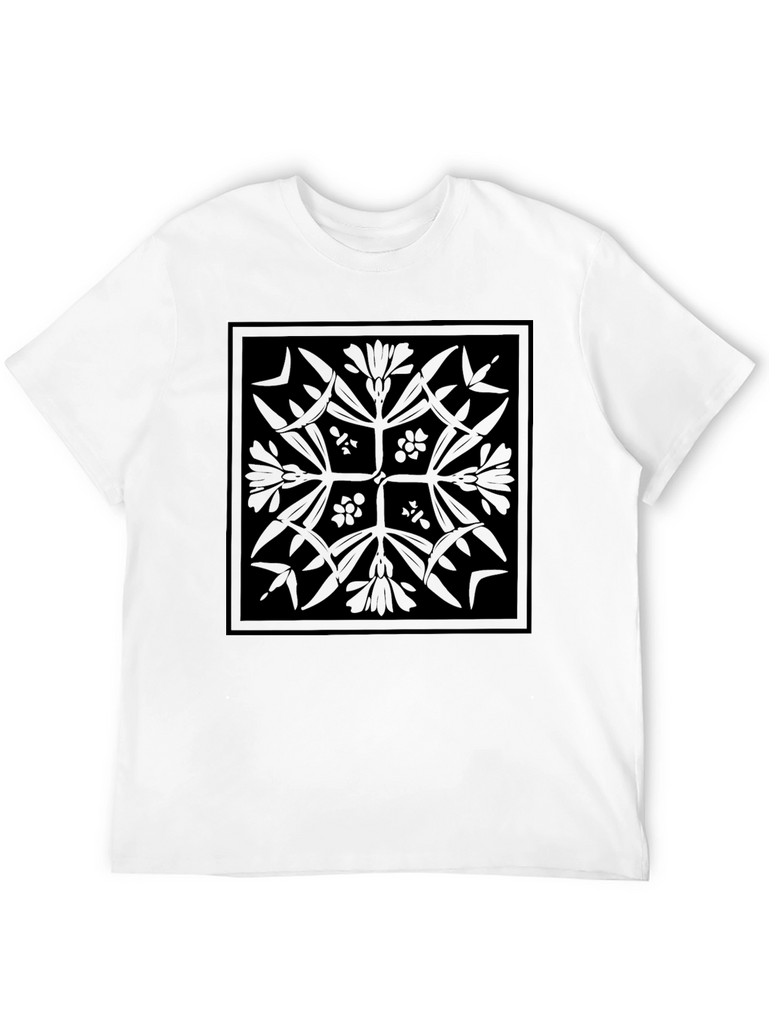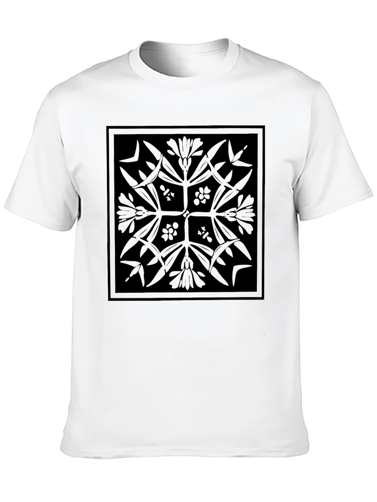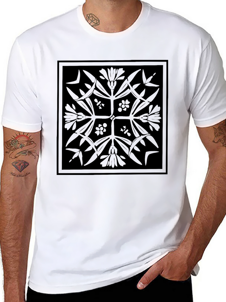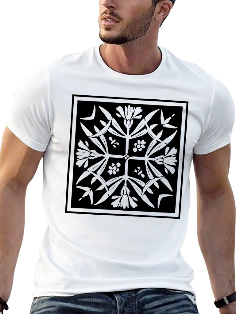 Elevate your casual wardrobe with this stylish black t-shirt featuring a unique geometric floral design. The intricate pattern, printed in a subtle black-on-black style, creates a sophisticated and understated look. Made from a soft and comfortable fabric, this tee is perfect for everyday wear. Pair it with jeans for a relaxed vibe or dress it up with chinos for a more refined style. Its distinctive design ensures you'll stand out in a crowd. A versatile piece for any modern wardrobe.