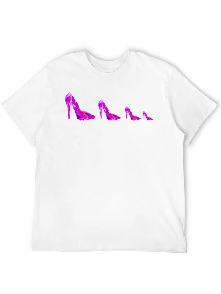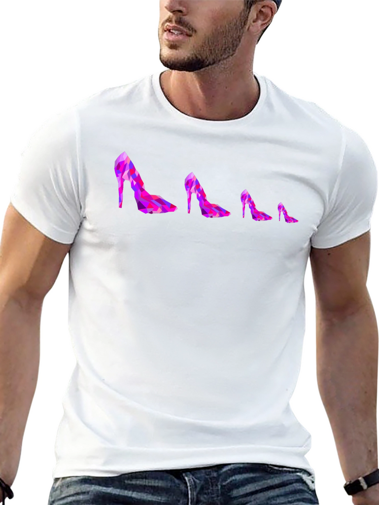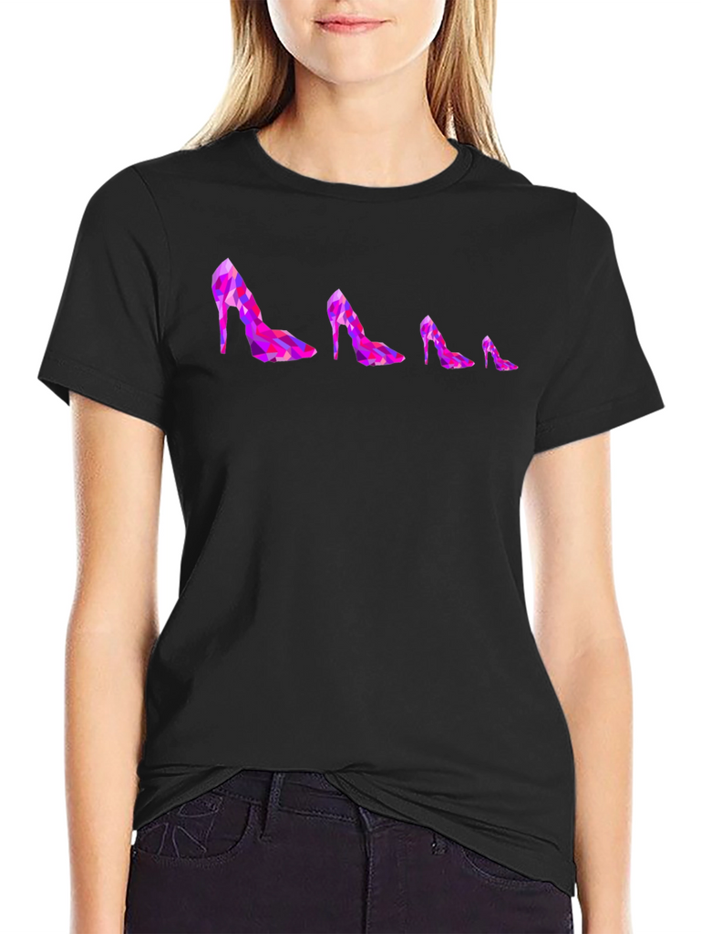 This black t-shirt features a stylish graphic design of four high heel shoes, arranged in a row and decreasing in size from left to right. The heels are rendered in a modern, geometric style with pink and magenta polygons creating a vibrant and eye-catching effect. Made from a comfortable fabric, this tee offers a relaxed fit, perfect for casual wear. It's a great way to add a touch of chic sophistication to your everyday look. Ideal for those who love fashion-forward designs and want to express their style effortlessly. The shirt is well-suited for casual outings, parties, or even as a unique gift for the shoe lover in your life.