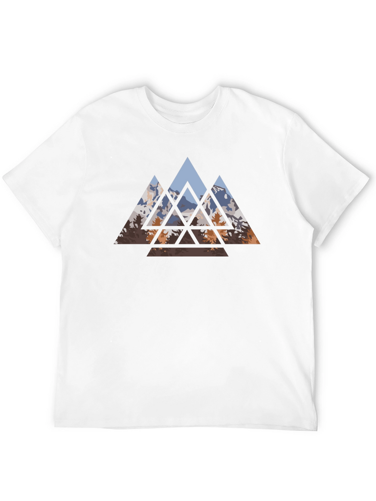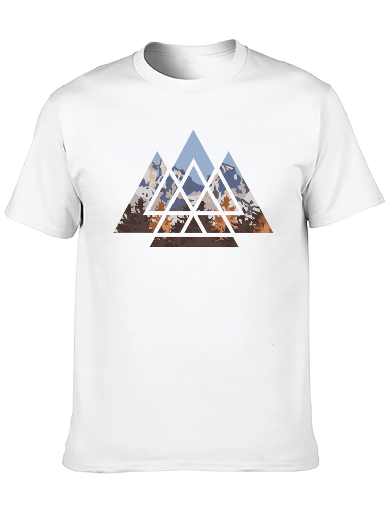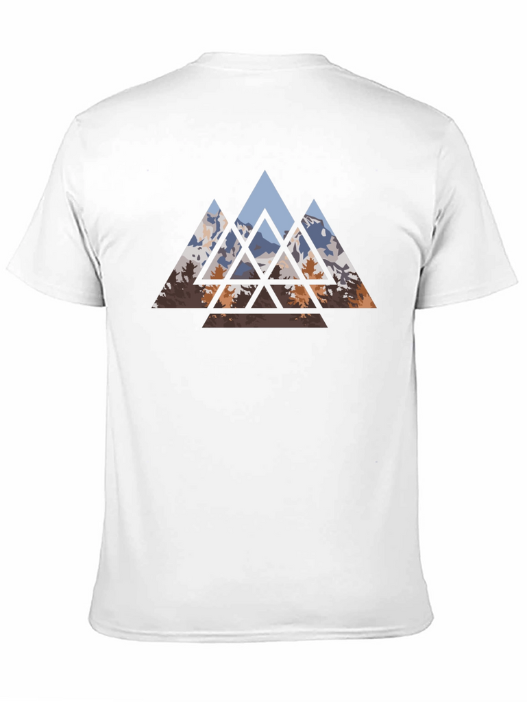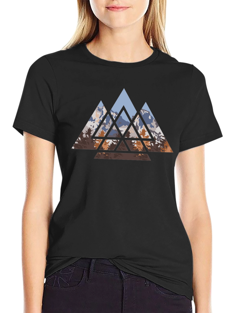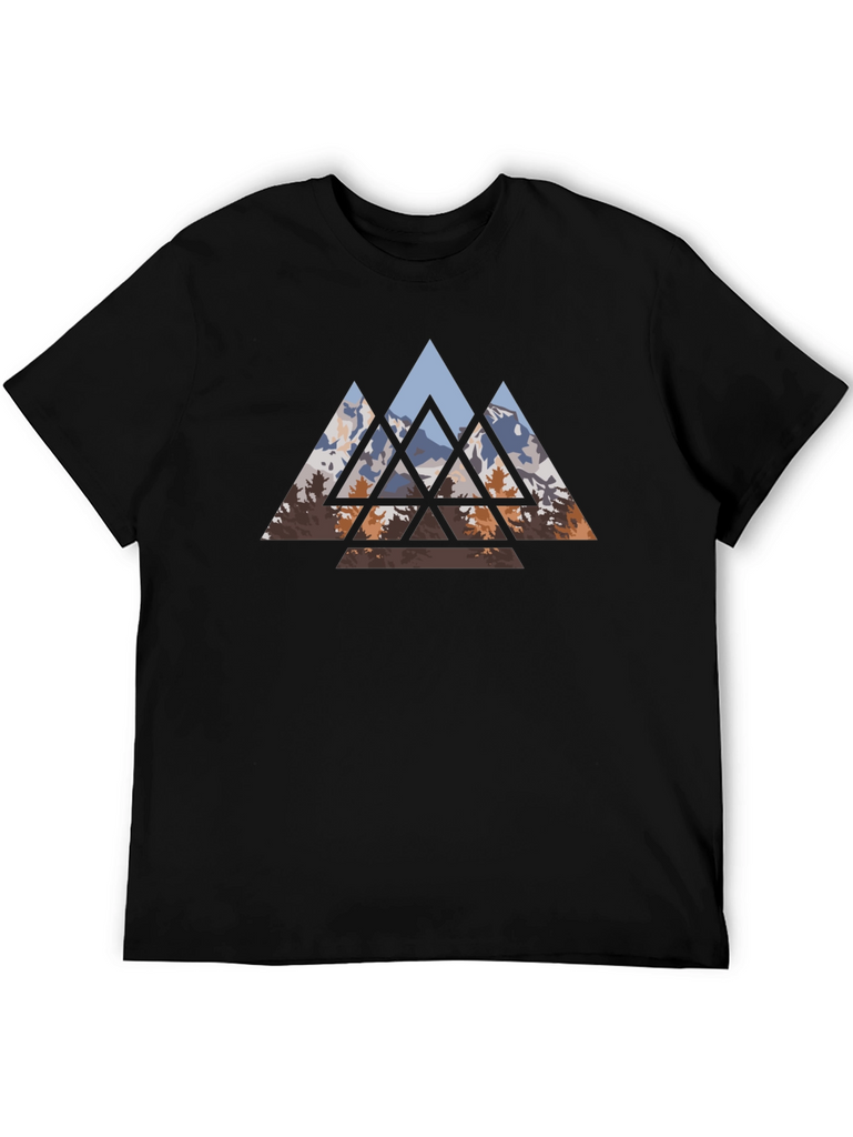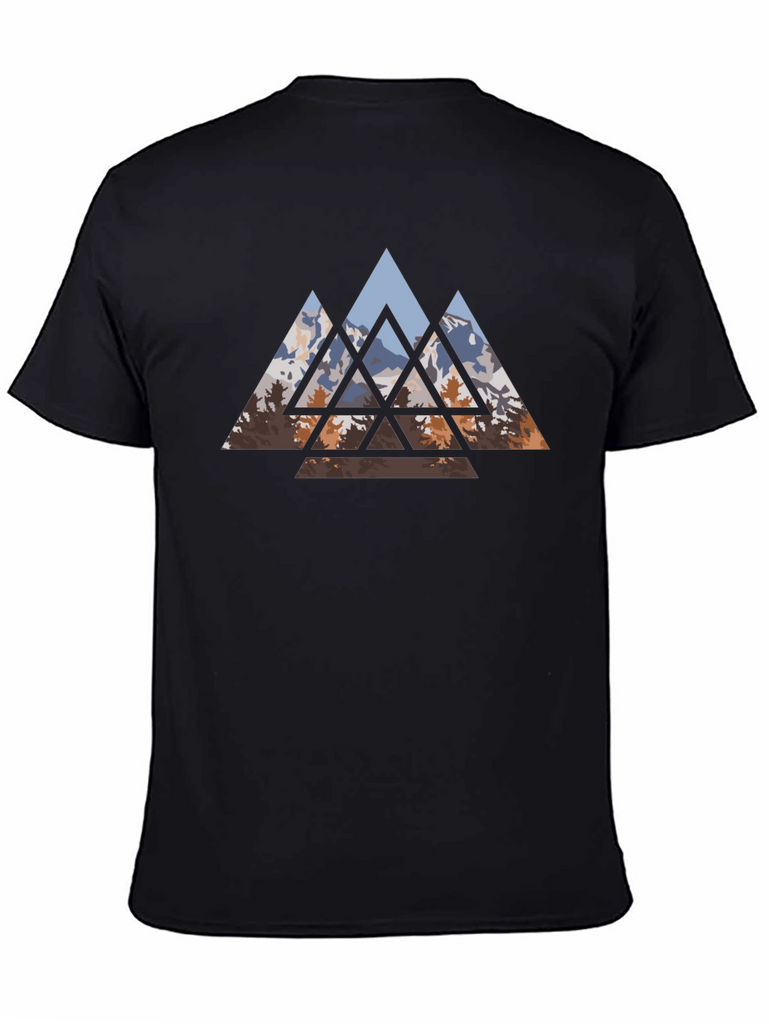 Embrace nature-inspired style with this striking black t-shirt. It features a captivating geometric design of mountains and trees. The triangular shapes create a modern, artistic look, perfect for casual outings or everyday wear. Made from comfortable fabric, this tee offers both style and ease. Showcase your love for the outdoors with this unique and eye-catching design. Stand out from the crowd and express your individual style with this versatile and trendy t-shirt.