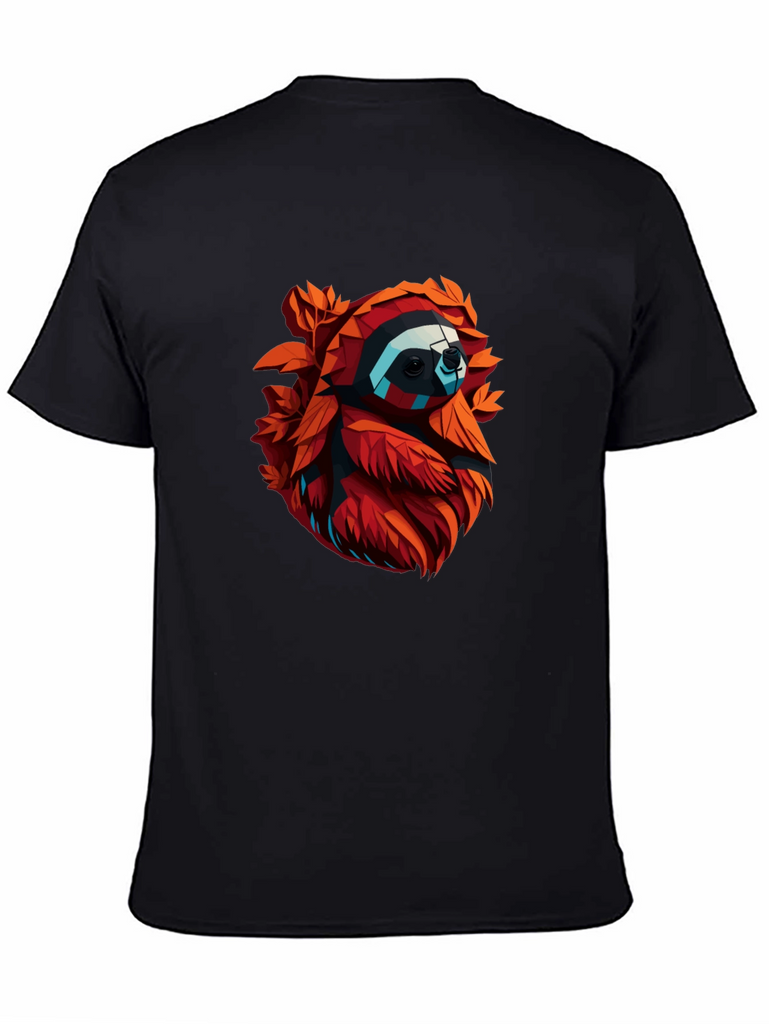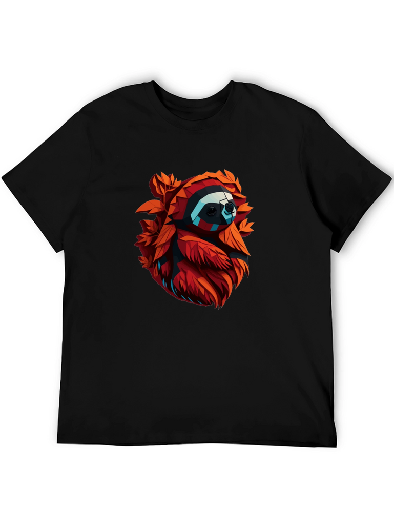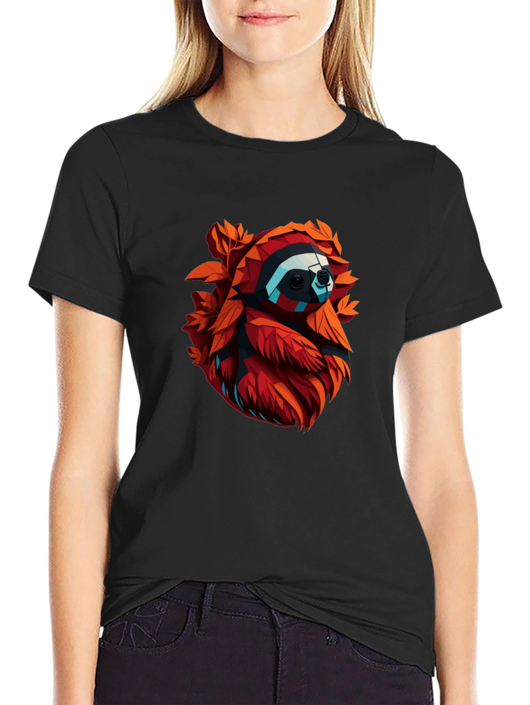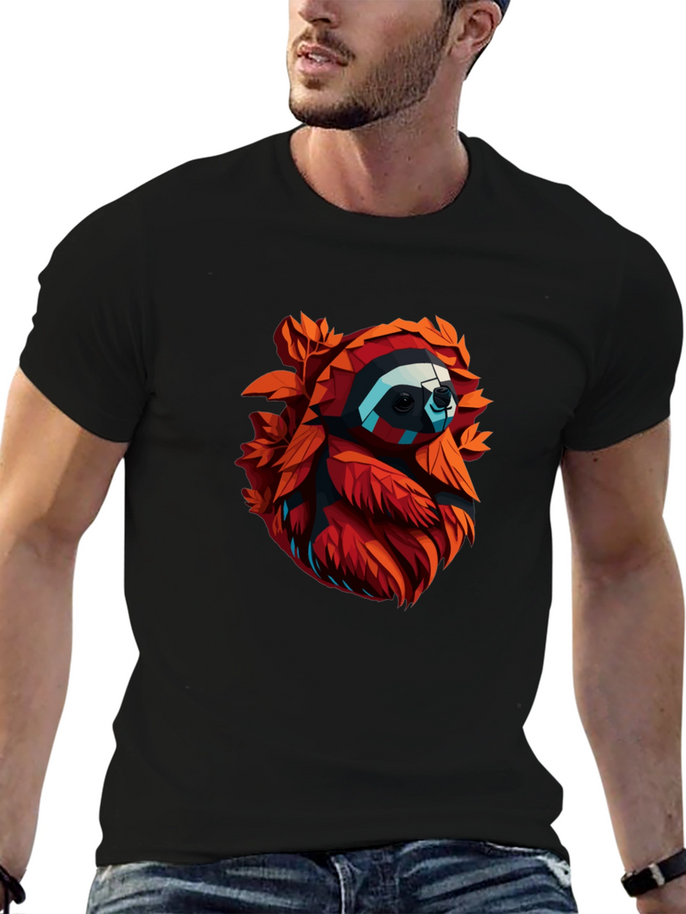 This stylish black t-shirt features a captivating geometric sloth design in vibrant shades of red and orange. The unique, artistic rendering of the sloth surrounded by leaves makes this tee stand out. Crafted from a comfortable, breathable fabric, this short-sleeved shirt is perfect for casual wear. The striking design is ideal for those who appreciate modern art and unique animal motifs. This tee is great for everyday use, whether you're heading to a casual hangout, running errands, or just relaxing at home. It's a fun and fashionable way to express your personality.