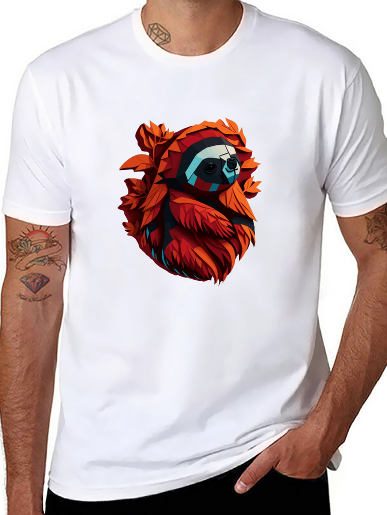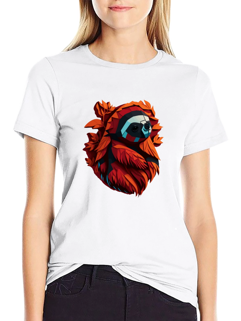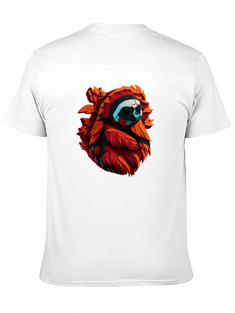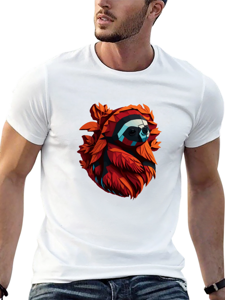 This stylish black t-shirt features a captivating geometric sloth design in vibrant shades of red and orange. The unique, artistic rendering of the sloth surrounded by leaves makes this tee stand out. Crafted from a comfortable, breathable fabric, this short-sleeved shirt is perfect for casual wear. The striking design is ideal for those who appreciate modern art and unique animal motifs. This tee is great for everyday use, whether you're heading to a casual hangout, running errands, or just relaxing at home. It's a fun and fashionable way to express your personality.