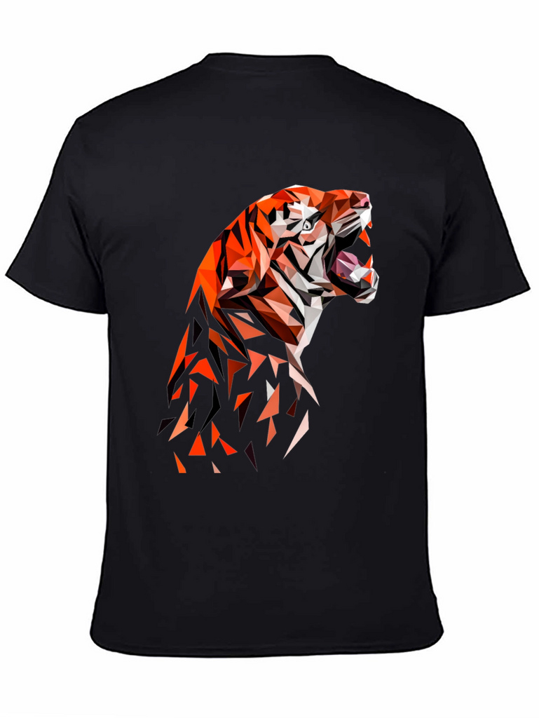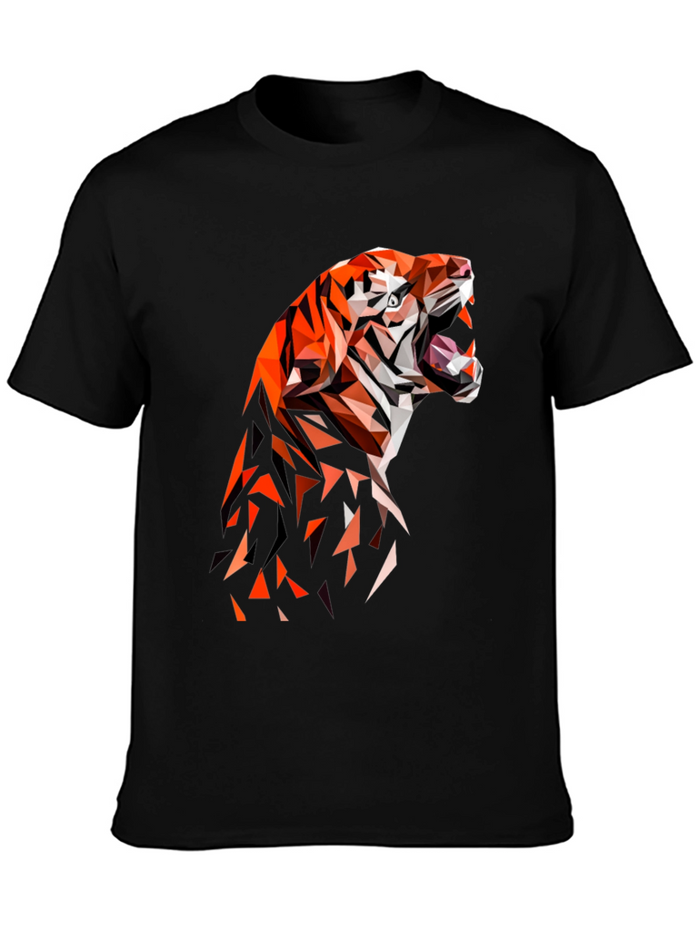 Roar into style with this striking black T-shirt featuring a bold, geometric tiger graphic. The eye-catching design showcases a tiger's head in a modern, polygonal style, rendered in shades of orange and white, creating a visually stunning contrast against the dark background. Made from comfortable, breathable fabric, this tee is perfect for casual wear, making a statement wherever you go. Whether you're looking to add some edge to your everyday wardrobe or want to express your wild side, this tiger graphic T-shirt is the perfect choice. Its unique design makes it a great conversation starter and a standout piece.