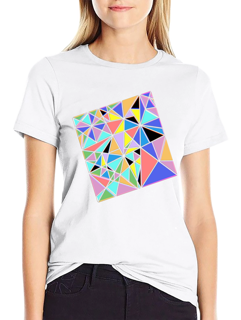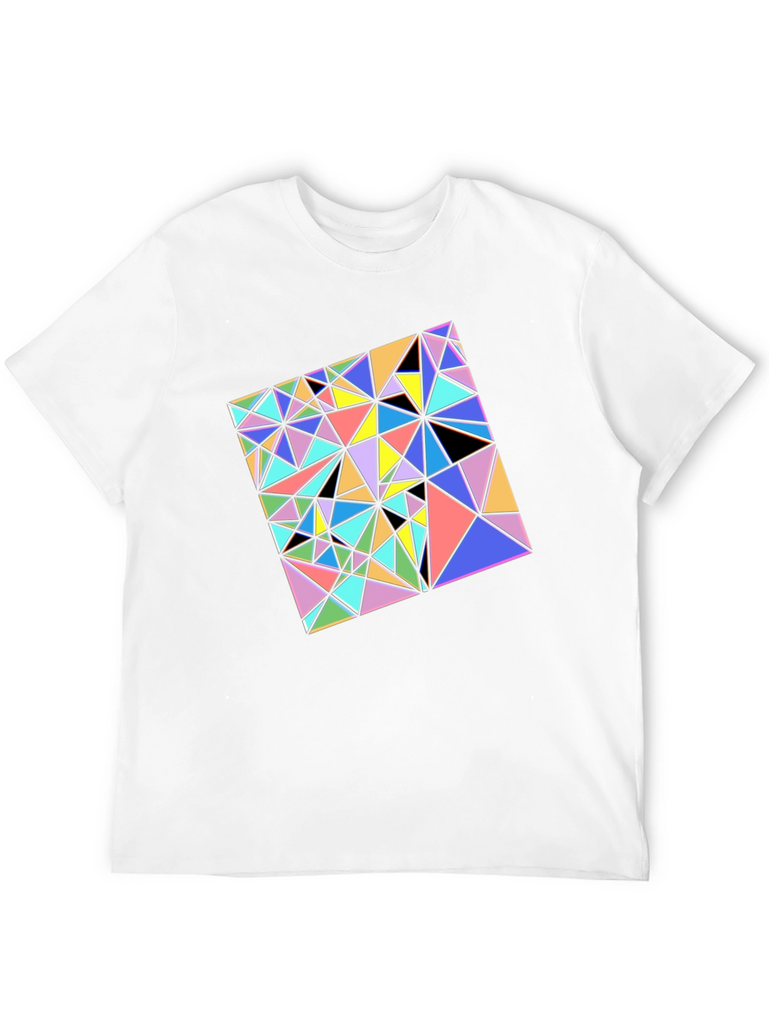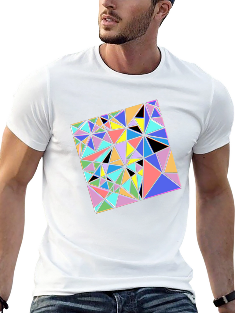 Showcase your unique style with this striking black t-shirt. The tee features a bold, eye-catching geometric design comprised of colorful triangles. The pattern boasts a vibrant palette, including shades of pink, purple, yellow, blue, and green, creating a visually appealing and modern aesthetic. Made from a comfortable, breathable fabric, this t-shirt is perfect for casual wear. Pair it with jeans, shorts, or even dress it up with a blazer for a trendy look. This tee is an ideal choice for expressing your individuality and adding a pop of color to your wardrobe. Makes a great gift!
