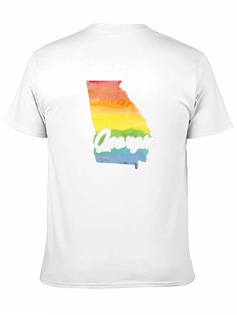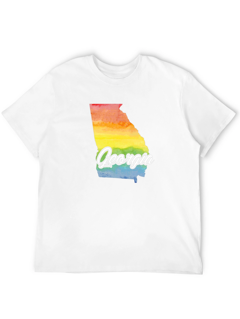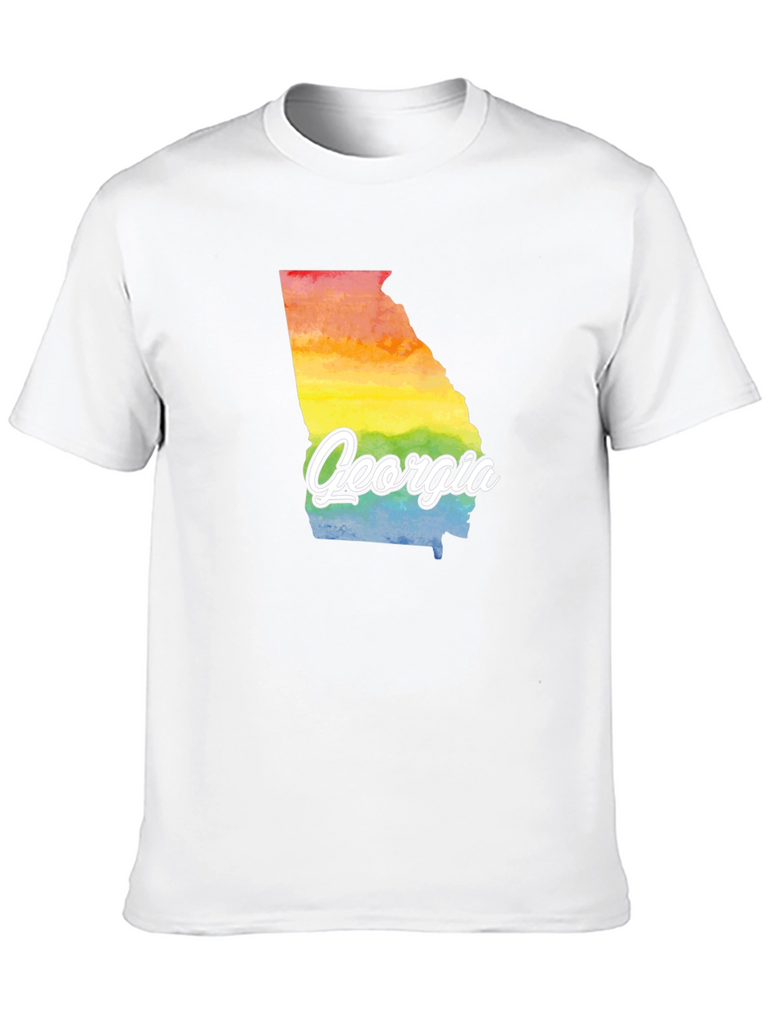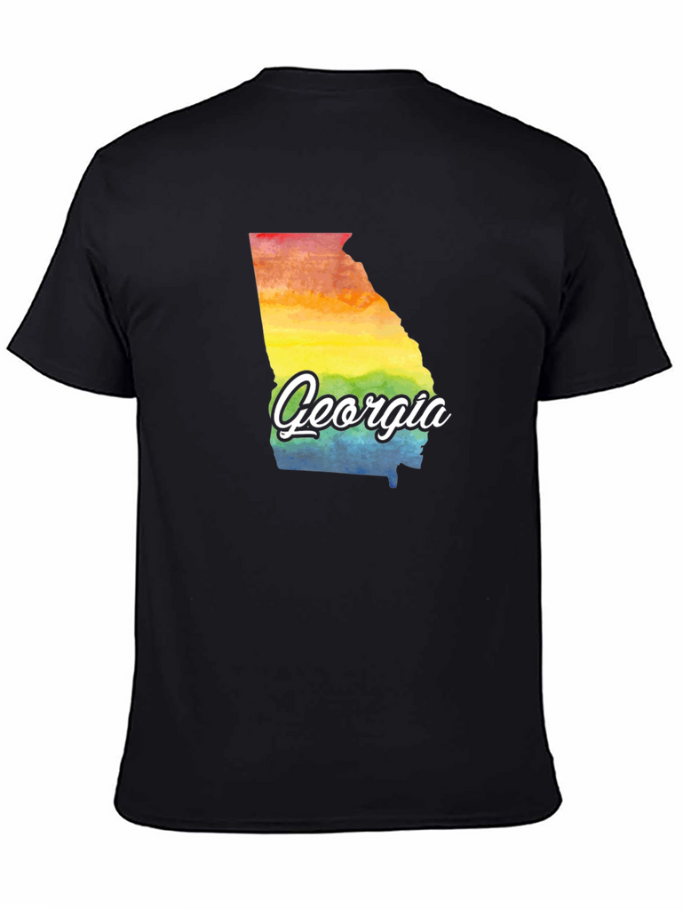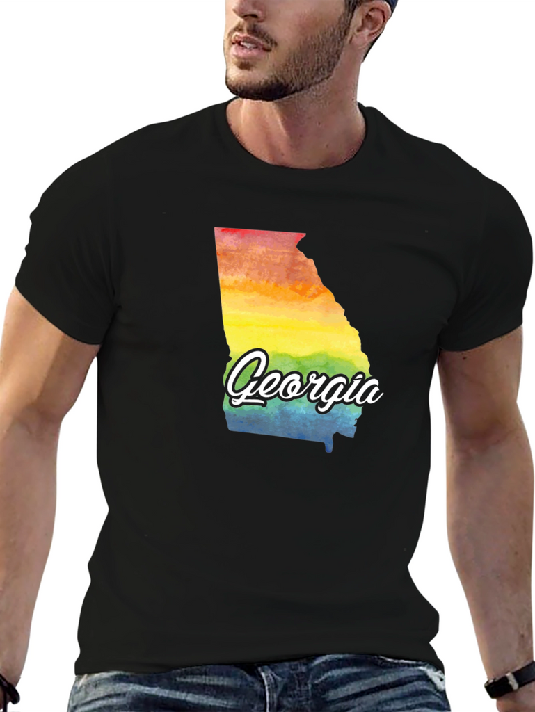 Show your state pride with this eye-catching Georgia t-shirt! The design features a vibrant, rainbow-colored graphic of the state outline, overlayed with 'Georgia' in a stylish script. This comfortable tee is ideal for casual wear, state-themed events, or as a unique souvenir. The bold graphic makes a statement, while the classic black t-shirt design ensures versatility in your wardrobe. Whether you're a Georgia native or just love the state, this t-shirt is a perfect way to show your support. It's sure to be a conversation starter!