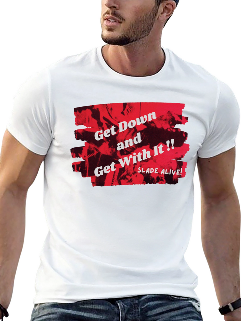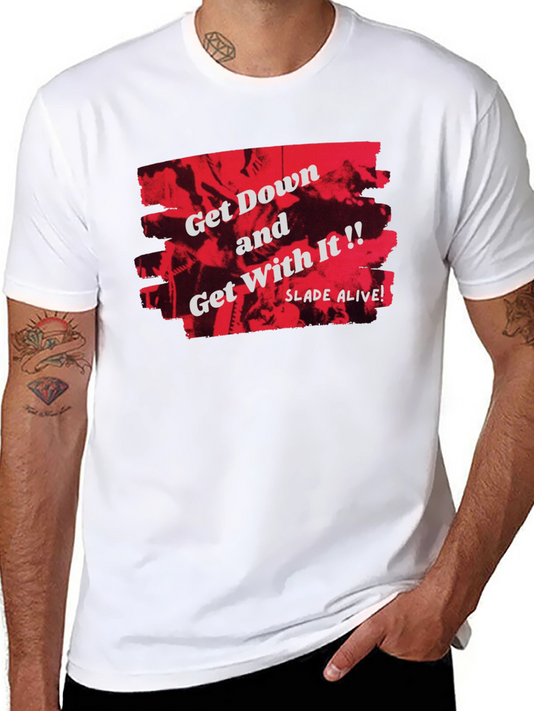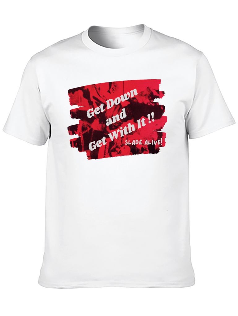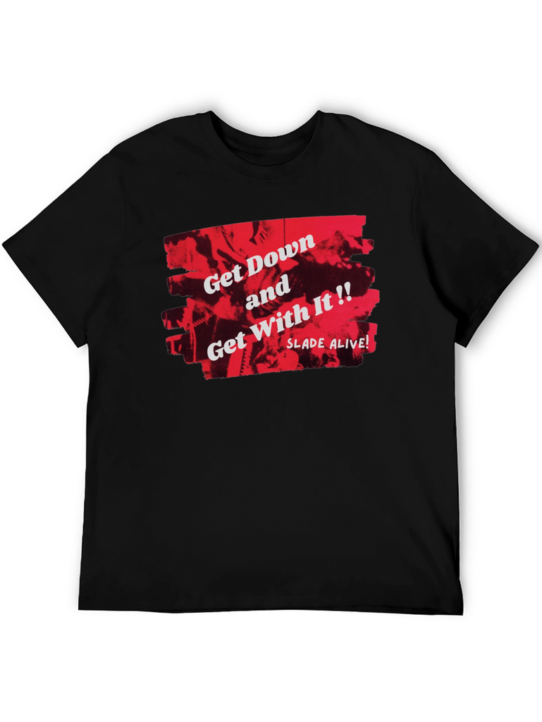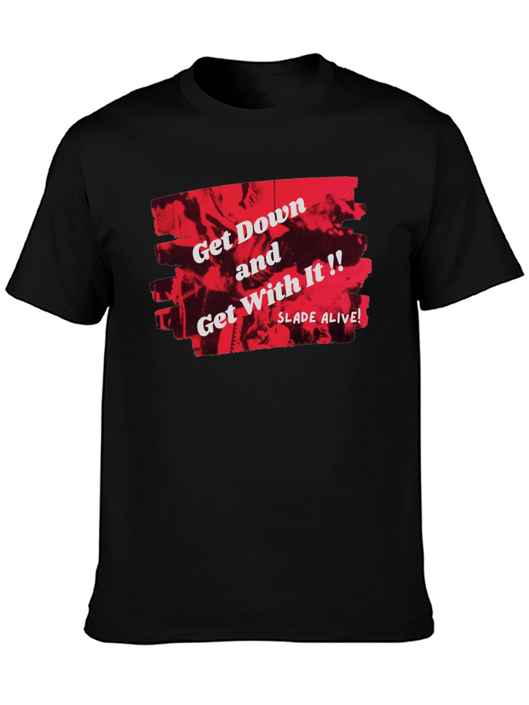 Show off your rock and roll style with this eye-catching black t-shirt. The shirt features a bold, distressed-style graphic. The graphic includes the text "Get Down and Get With It!! SLADE ALIVE!" in white against a red backdrop, creating a striking visual contrast. Made from a comfortable-looking material, this tee offers both style and ease of wear. Perfect for casual outings, concerts, or expressing your love for classic rock music. Its unique design is sure to make a statement wherever you go.