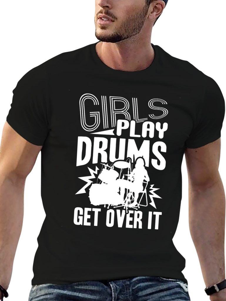 Rock out in style with this bold black t-shirt! Featuring a striking white graphic, it proudly proclaims "GIRLS PLAY DRUMS GET OVER IT". The tee showcases a silhouette of a female drummer behind her kit, surrounded by explosive energy designs. Made from a comfortable-looking fabric, this shirt is perfect for everyday wear, concerts, or expressing your passion for music. Show your support for female musicians and make a statement with this must-have tee. A great gift for drummers and music lovers!