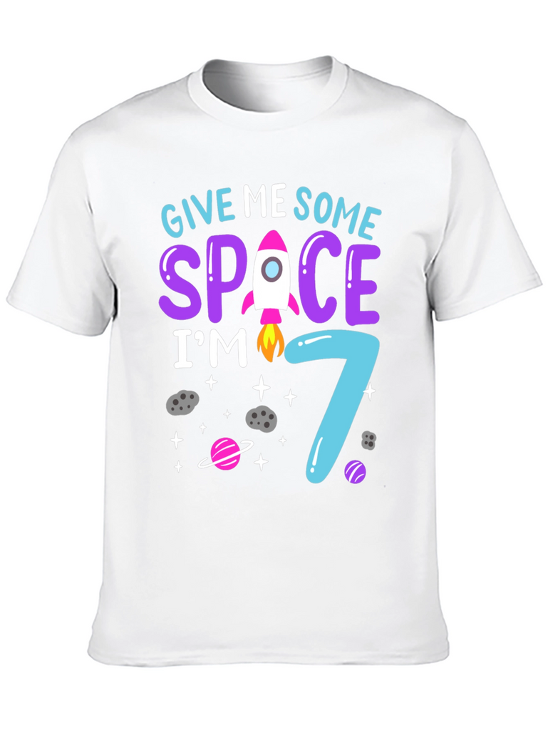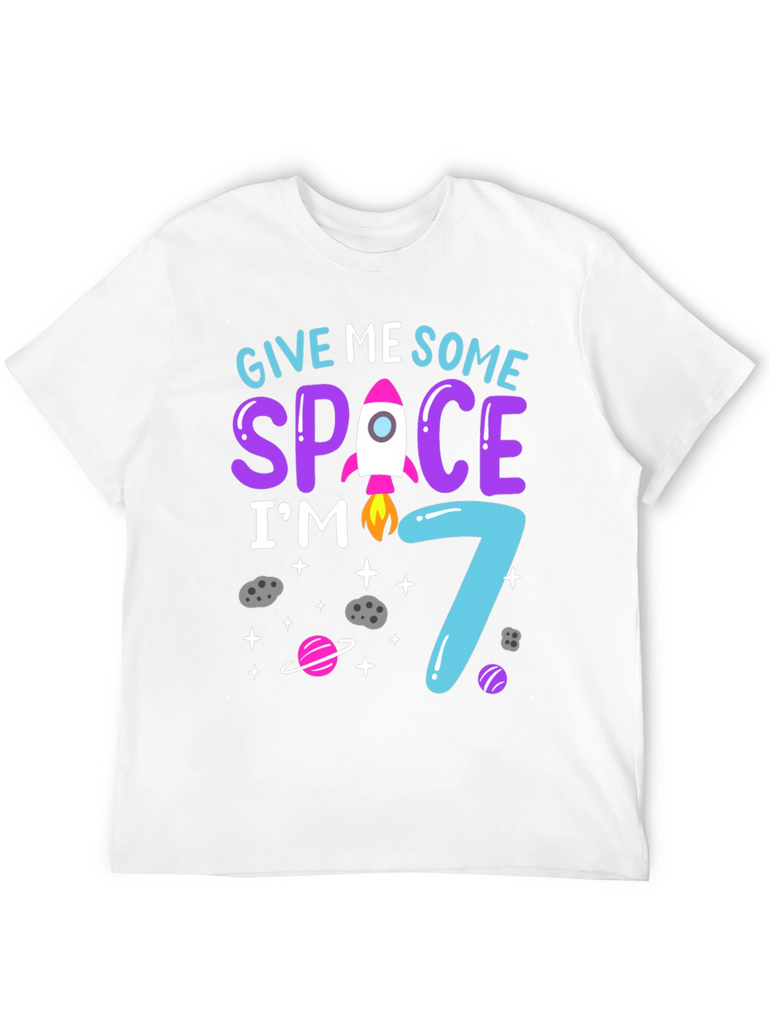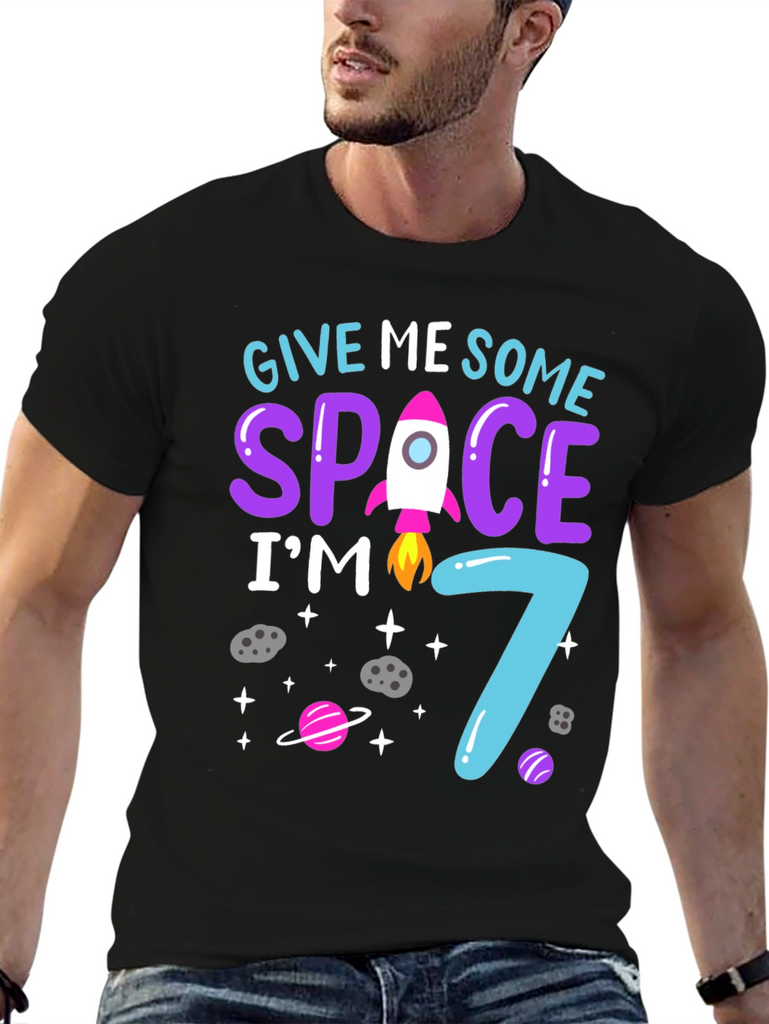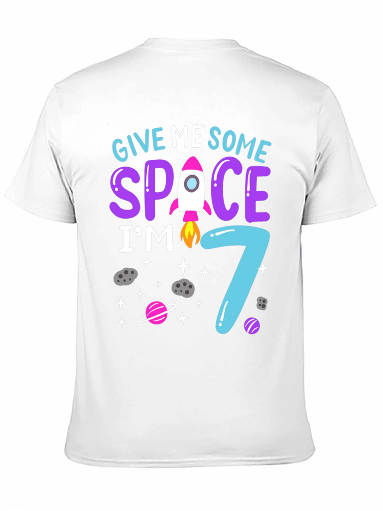 Celebrate your child's 7th birthday with this adorable space-themed t-shirt! The design features the fun phrase "Give Me Some Space I'm 7" in vibrant, eye-catching colors. A cute rocket illustration replaces the 'A' in 'SPACE', adding a playful touch. The number '7' is stylized in a bright blue that matches the other design elements. Planets and stars add to the out-of-this-world theme. This t-shirt is perfect for a birthday party, a space-themed event, or just for everyday wear to show off that your child is turning seven. The shirt appears to be made of a comfortable, breathable material.
