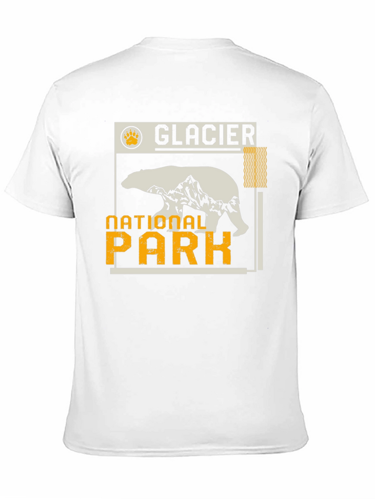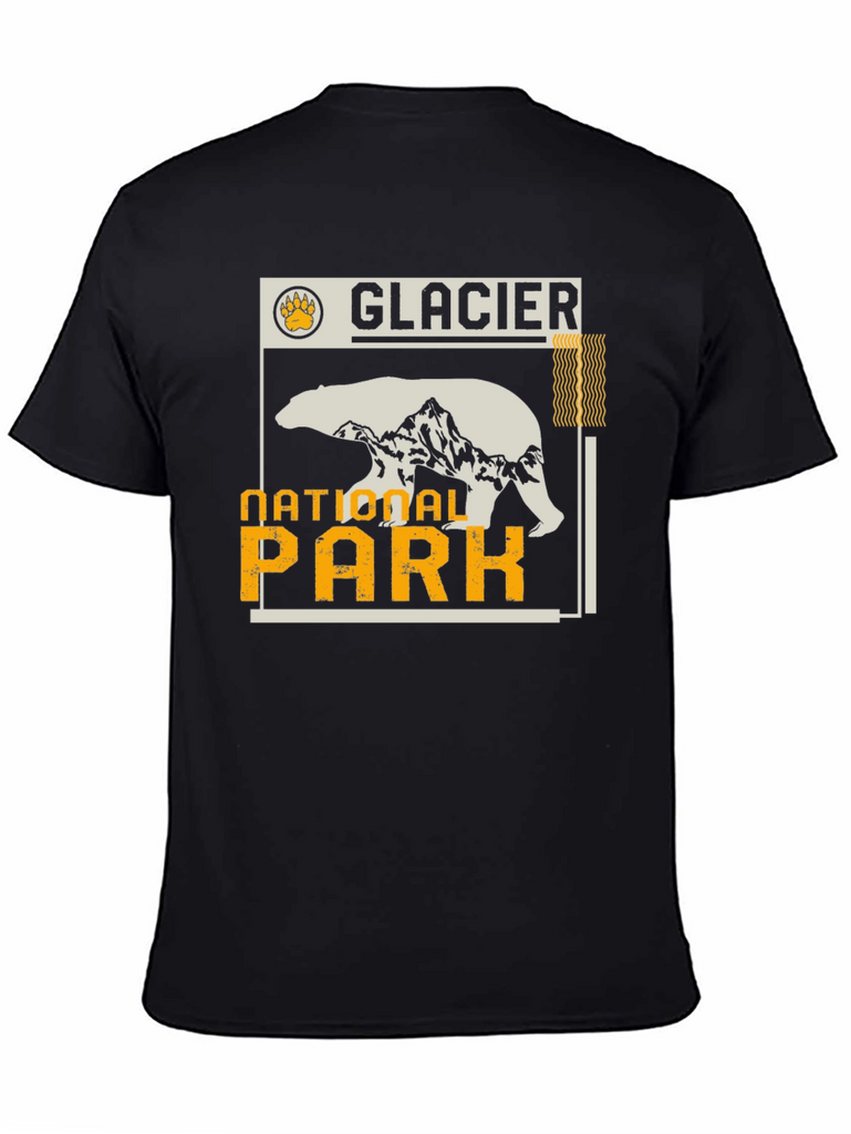 Show your love for the outdoors with this stylish black t-shirt featuring a Glacier National Park design. The graphic showcases a bear silhouette filled with mountain peaks, accented by vintage-style text and details. Made from a comfortable-looking fabric, this tee is perfect for casual wear, hiking trips, or simply expressing your appreciation for nature. The classic fit and eye-catching design make it a great addition to any wardrobe. Let everyone know of your national park passion with this great piece!
