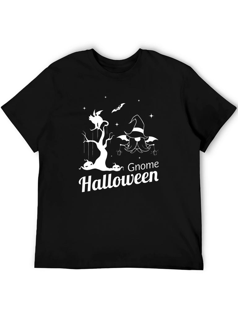 Get ready for spooky season with this unique black t-shirt featuring a whimsical 'Gnome Halloween' design. The design showcases a spooky tree, a bat, a black cat with bat wings, and a gnome wearing a witch hat complete with hanging lanterns. The print is in white, contrasting against the black background. Made from comfortable, breathable fabric, this tee is perfect for Halloween parties, casual wear, or as a fun gift for Halloween enthusiasts. A fun and stylish way to show off your love for Halloween.